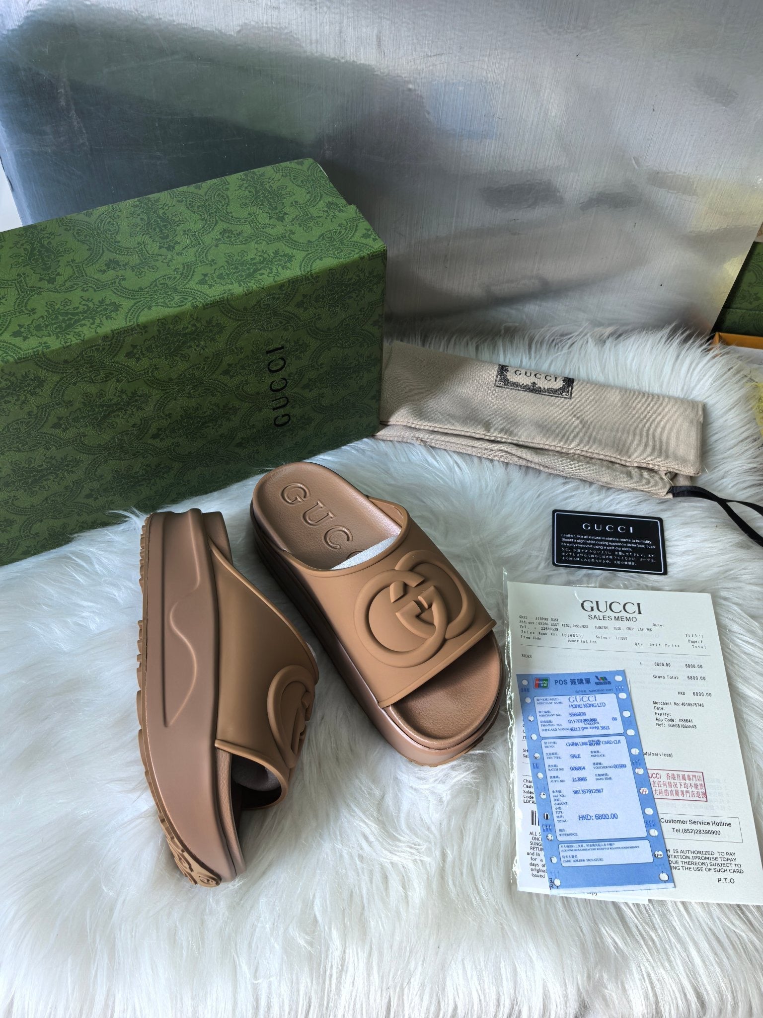GG SLIDE SANDALS IN CAMEL BROWN RUBBER EMBOSSED LOGO