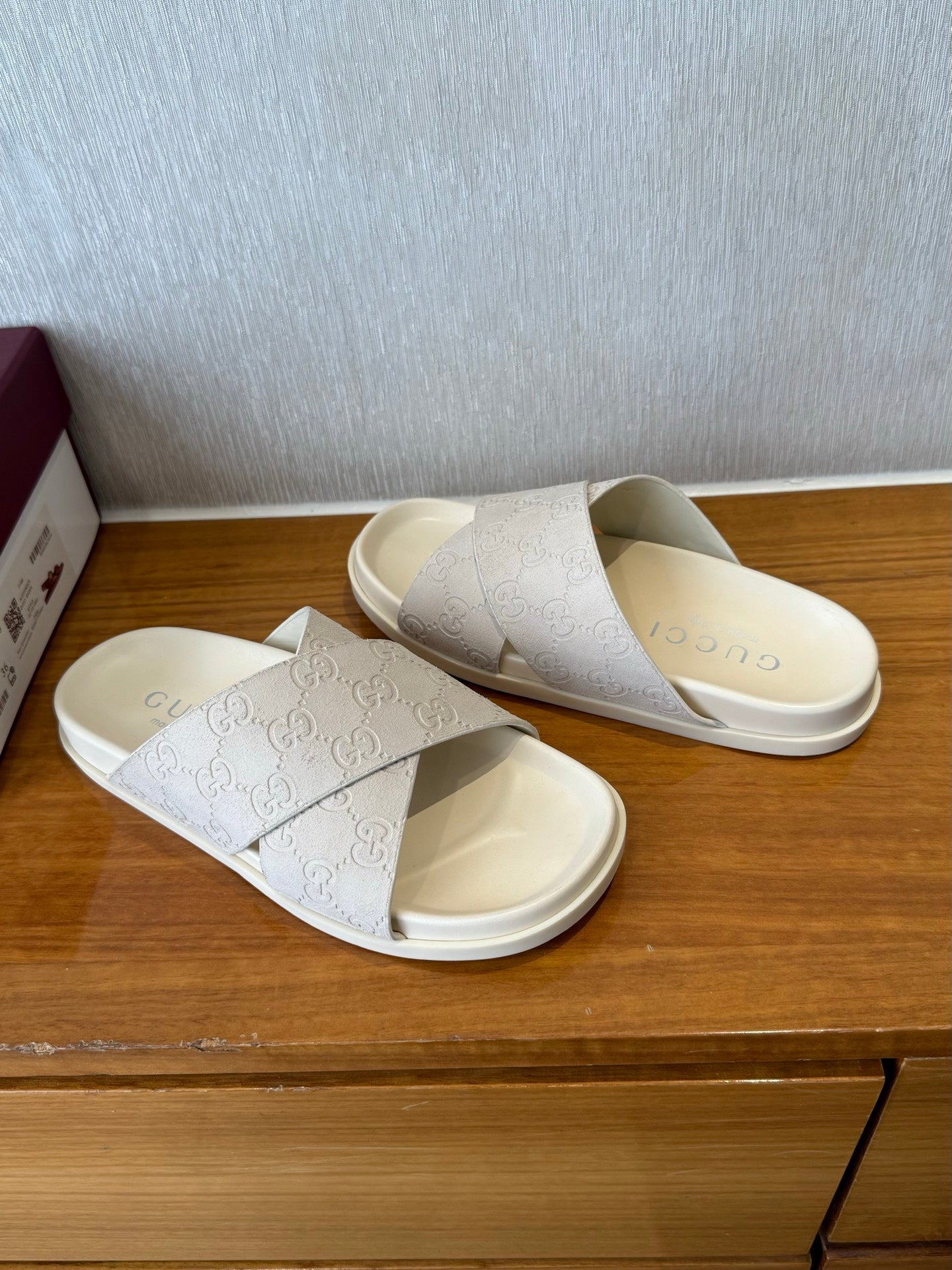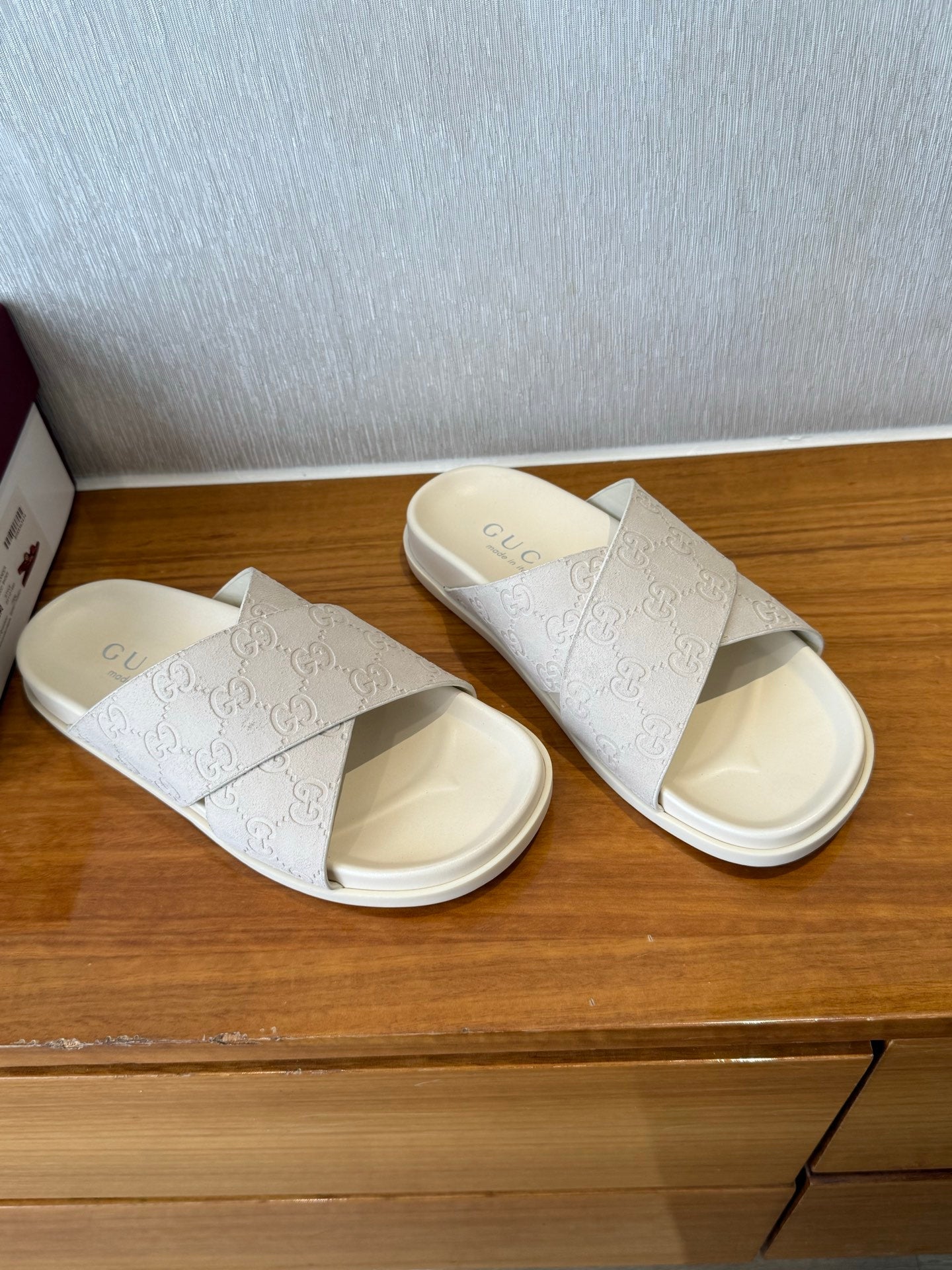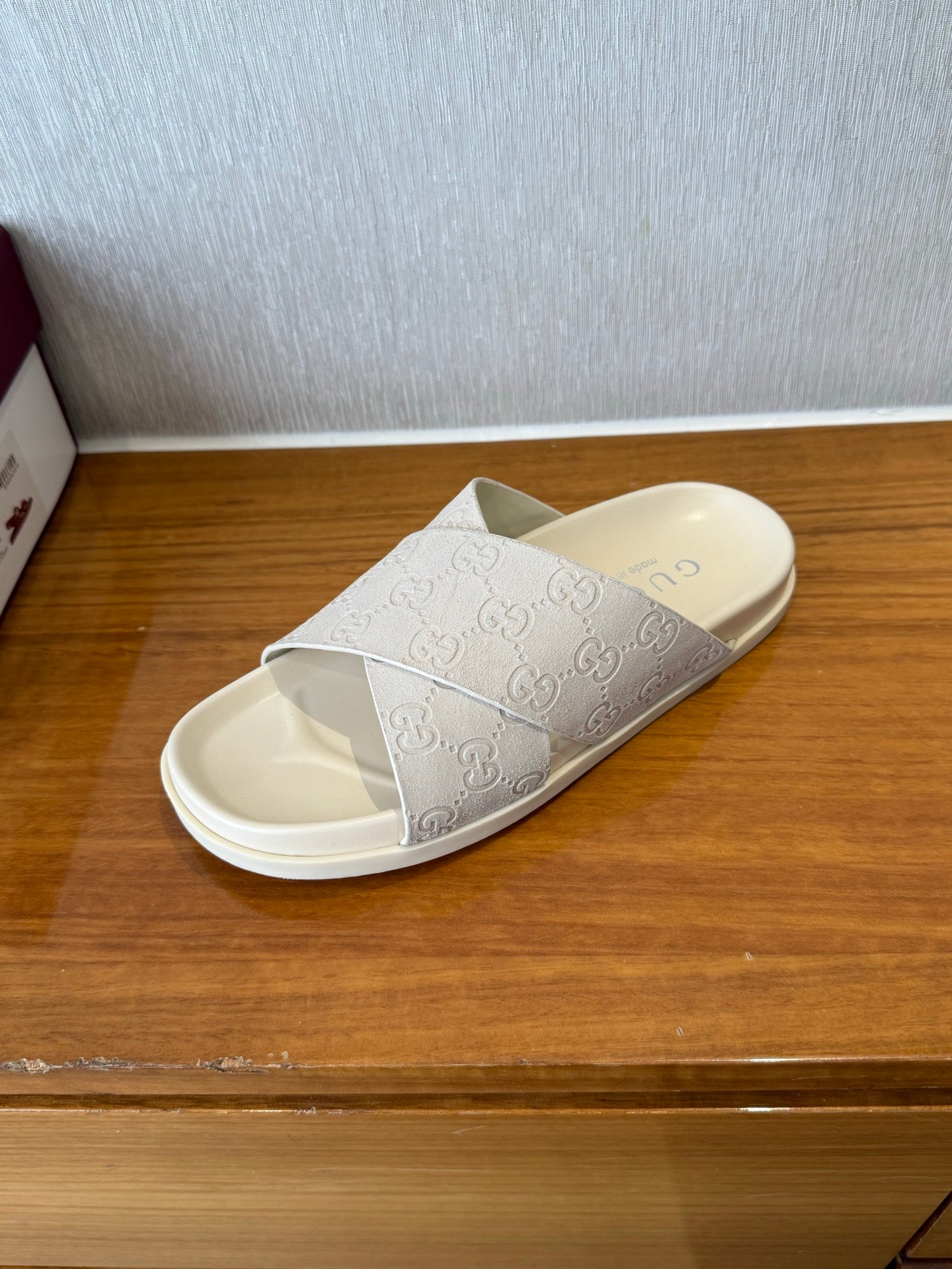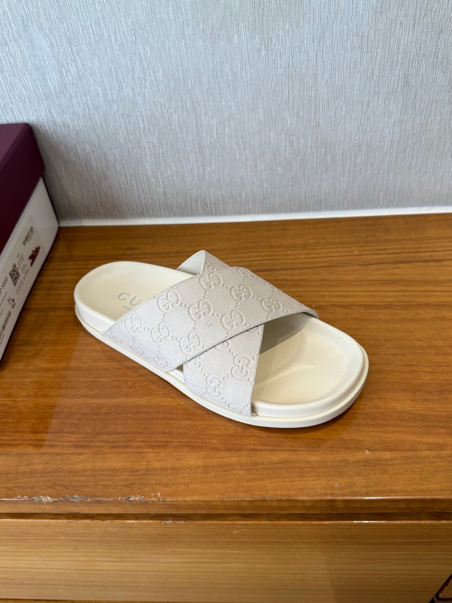 GG SLIDES X-STRAP IN WHITE SUEDE WITH EMBOSSED LOGO
