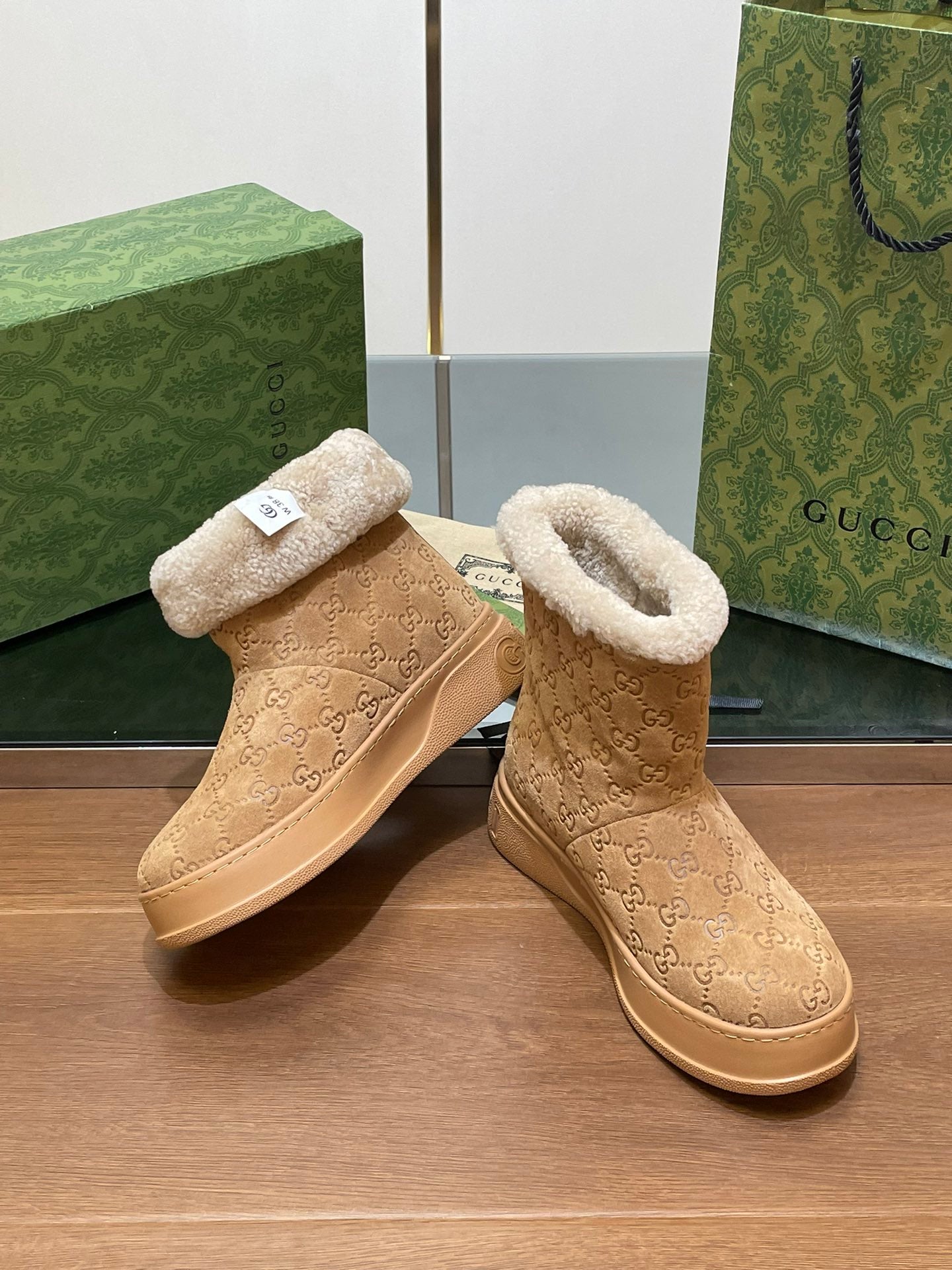 GG SNOW BOOTS IN CIDER BROWN EMBOSSED SUEDE AND BEIGE WOOL LINING