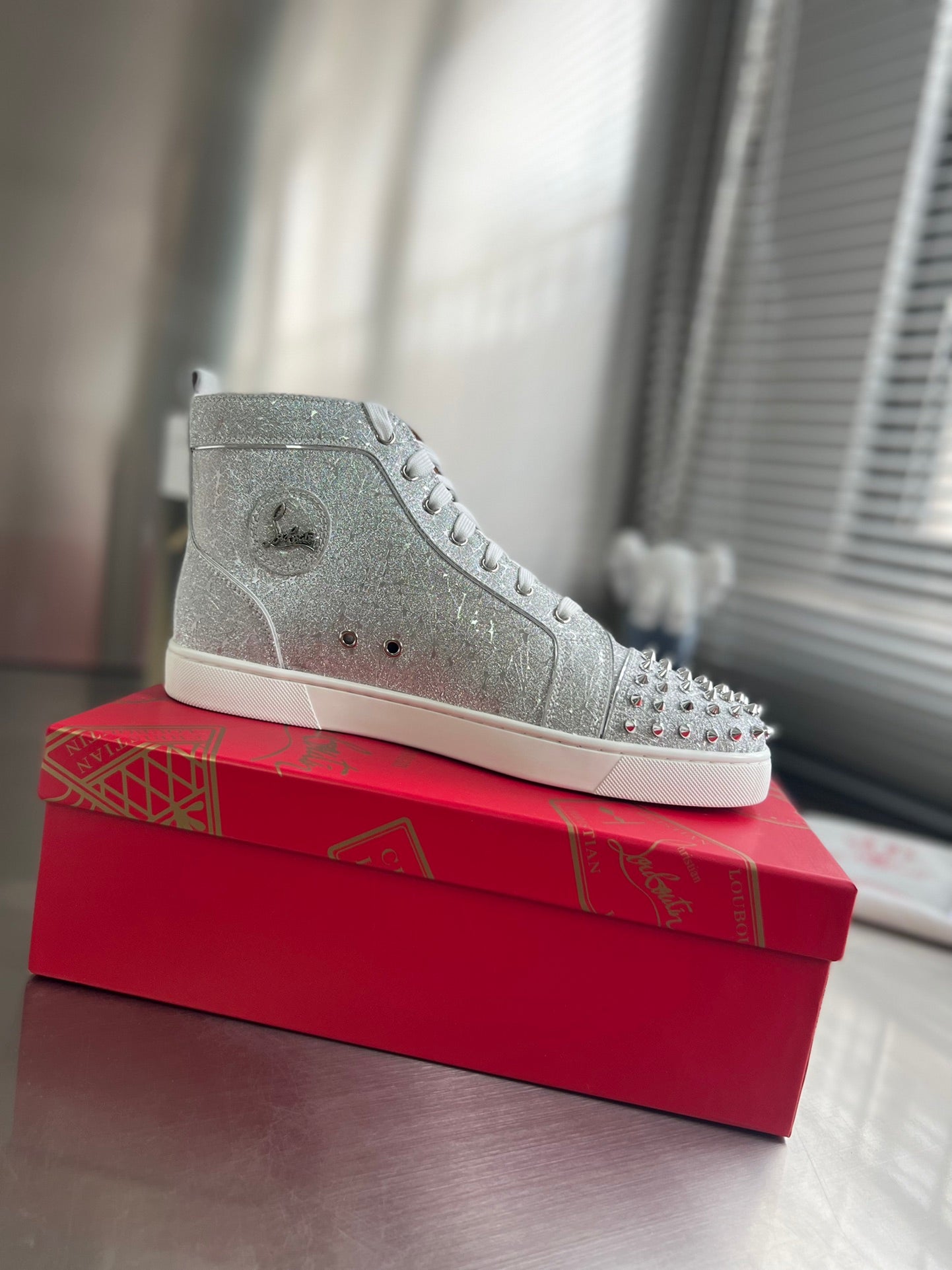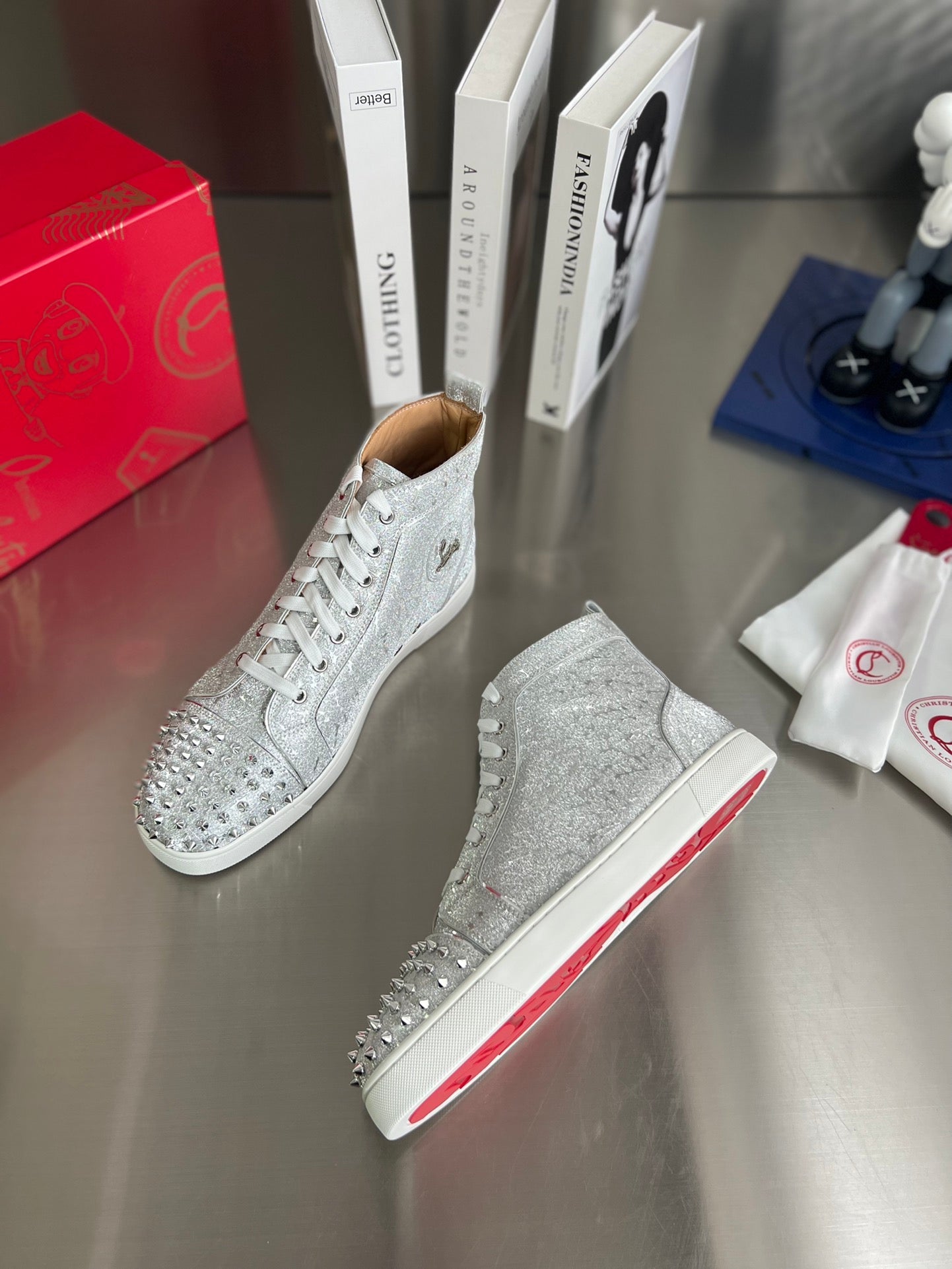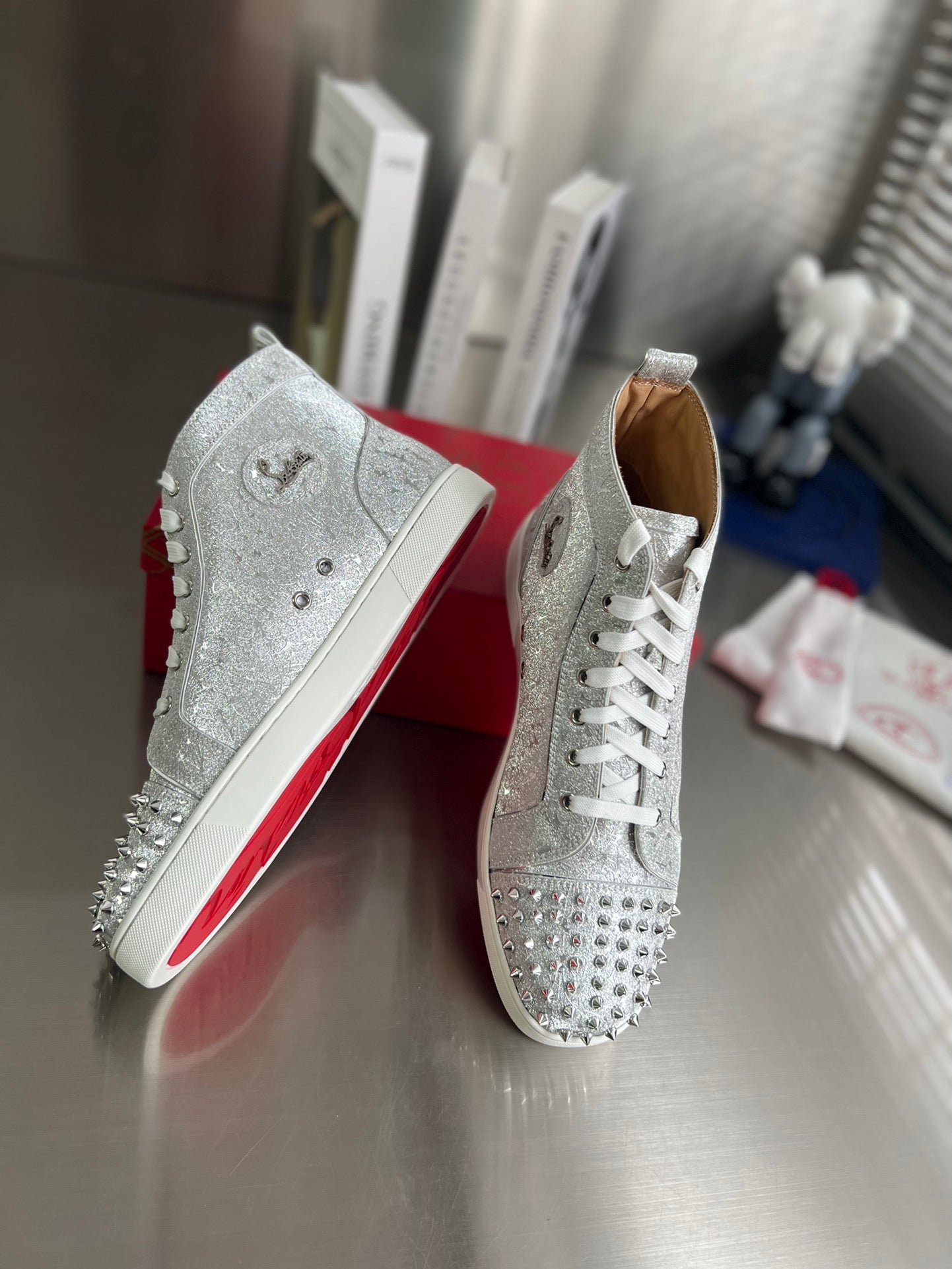GLITTER LOU SPIKES STUDDED HIGH-TOP SNEAKERS IN SILVER-TONE CALFSKIN
