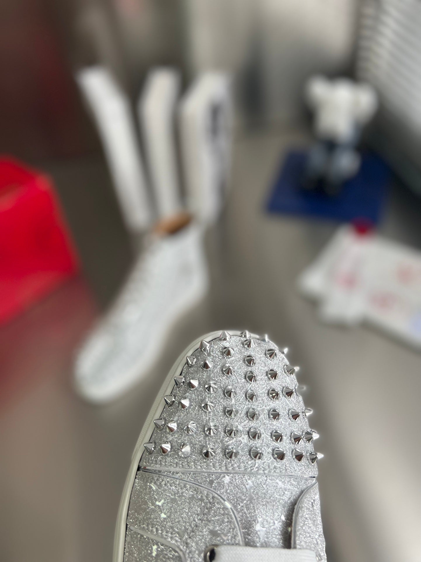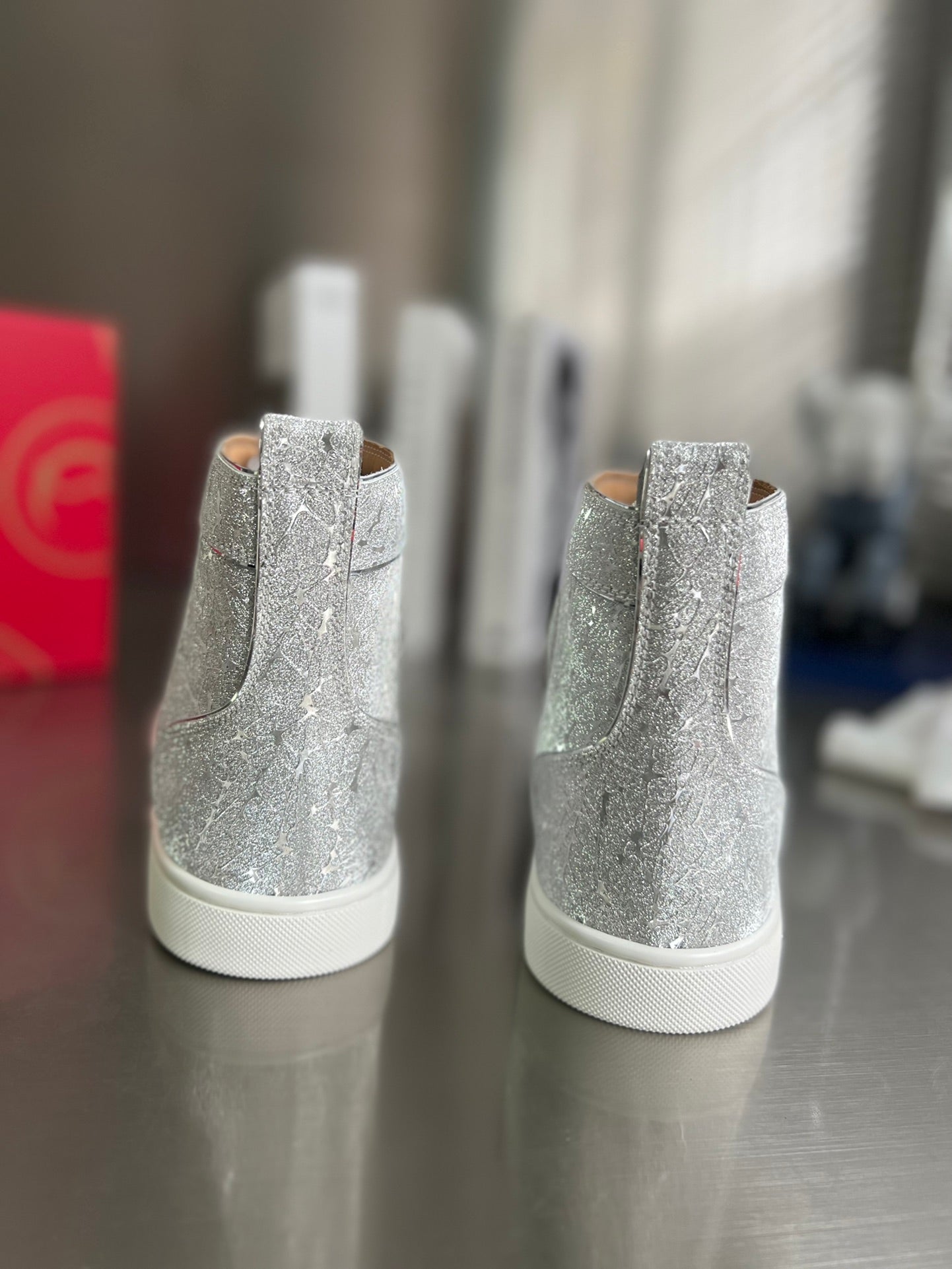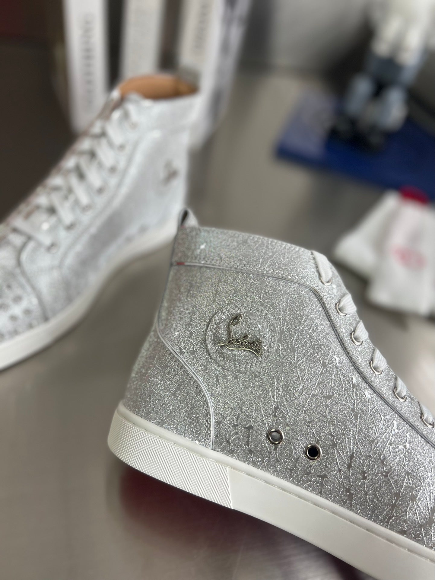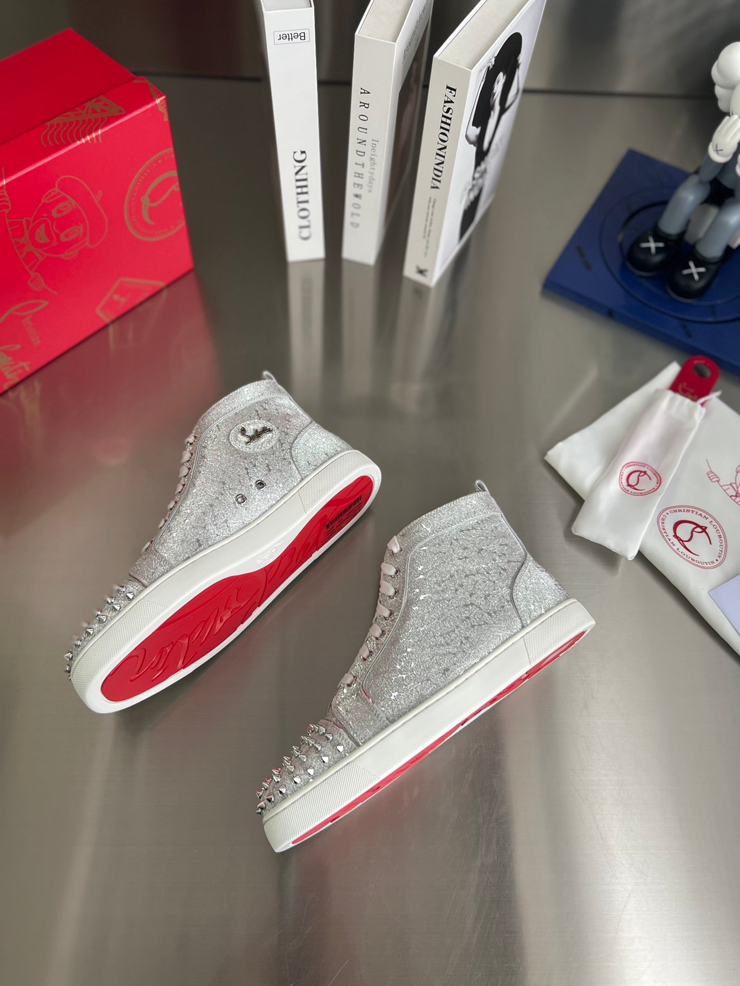 GLITTER LOU SPIKES STUDDED HIGH-TOP SNEAKERS IN SILVER-TONE CALFSKIN
