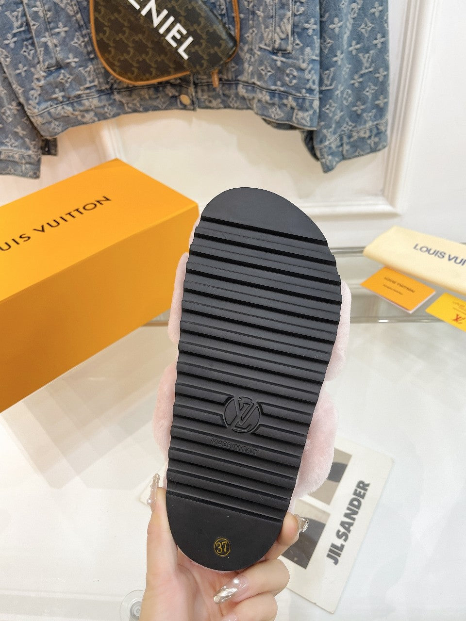 HALF MULE SLIPPERS IN LIGHT PINK FLEECE FEATURING METALLIC LOGO
