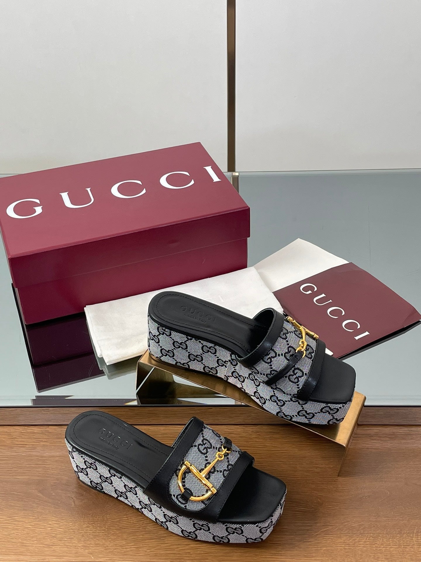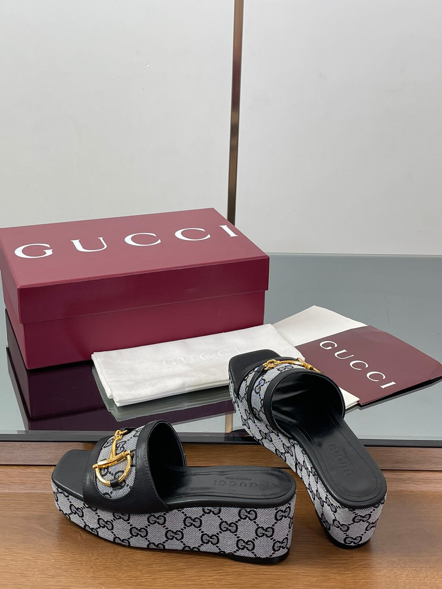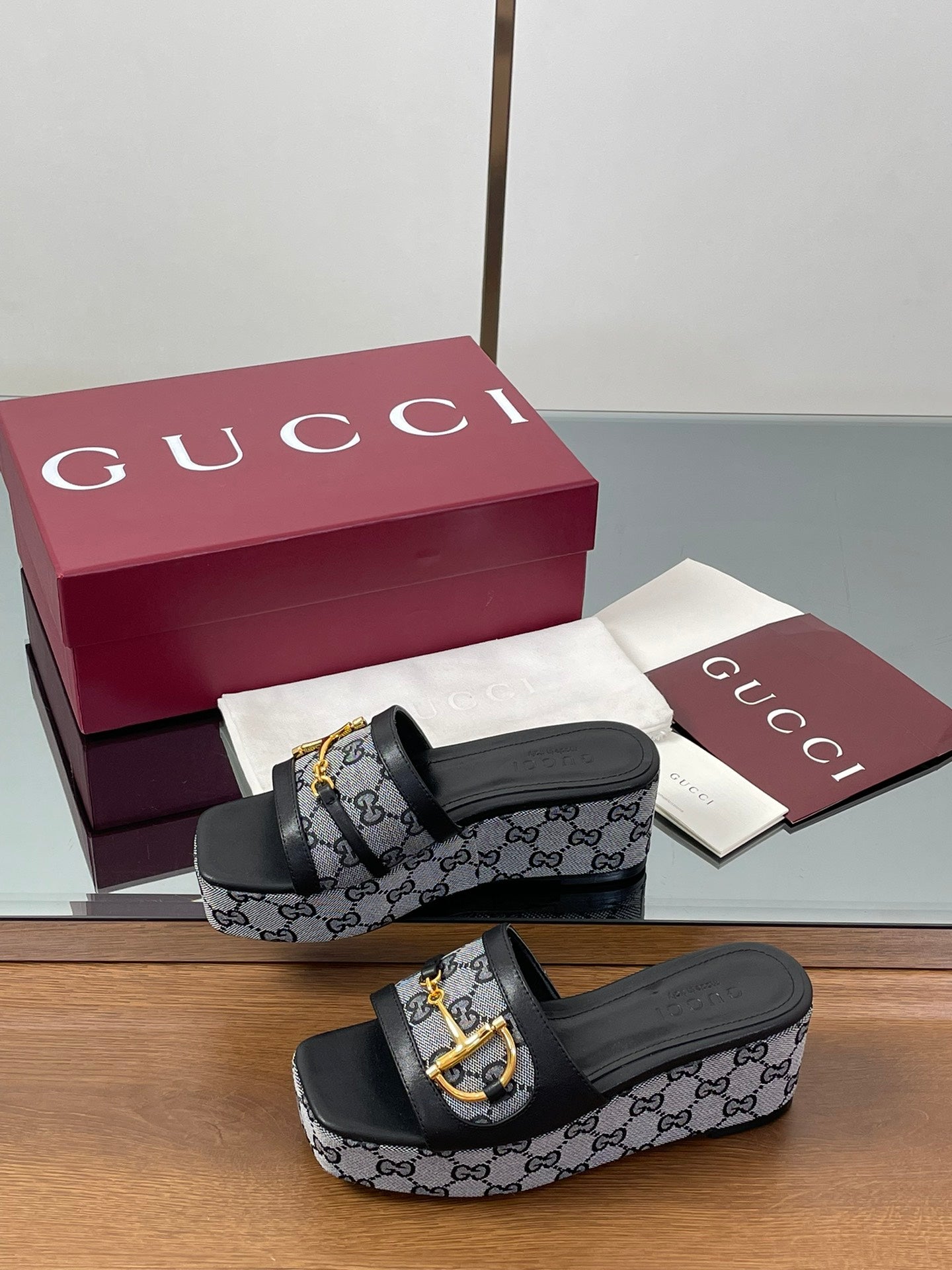 HIGH 6.3 CM WEDGE SANDALS IN BLACK CALFSKIN AND FABRIC