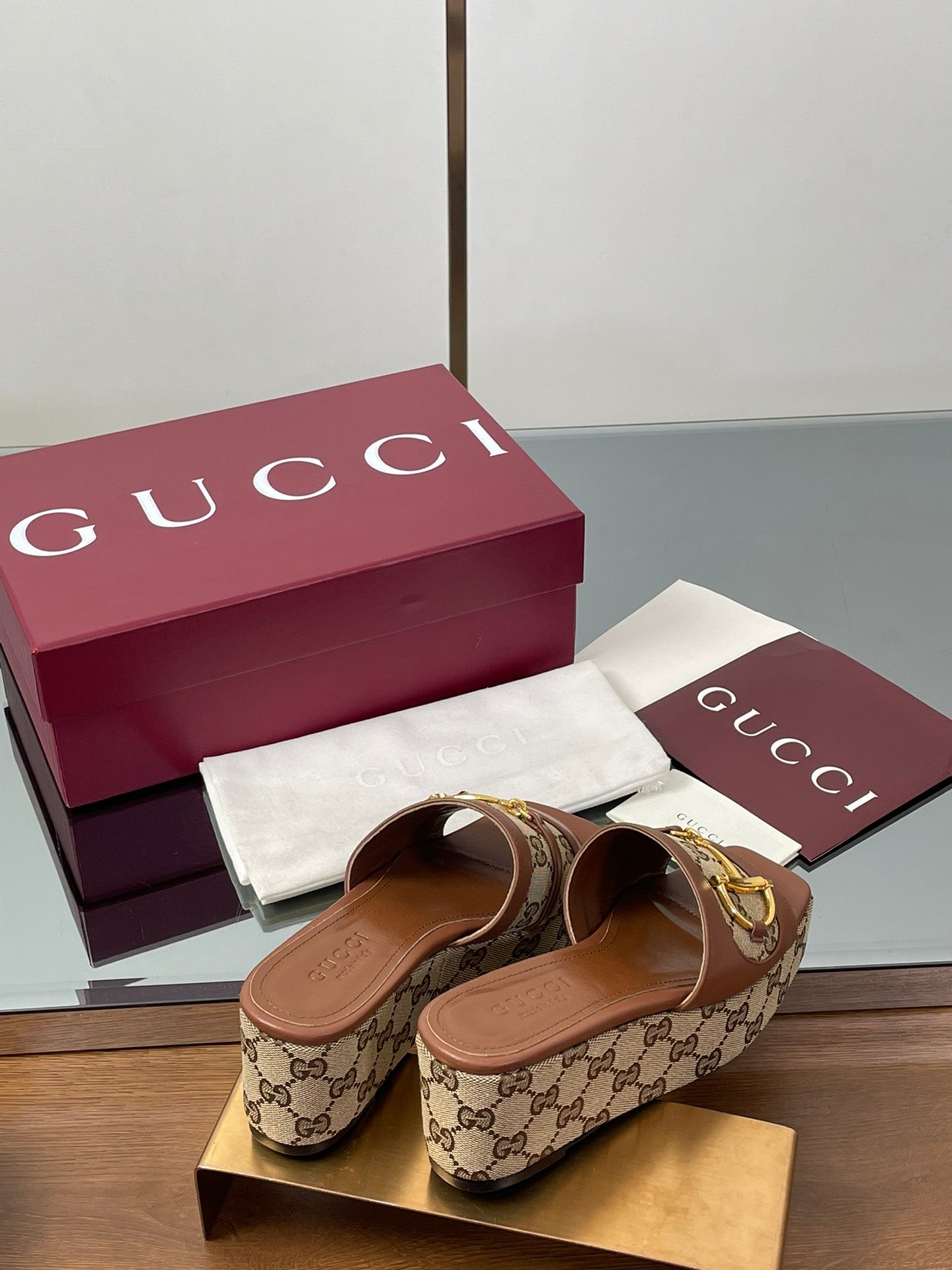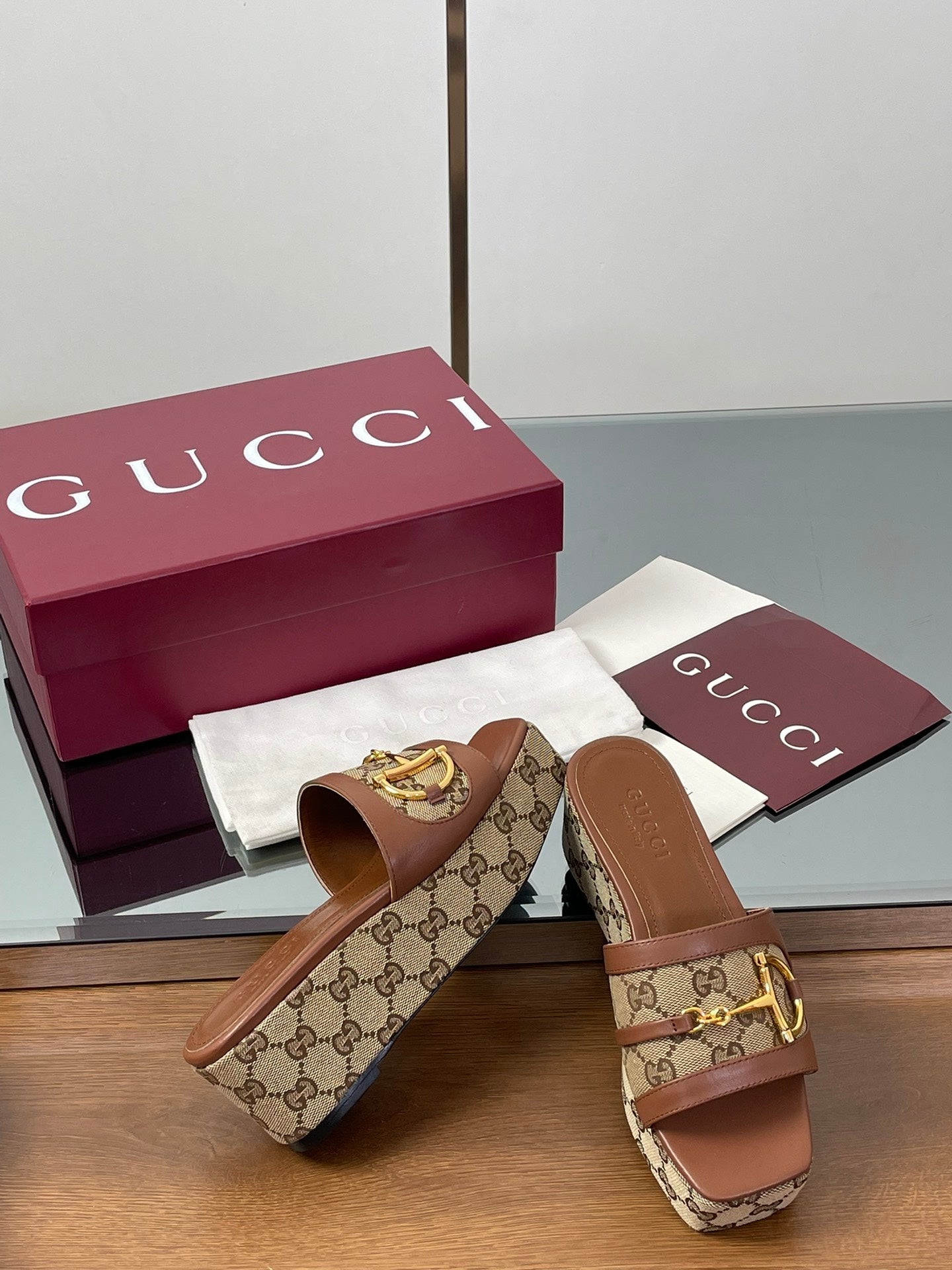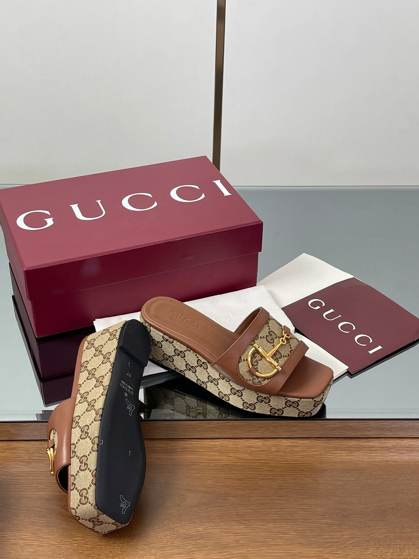 HIGH 6.3 CM WEDGE SANDALS IN BROWN CALFSKIN AND FABRIC