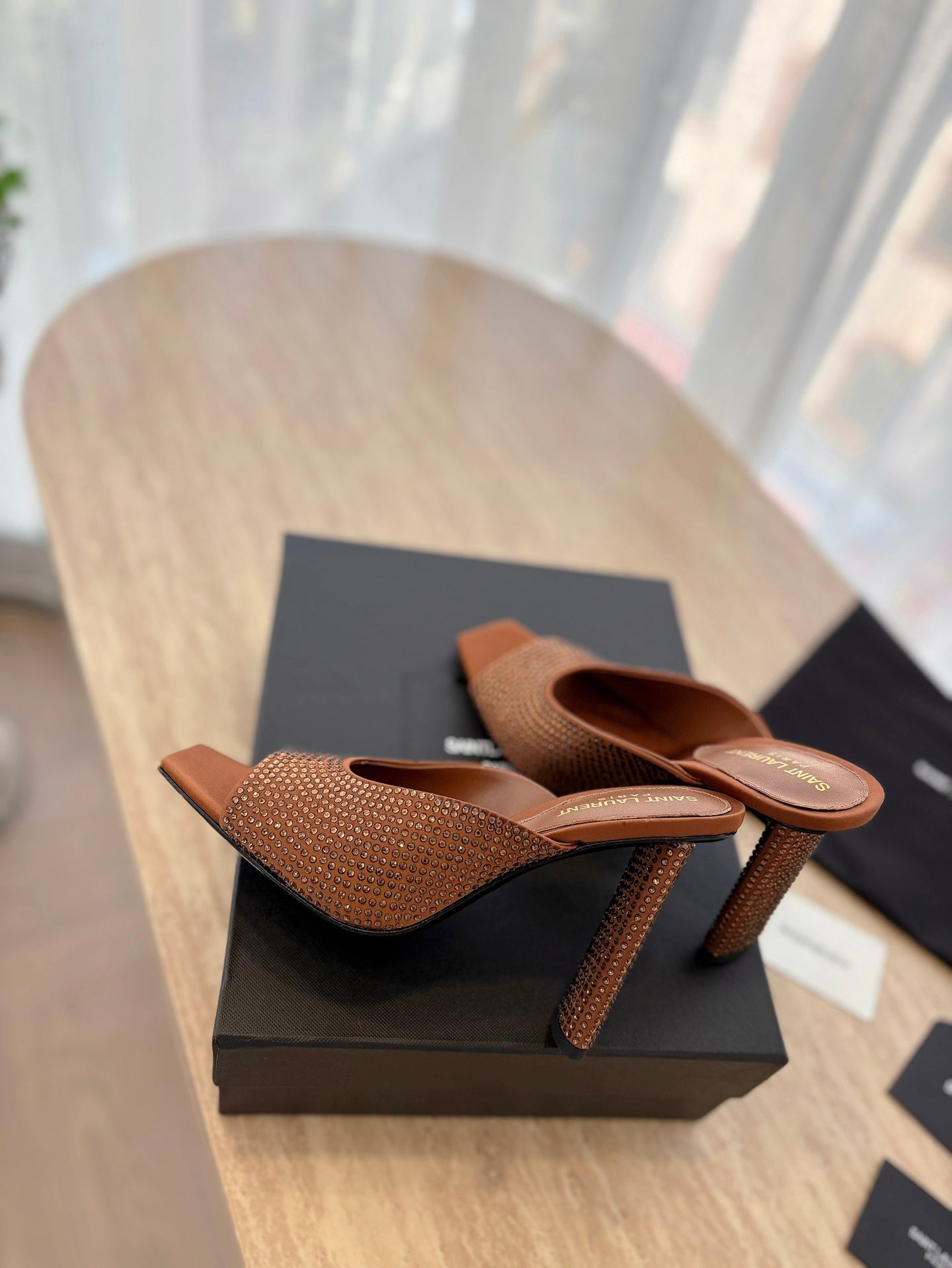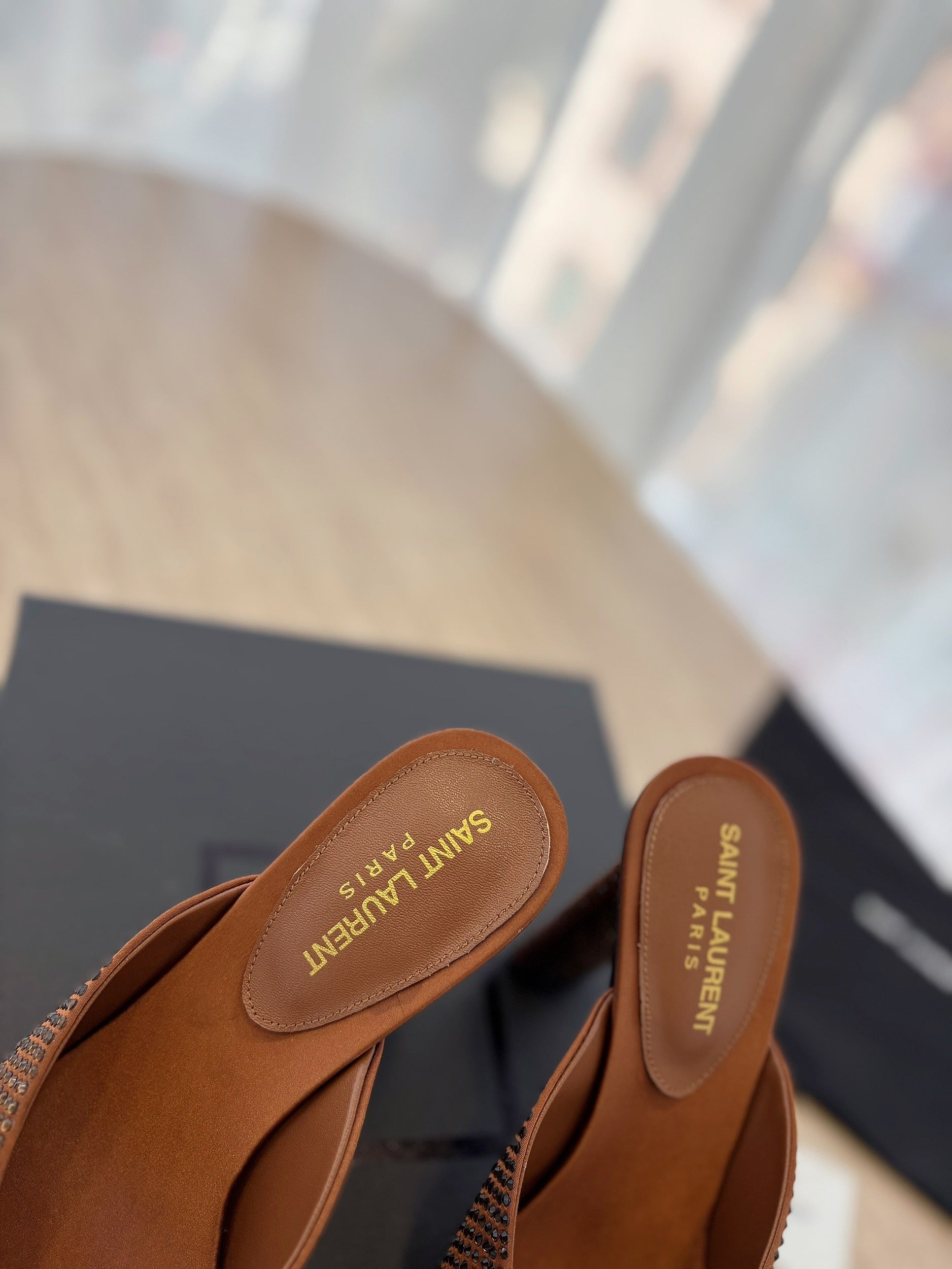 HIGH HEEL BLONDE MULE 10 CM IN BRONZE BROWN SATIN WITH RHINESTONES