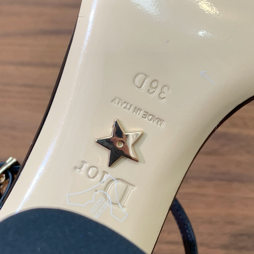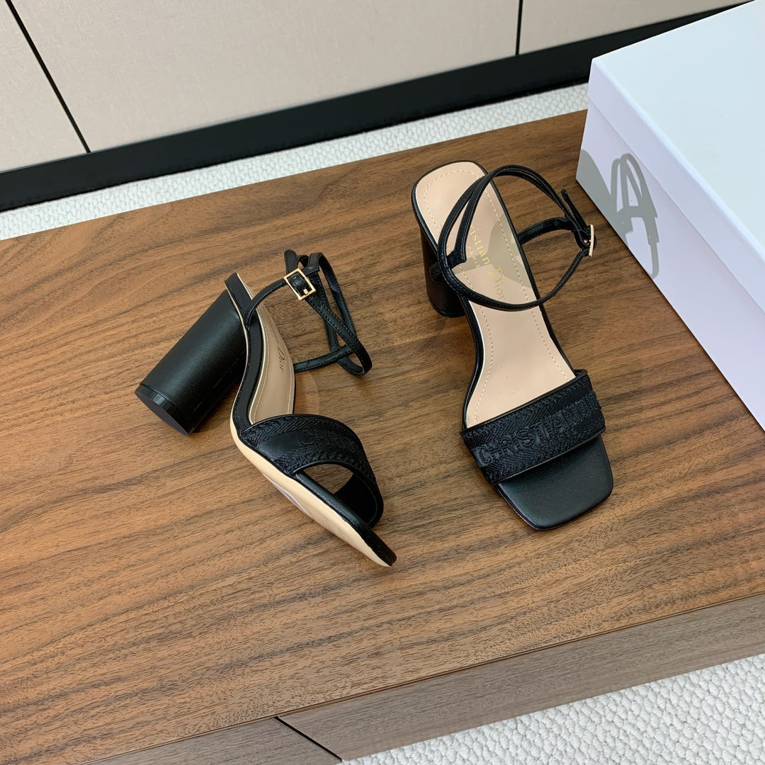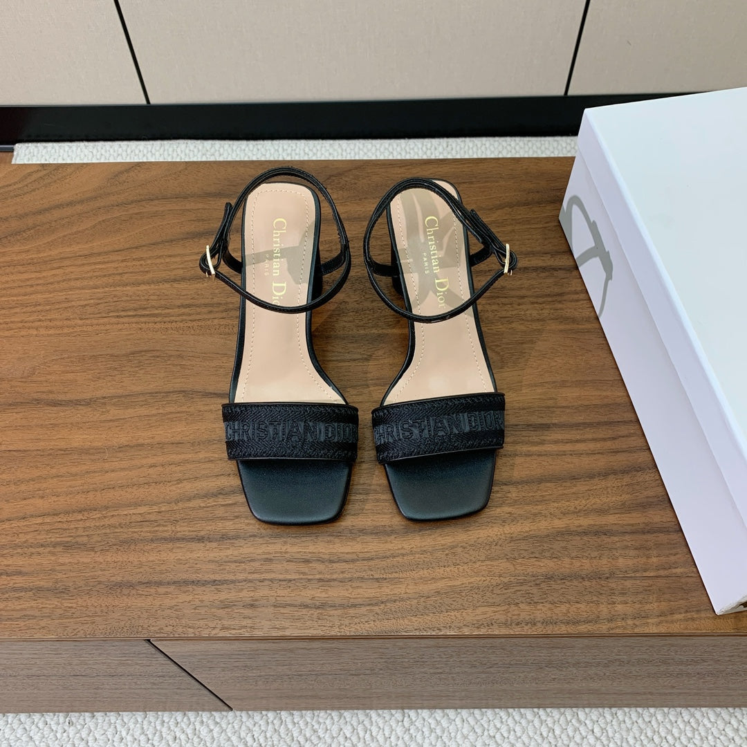 HIGH HEEL EMBROIDERED SANDAL IN BLACK CALFSKIN AND WOVEN STRAPS