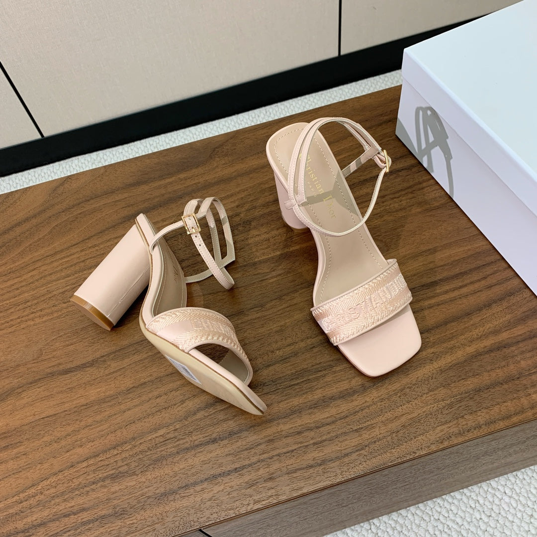 HIGH HEEL EMBROIDERED SANDAL IN LIGHT PINK CALFSKIN AND WOVEN STRAPS