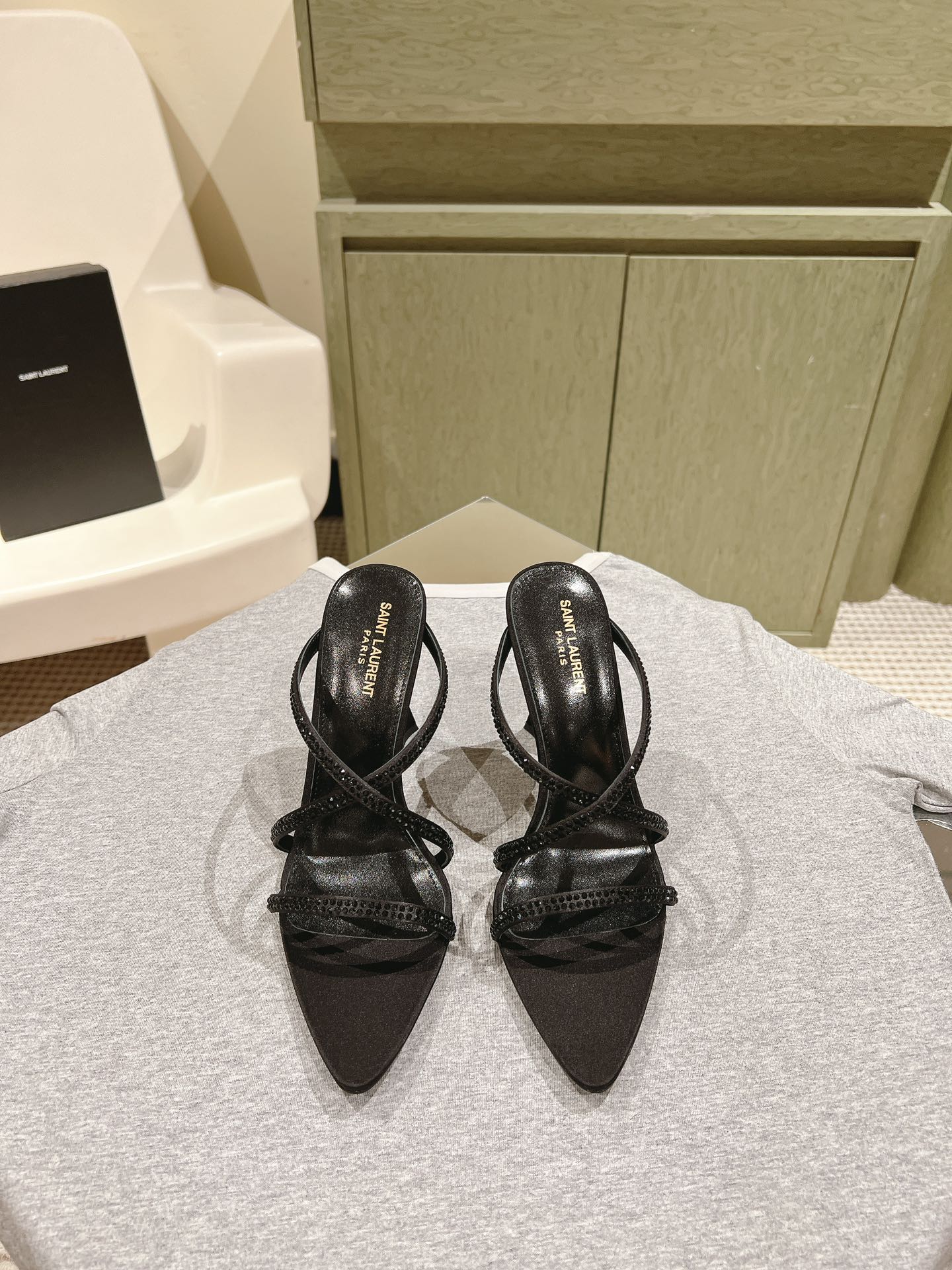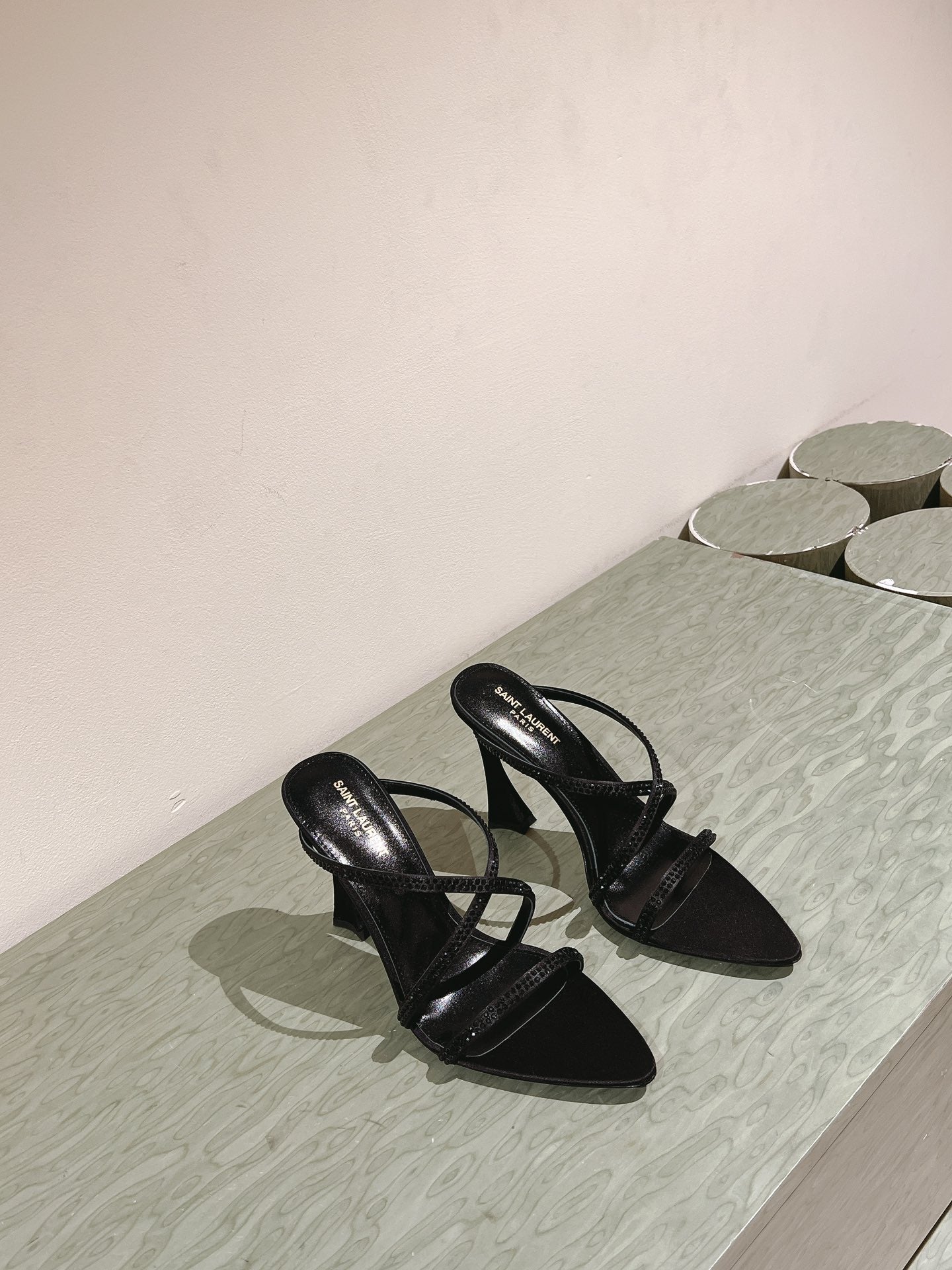 HIGH HEEL MULE 10 CM IN BLACK SATIN WITH RHINESTONES