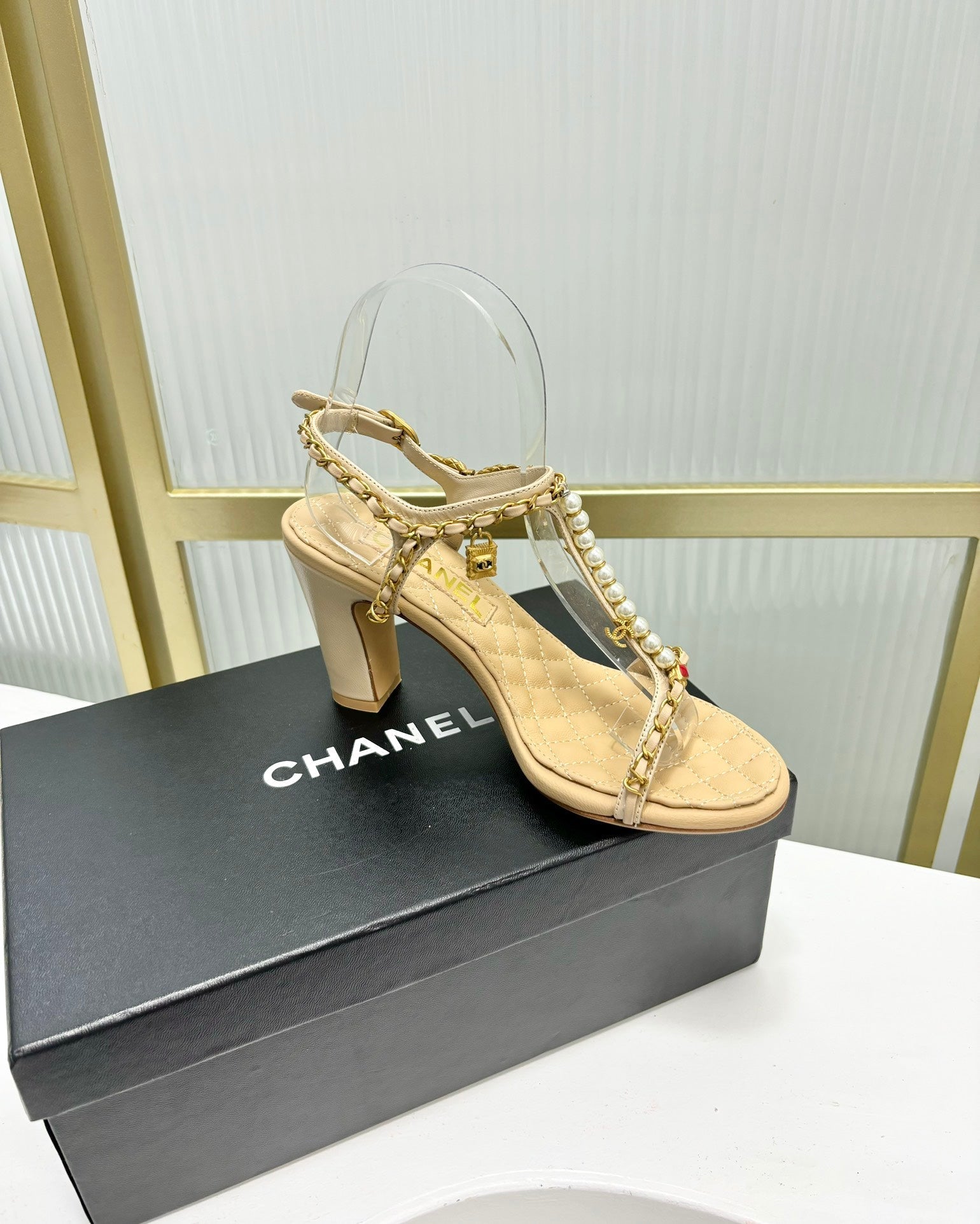 HIGH HEELS PEARL CHAIN IN BEIGE CREAM COWHIDE