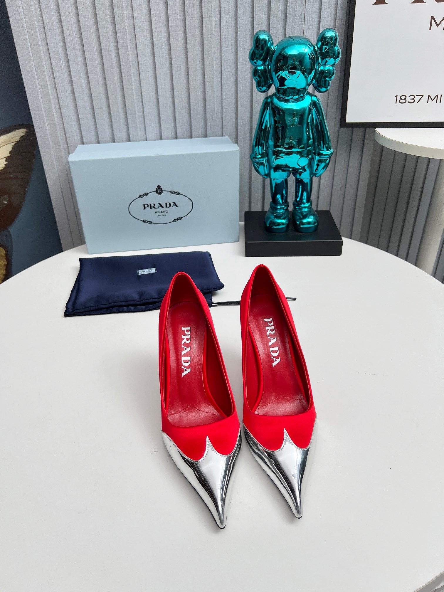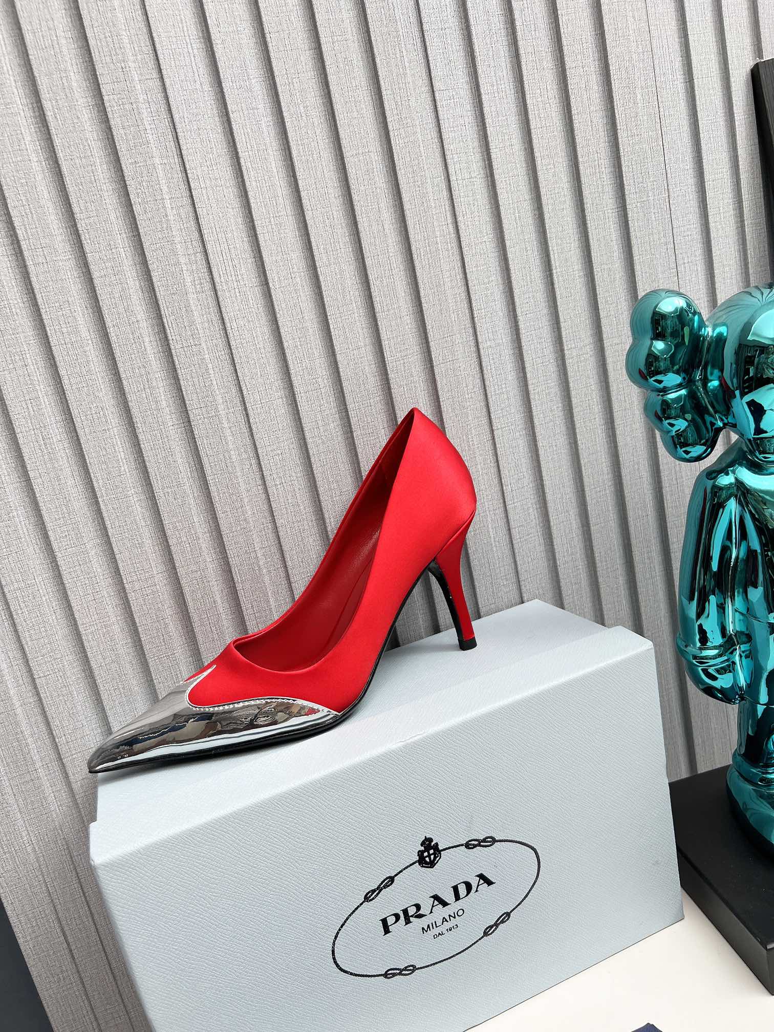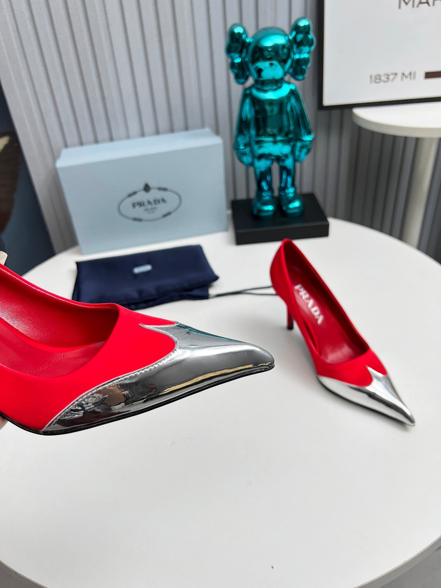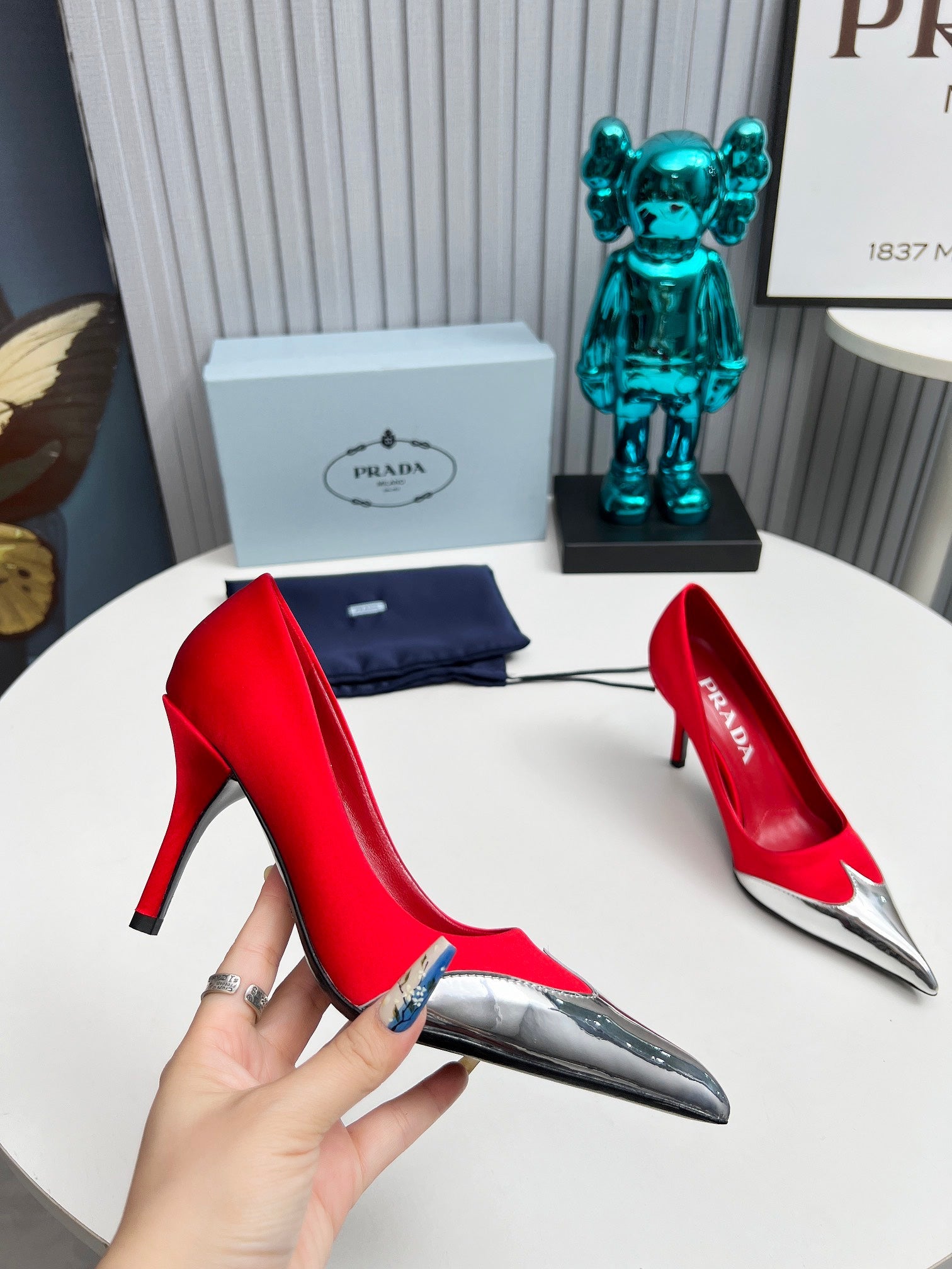 HIGH POINTED-TOE PUMPS IN RED MIX SILVER SATIN