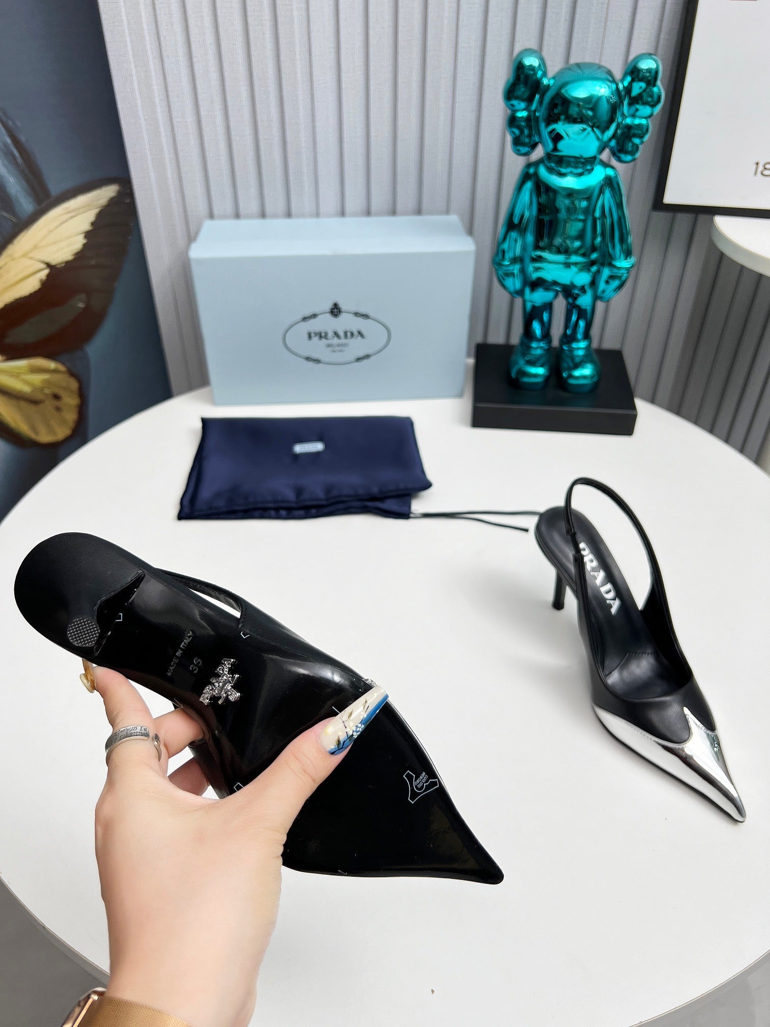 HIGH SLING BACK PUMPS IN SILVER MIX BLACK CALFSKIN