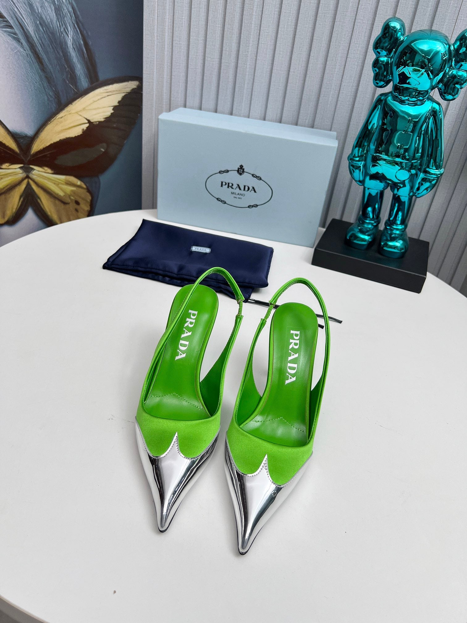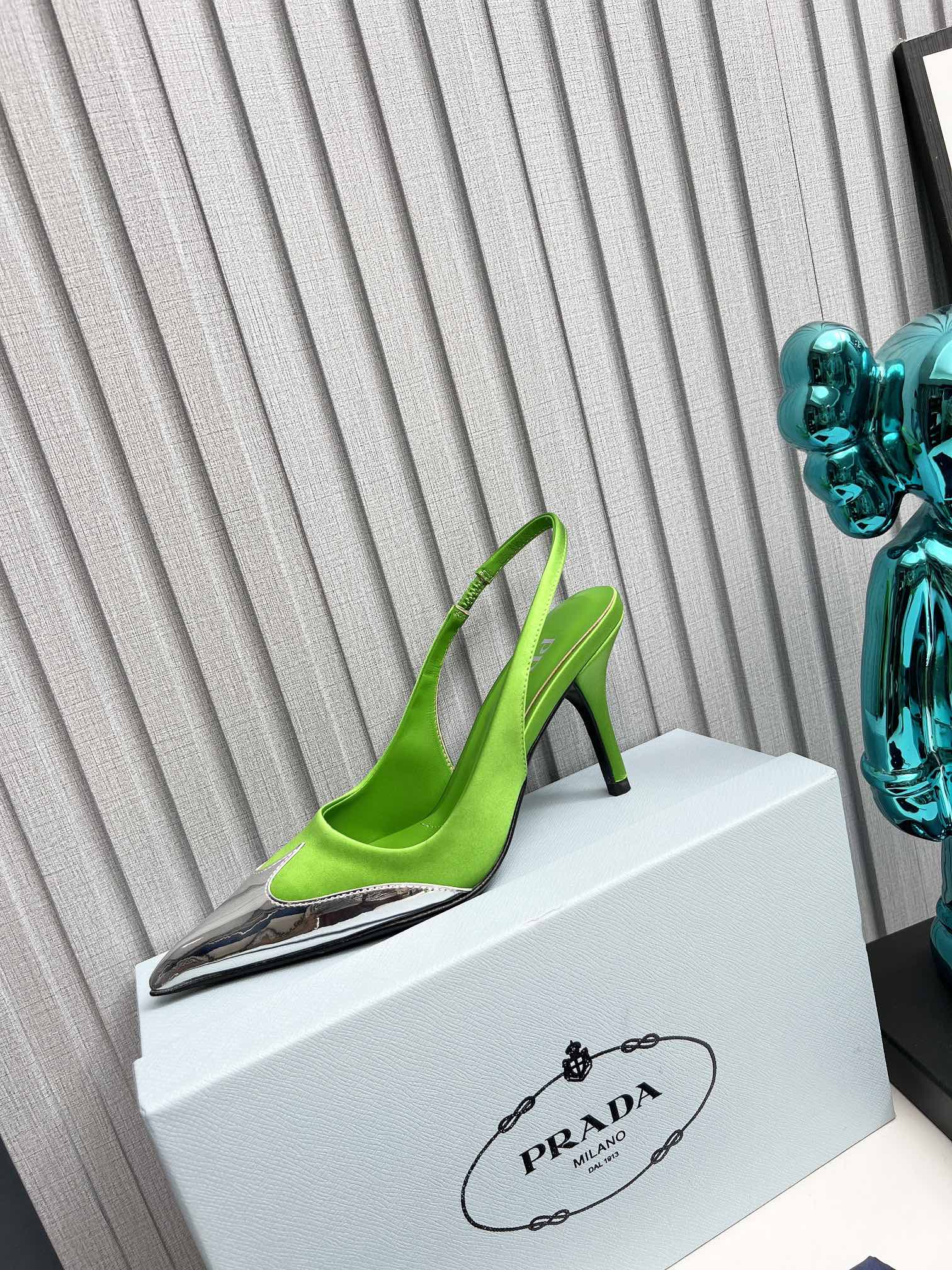 HIGH SLING BACK PUMPS IN SILVER MIX LIME GREEN SATIN