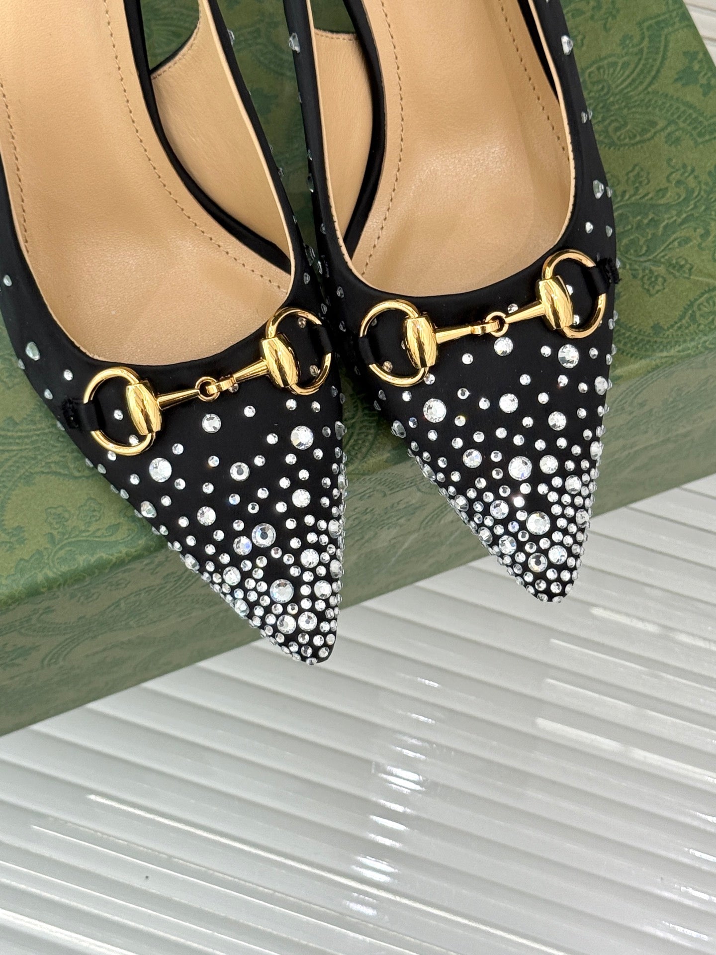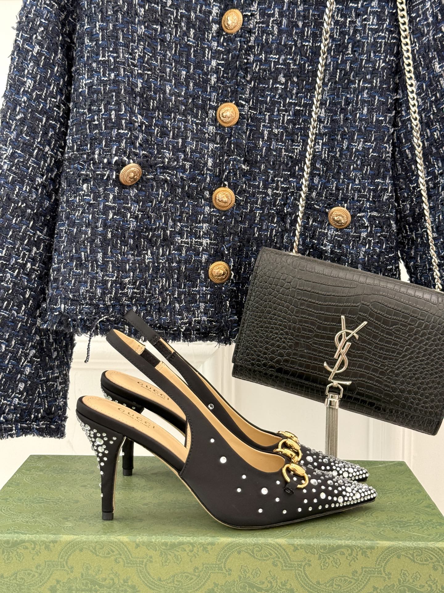 HIGH SLINGBACK 8.5 CM IN BLACK FABRIC WITH RHINESTONE EMBELLISHMENTS