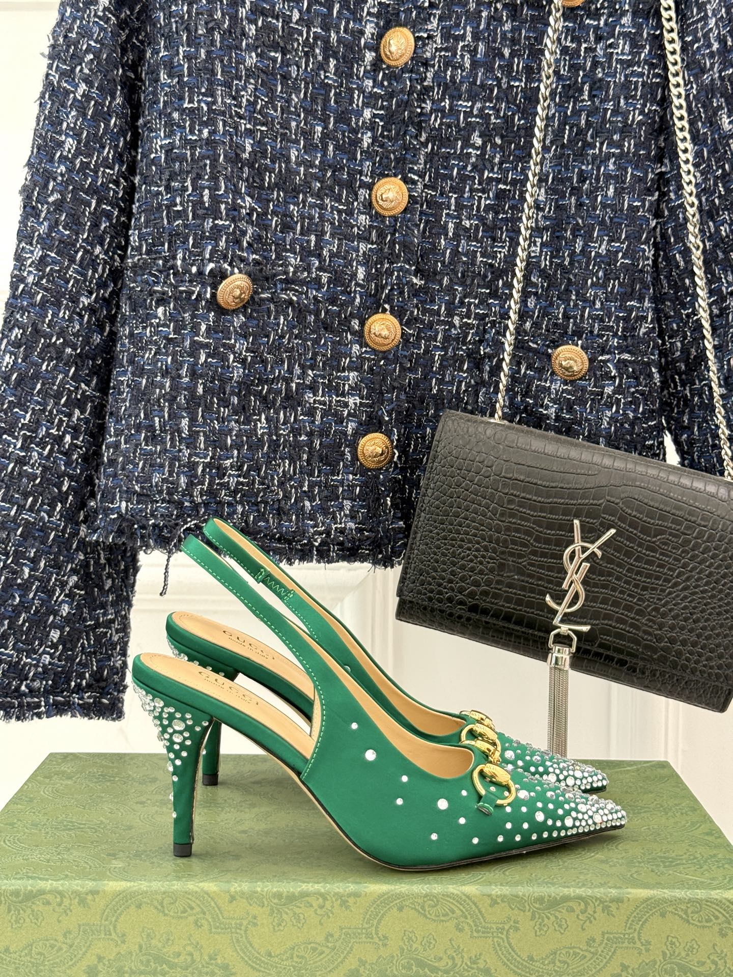 HIGH SLINGBACK 8.5 CM IN GREEN FABRIC WITH RHINESTONE EMBELLISHMENTS