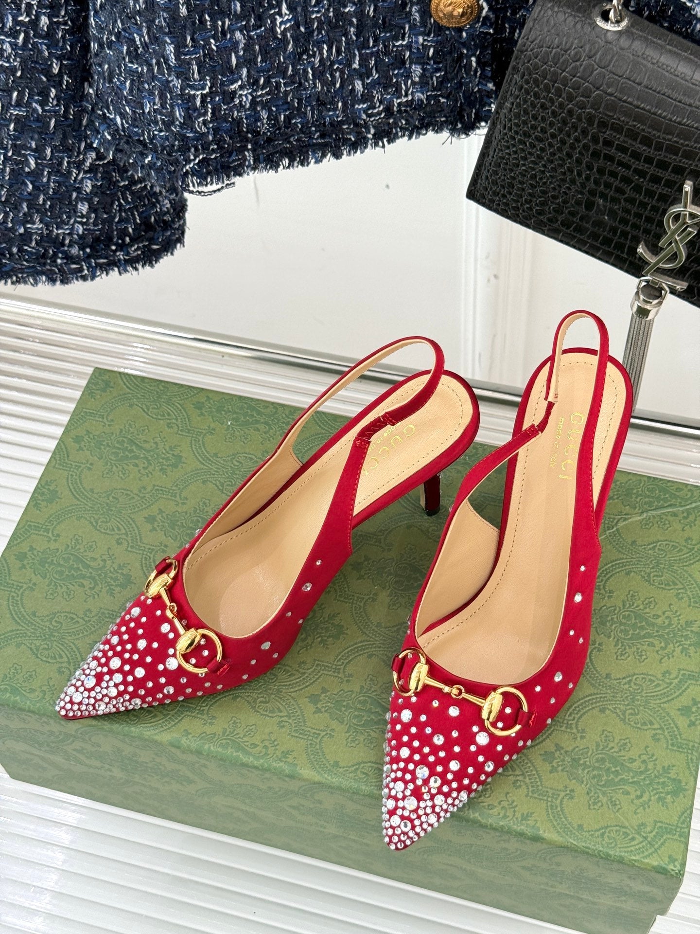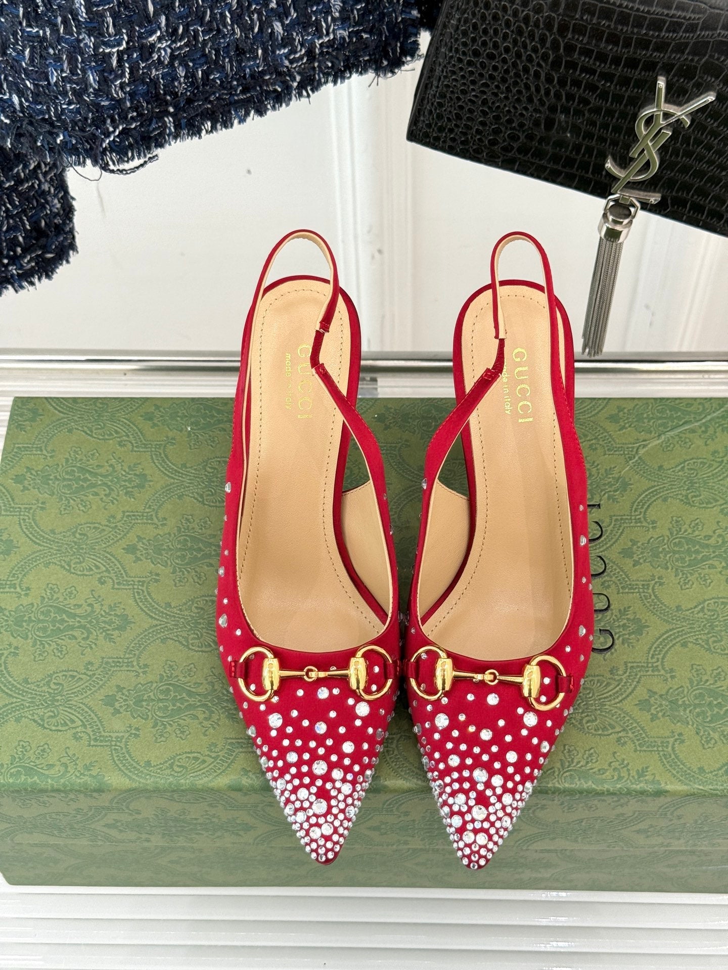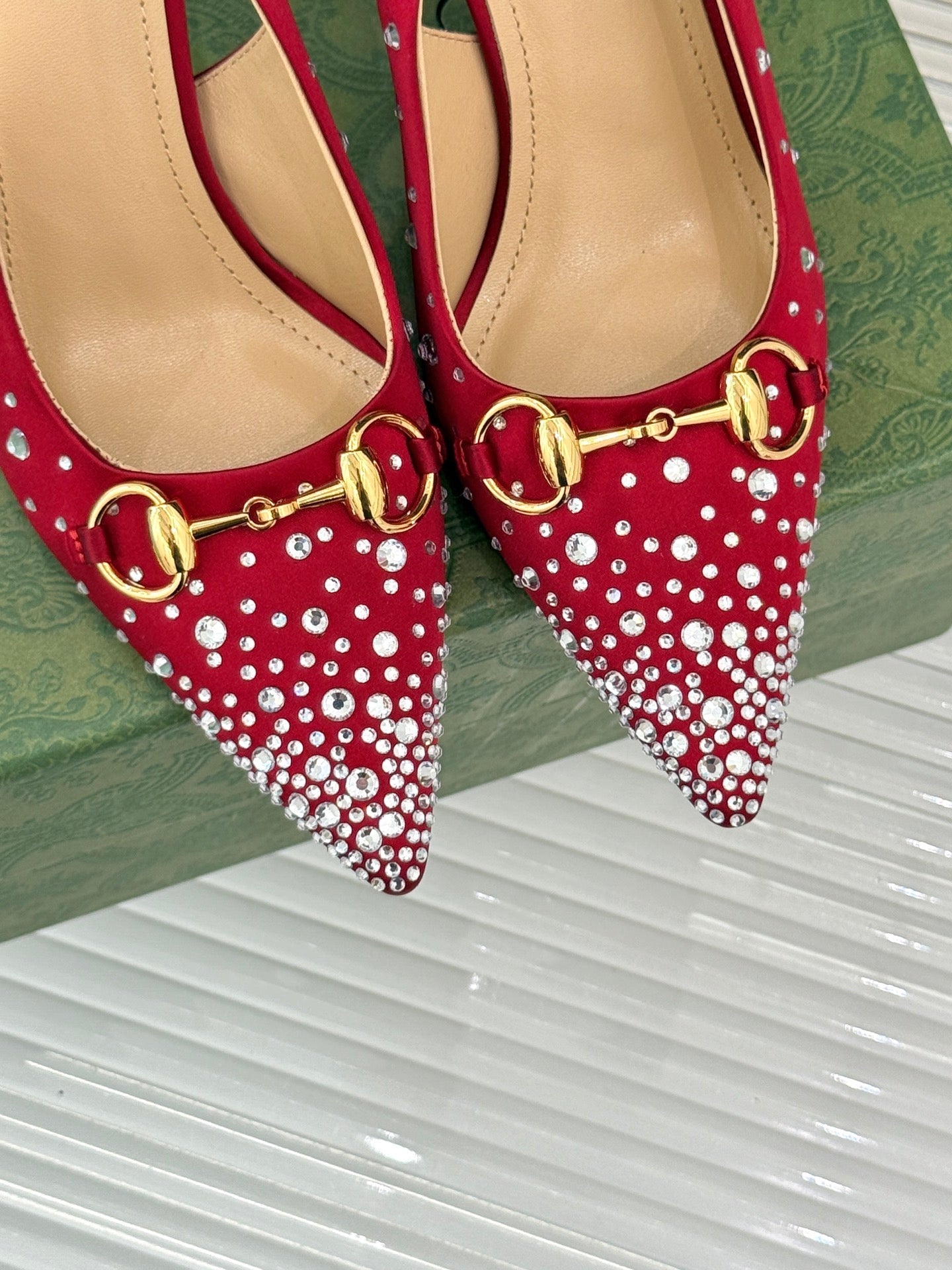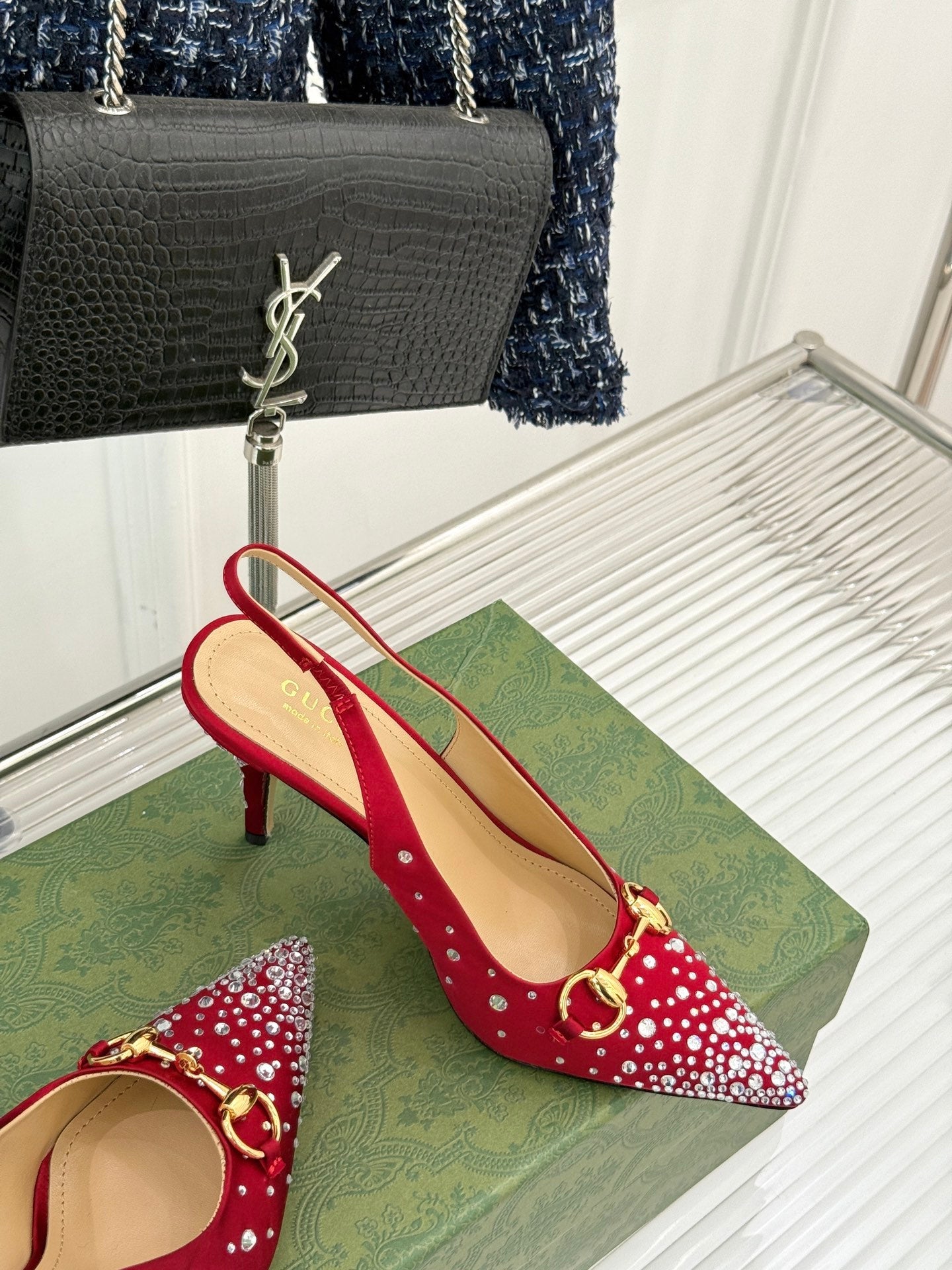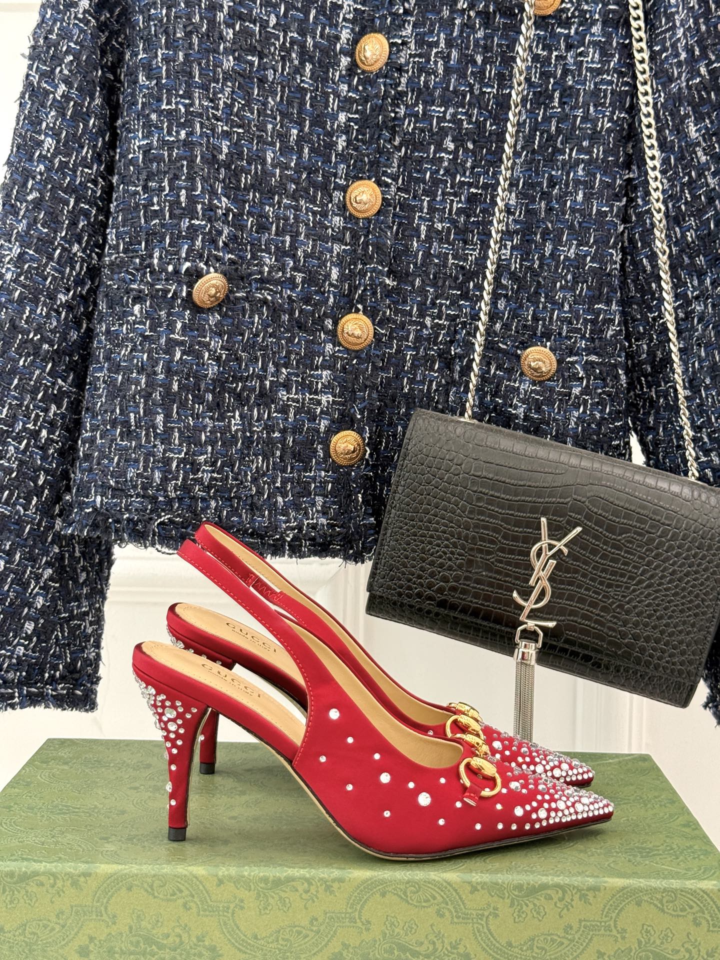 HIGH SLINGBACK 8.5 CM IN RED FABRIC WITH RHINESTONE EMBELLISHMENTS