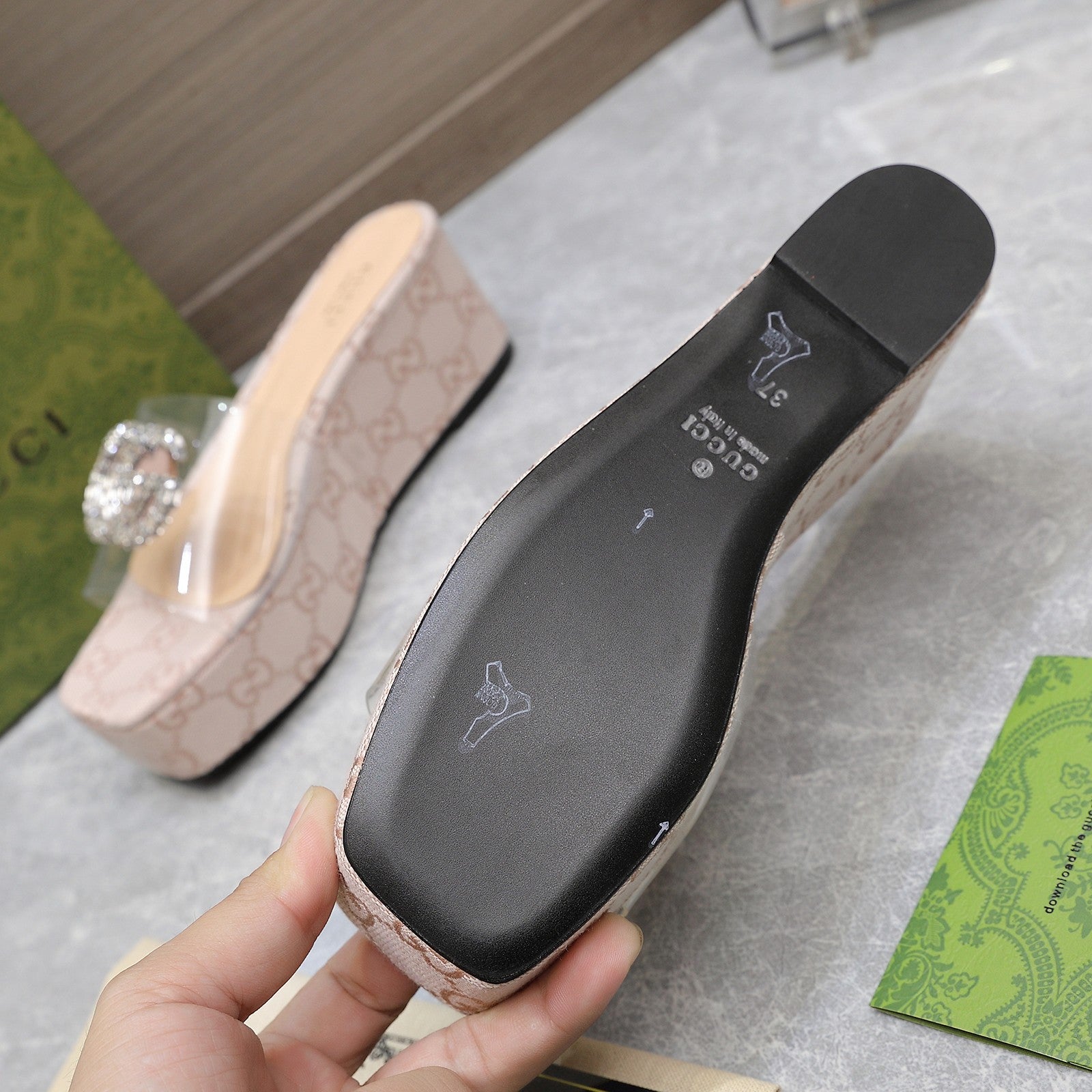 HIGH WEDGE PLATFORM IN ALMOND BEIGE CANVAS WITH DOUBLE CRYSTAL G BUCKLE