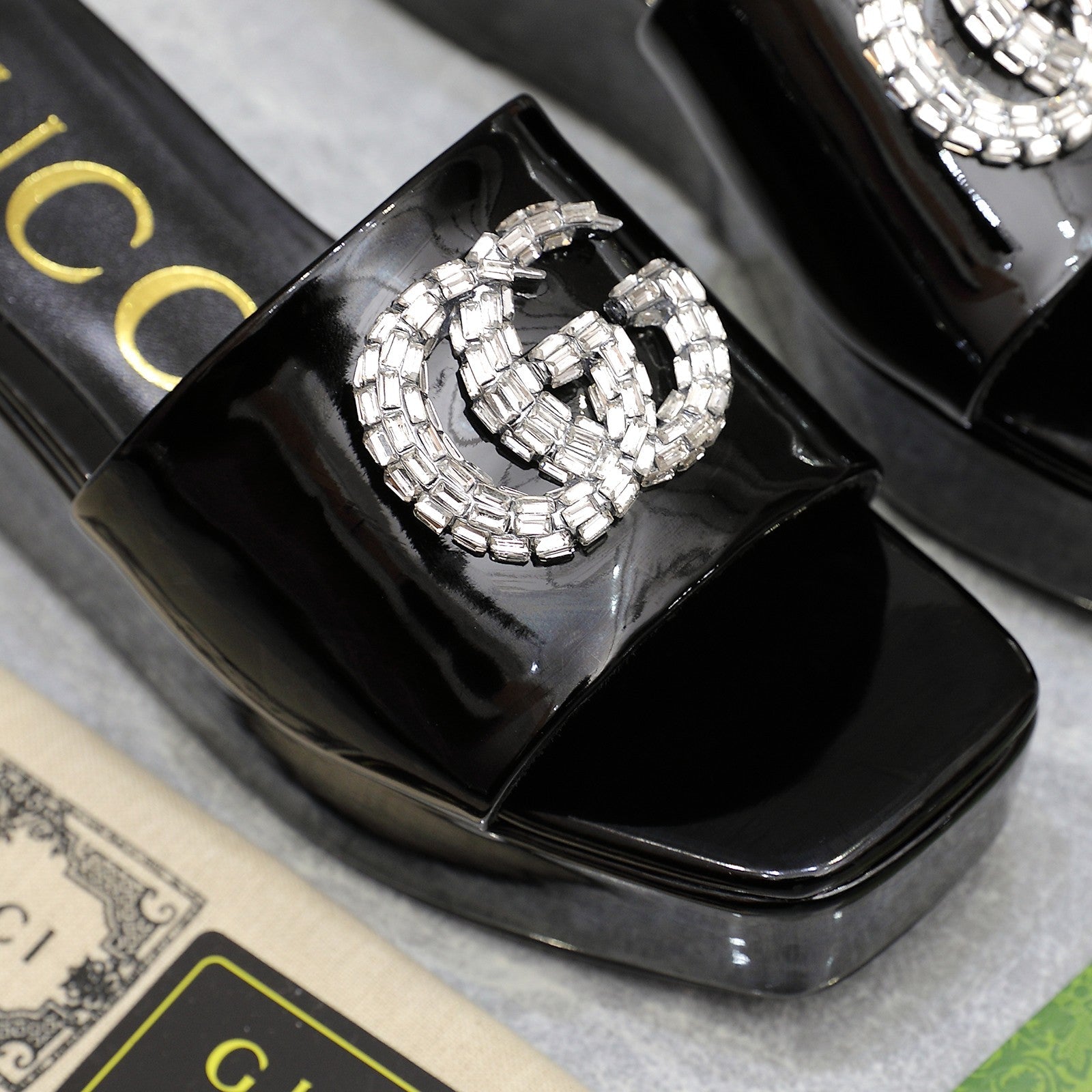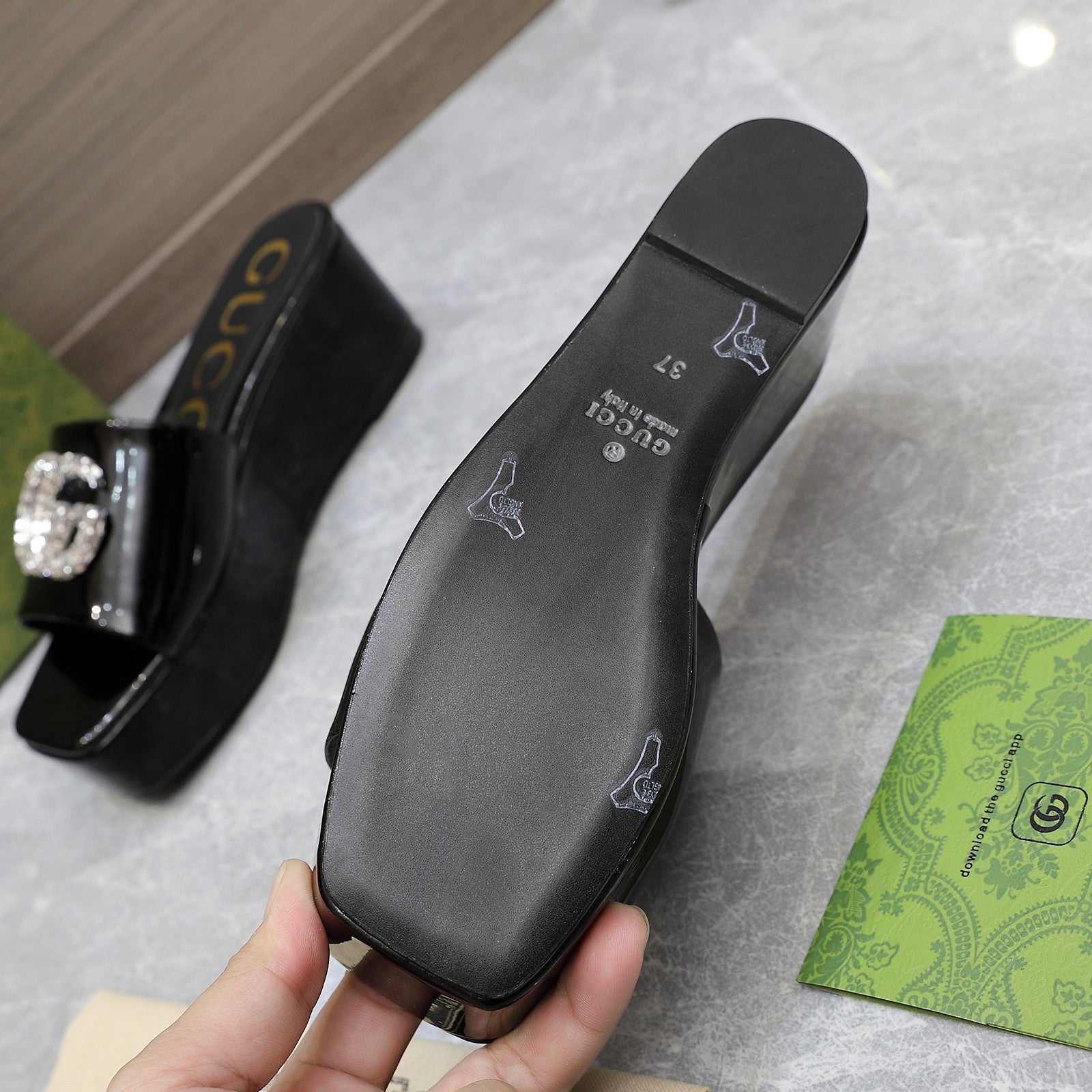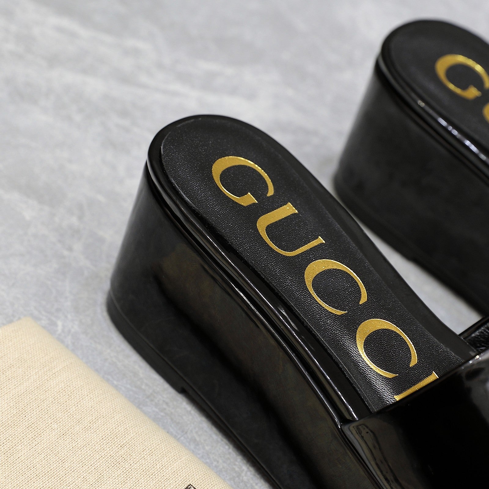 HIGH WEDGE PLATFORM WITH DOUBLE G IN BLACK GLOSSY CALFSKIN