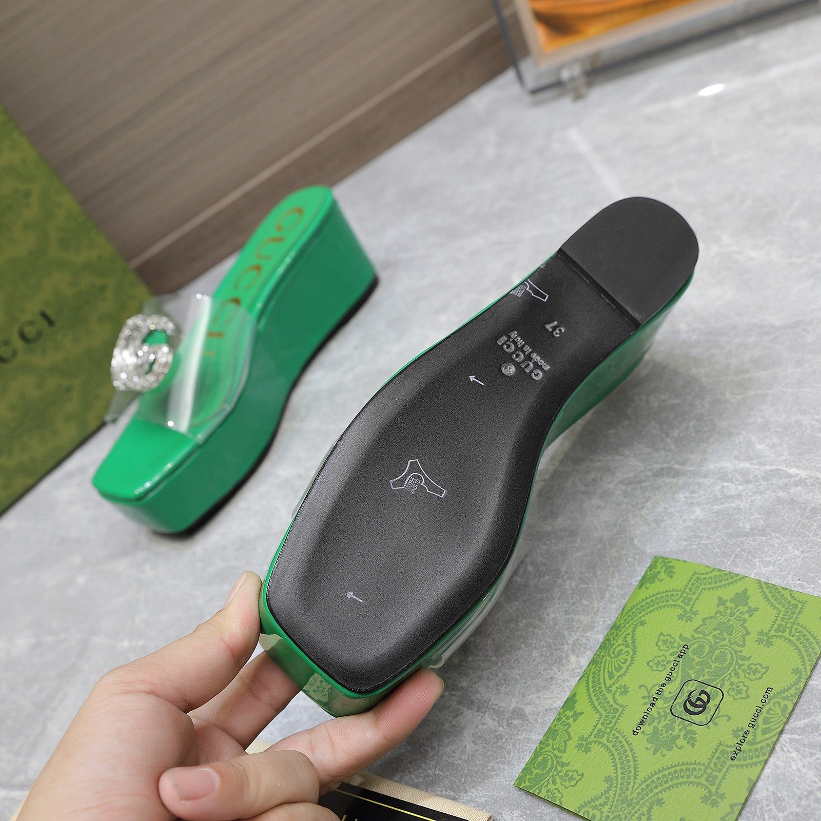 HIGH WEDGE PLATFORM WITH DOUBLE G IN GREEN GLOSSY CALFSKIN