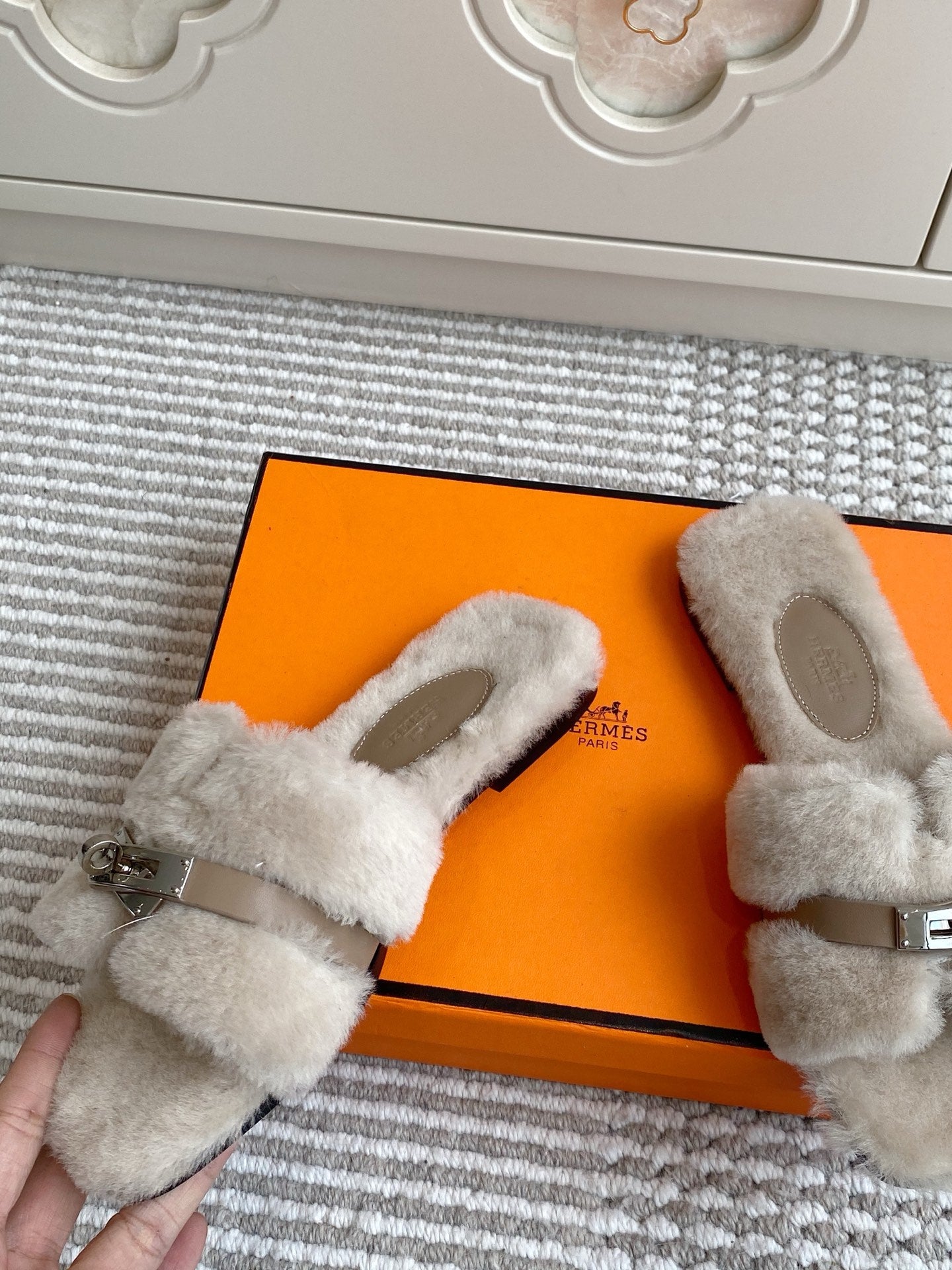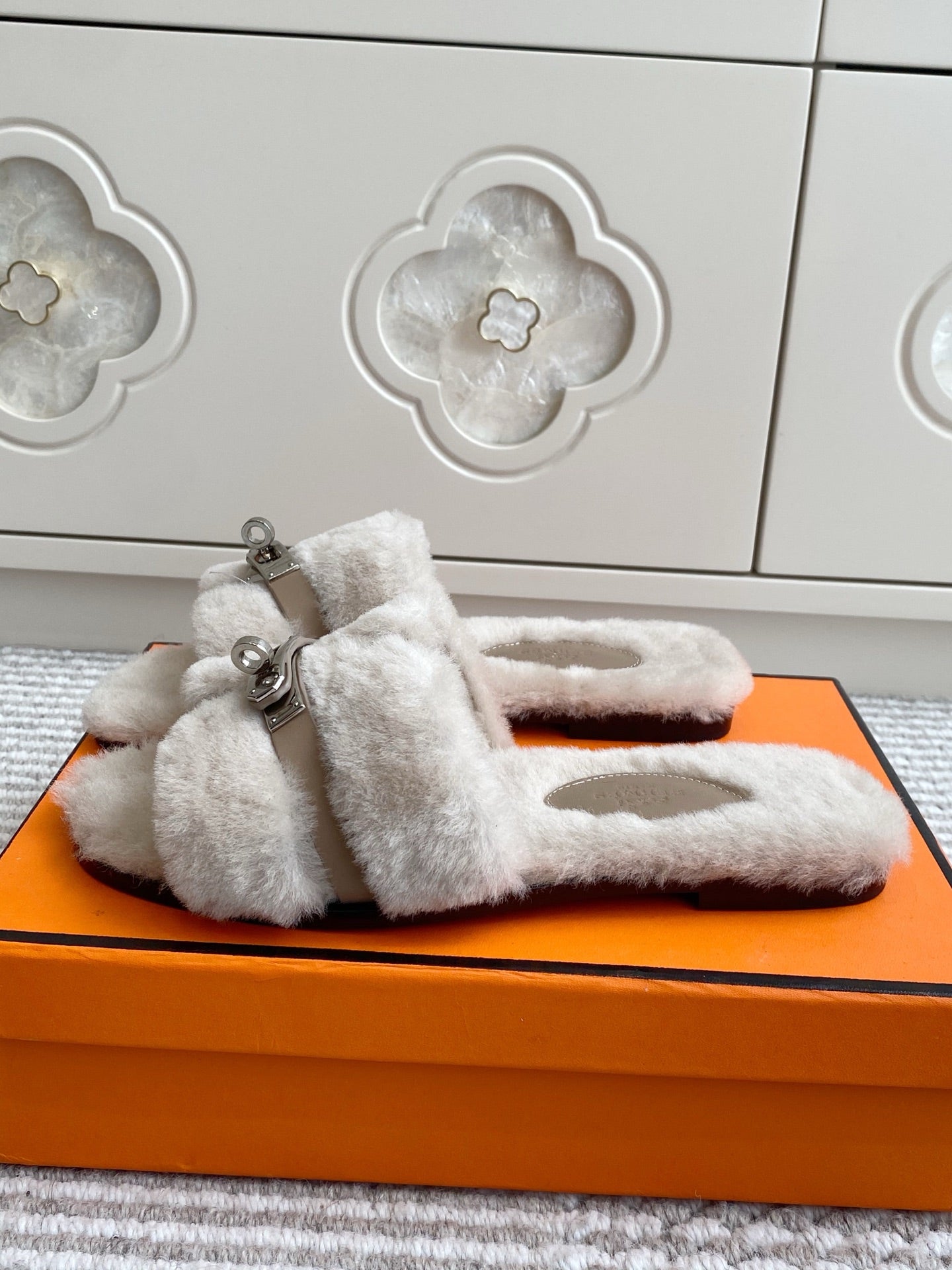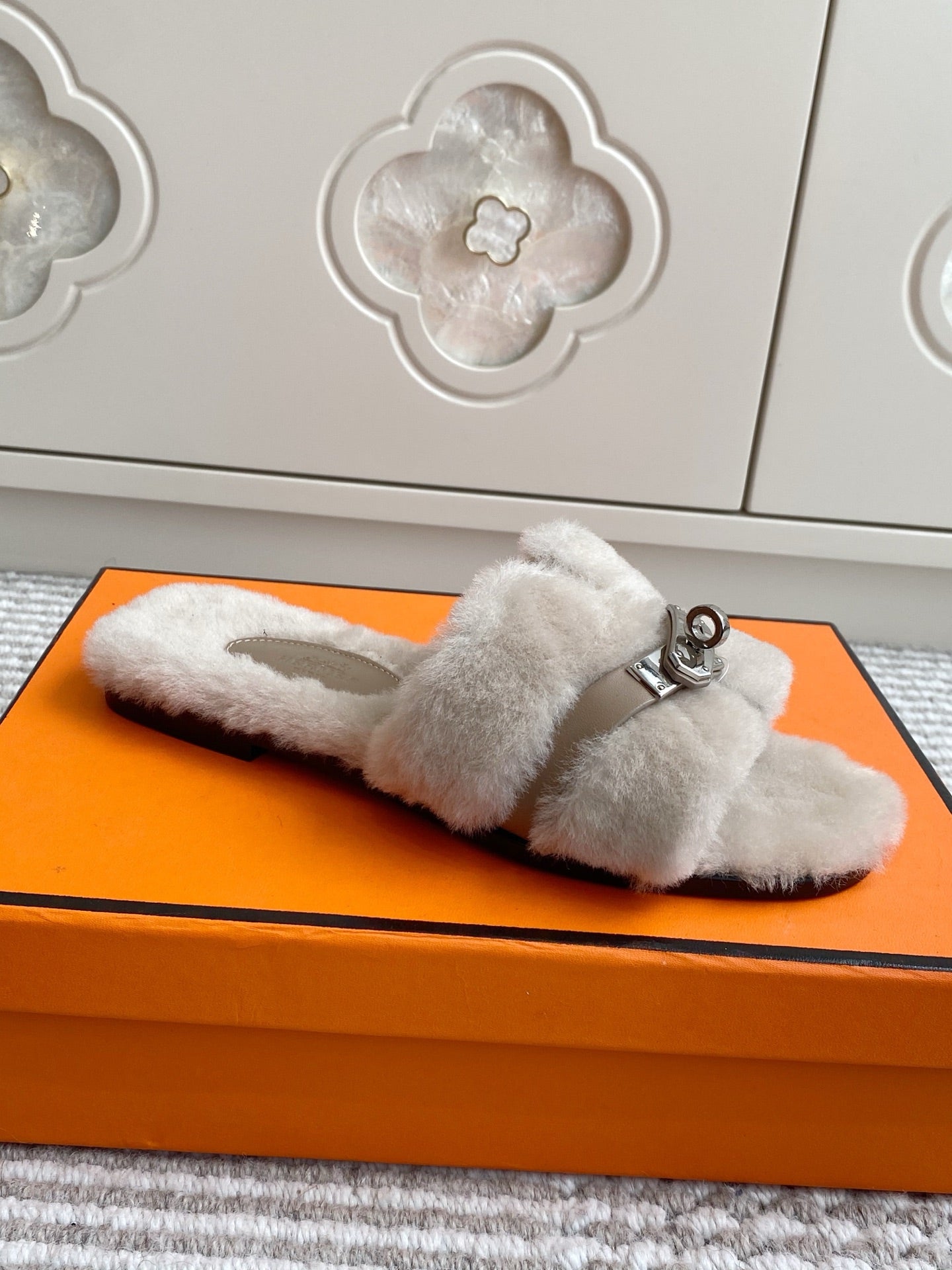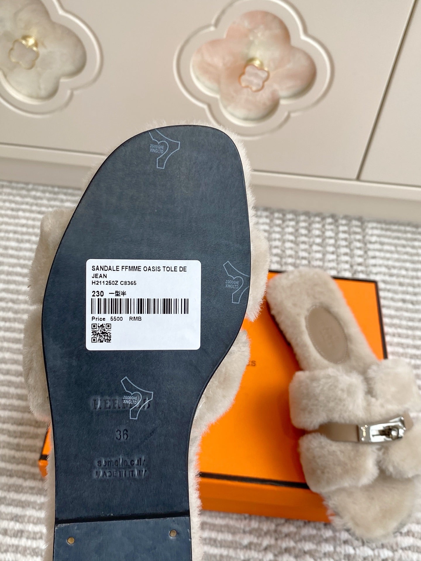 HM 25S ECLAIR SANDAL IN PALE BEIGE GRAY SHEARLING WITH SILVER HARDWARE