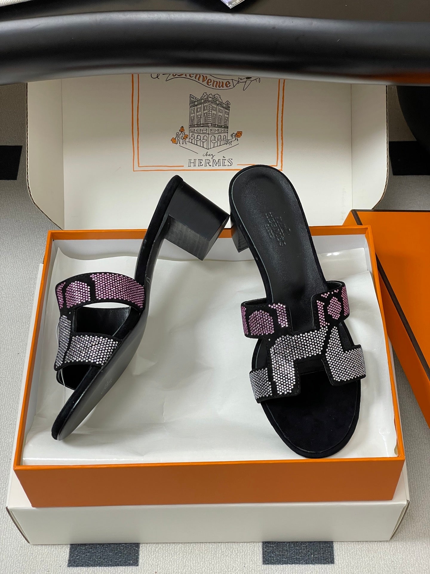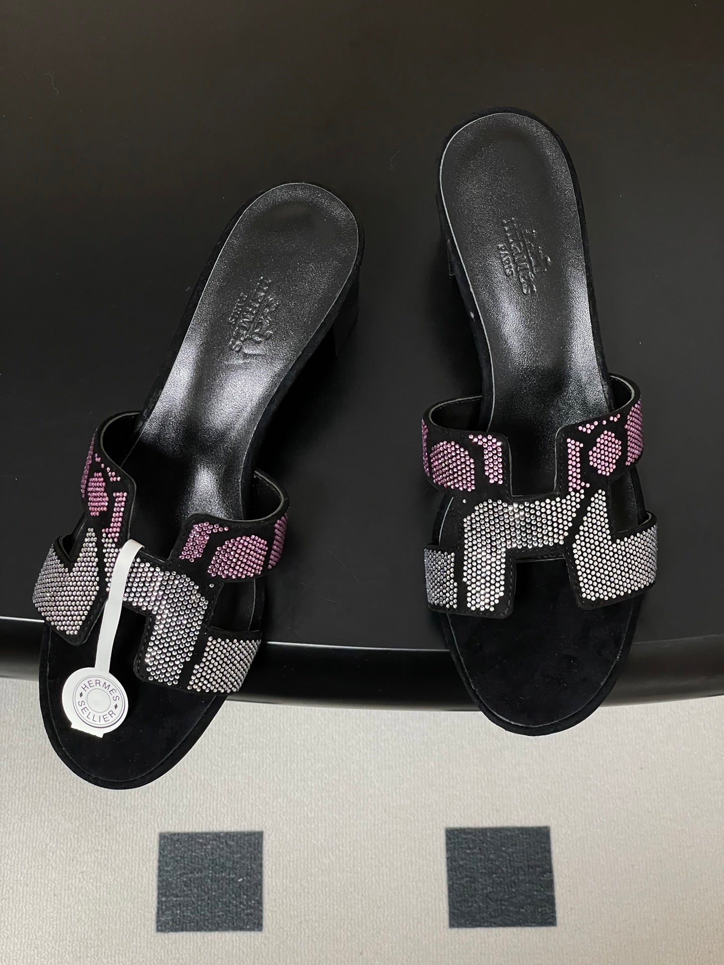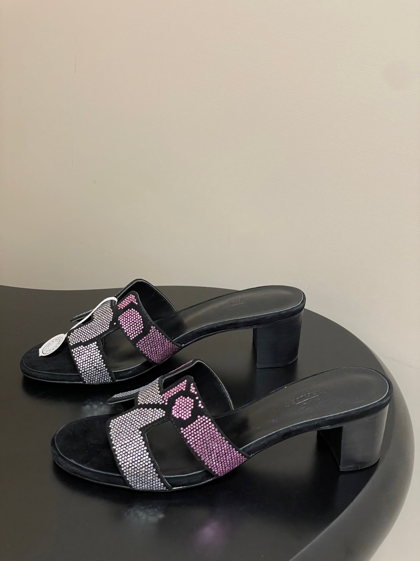 HM 25S ORAN HIGH‑HEEL SANDAL 50 MM IN BLACK LAMBSKIN WITH WHITE MIX PINK STONE DETAILS