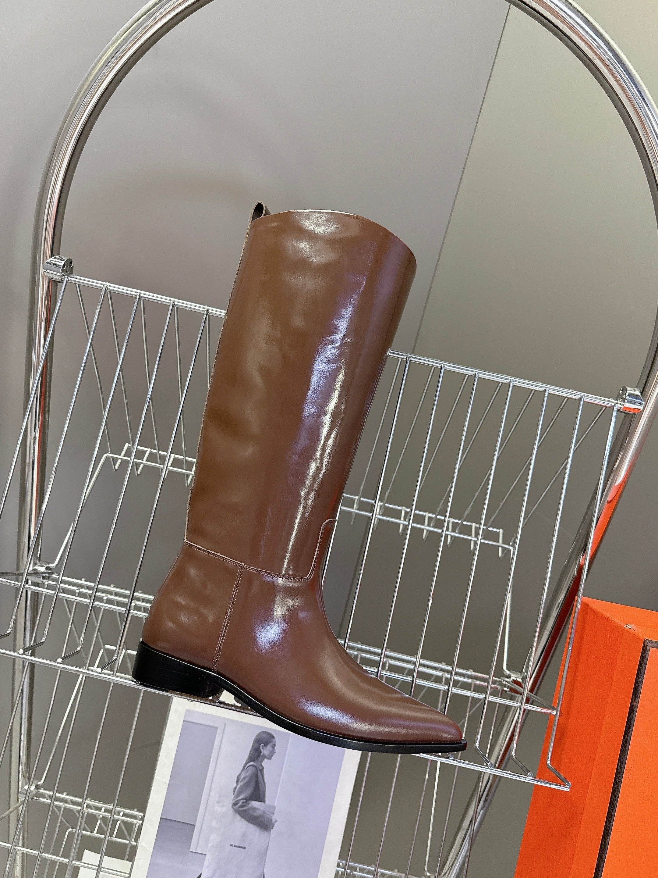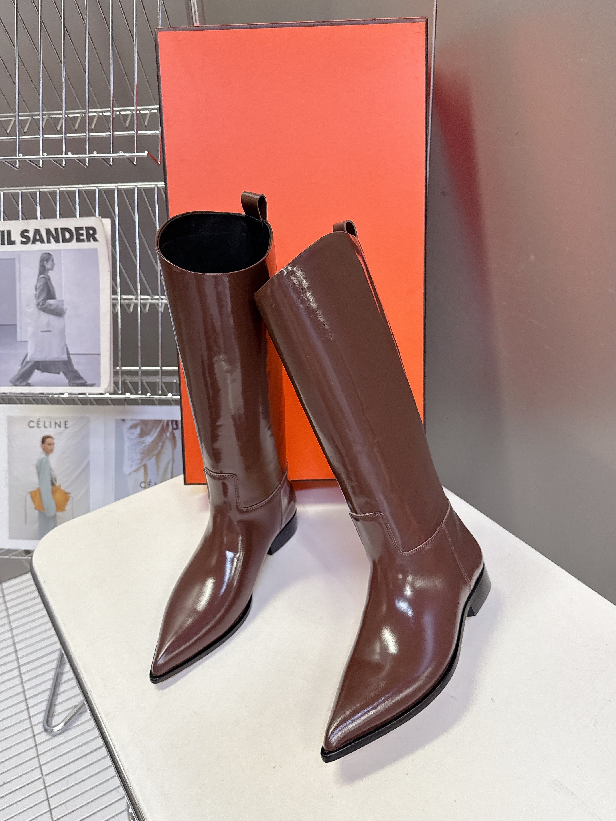 HM 25S POINTED-TOE KNEE-HIGH BOOTS IN BROWN GLOSSY LAMBSKIN