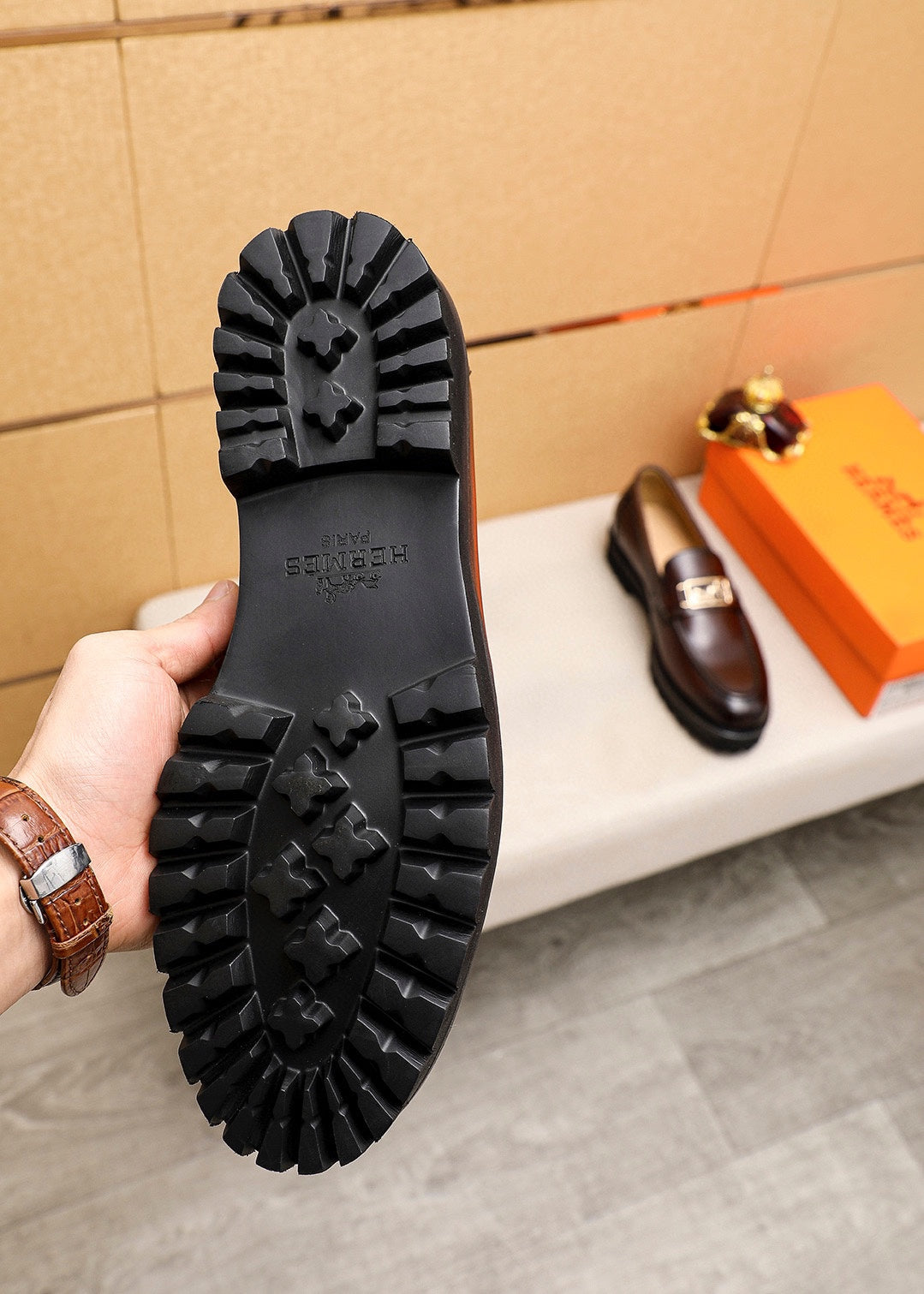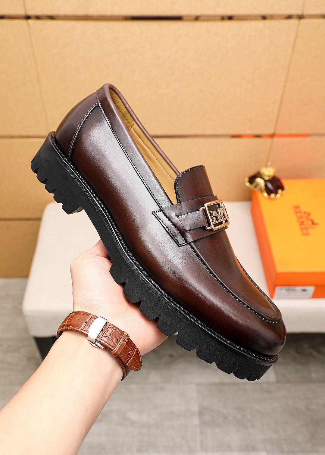 HM GOLD BUCKLE FAUBOURG LOAFER CHOCOLATE CALFSKIN