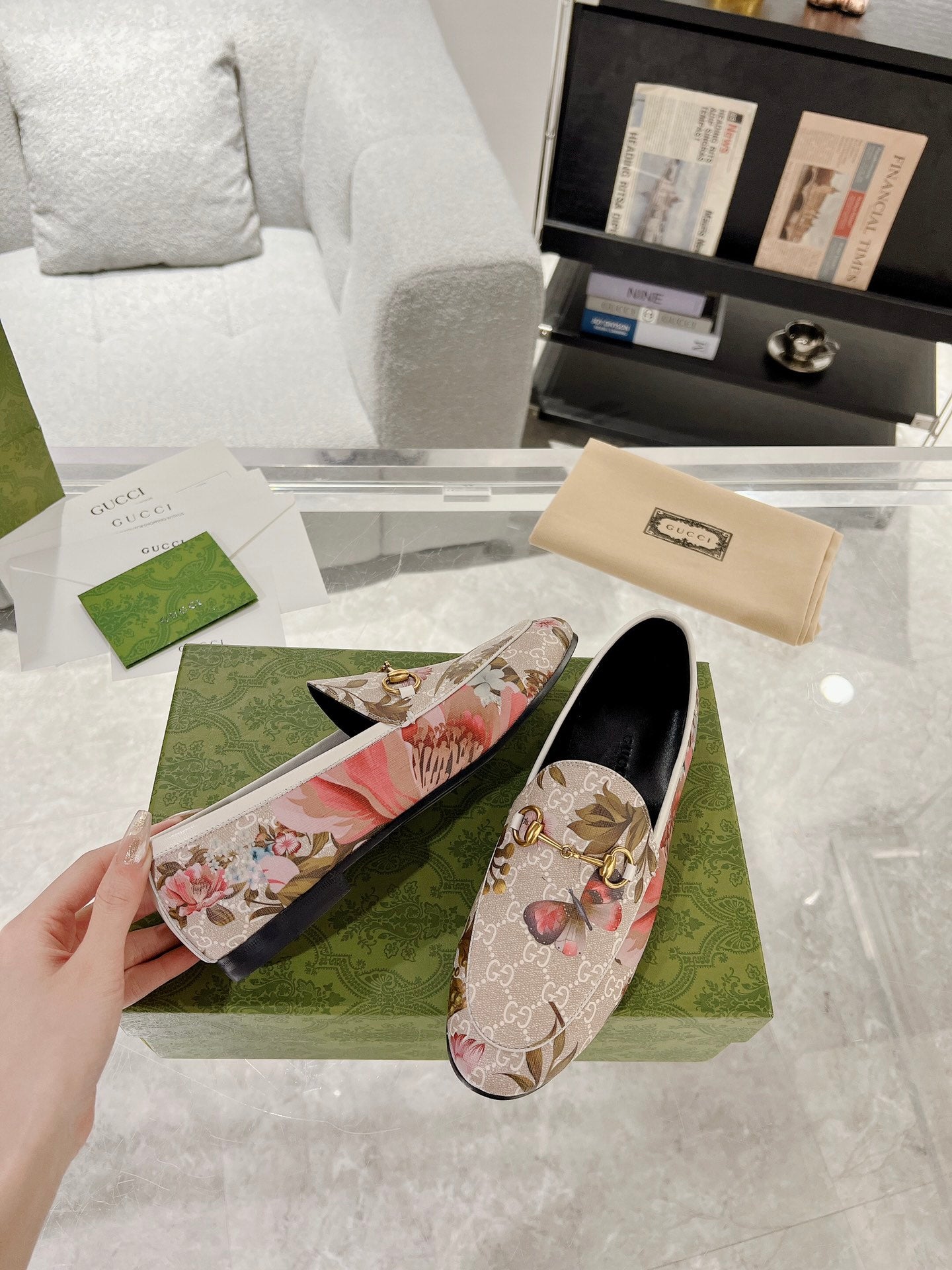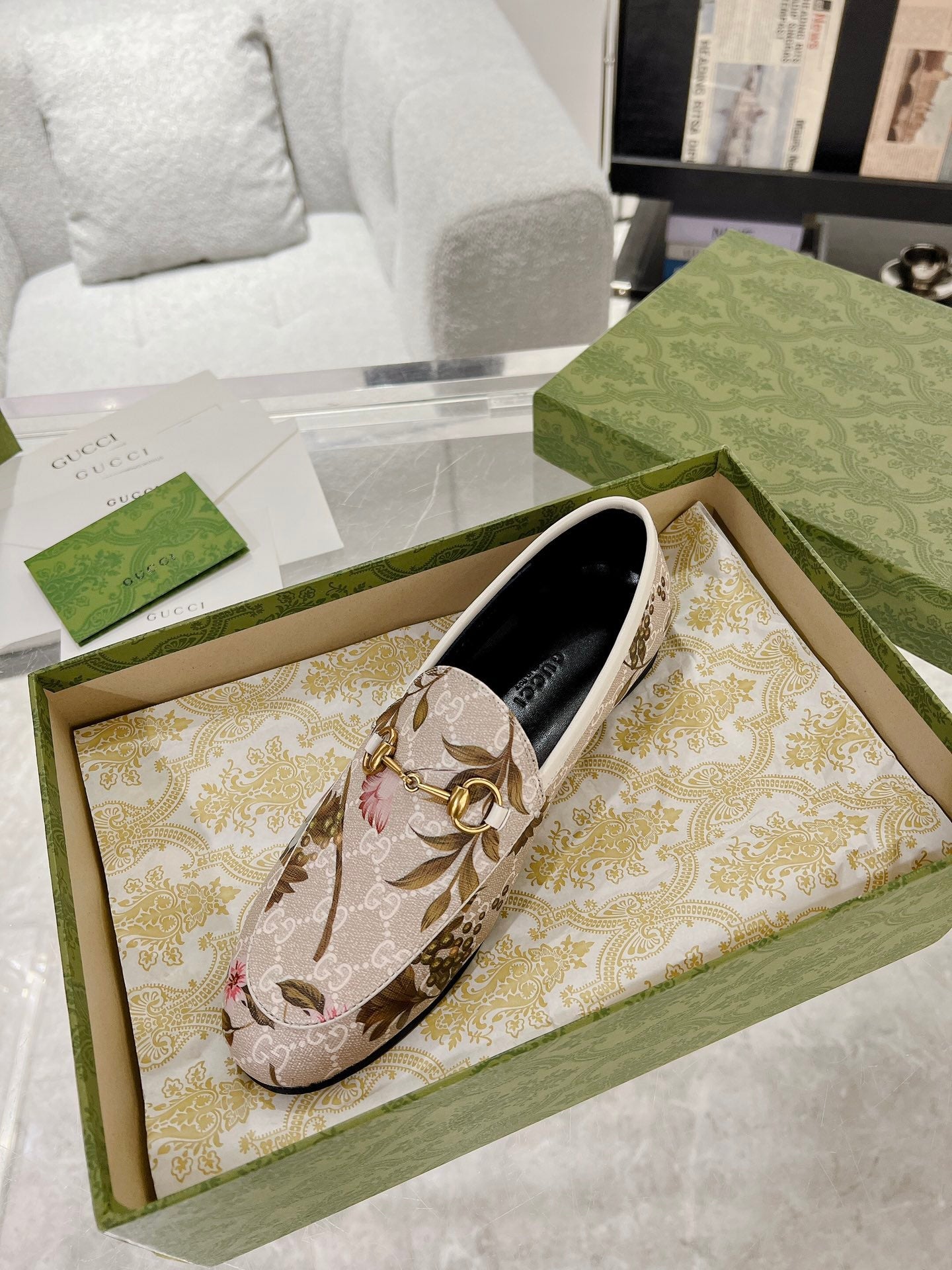 HORSEBIT LOAFER WITH FLOWER PRINT IN LINEN BEIGE MONOGRAM JACQUARD FABRIC