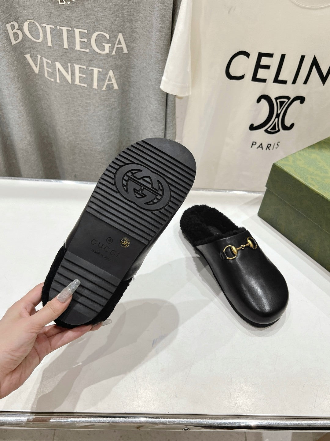 HORSEBIT MULE IN BLACK CALFSKIN AND FLEECE LINING