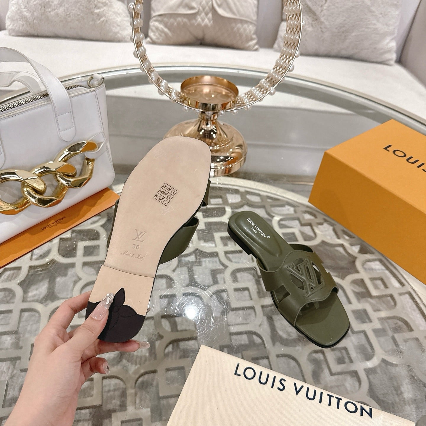 ISOLA FLAT SLIDE IN ARMY GREEN CALFSKIN