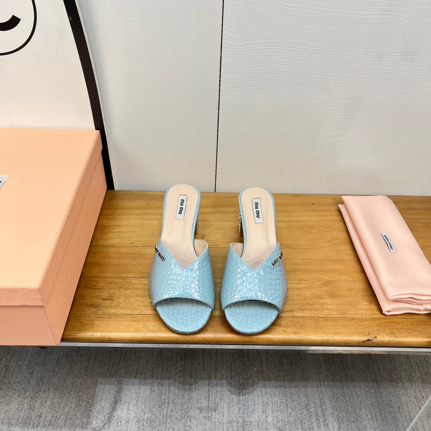 JEWELLED HEEL 55 MULE SANDALS IN LIGHT BLUE CALFSKIN