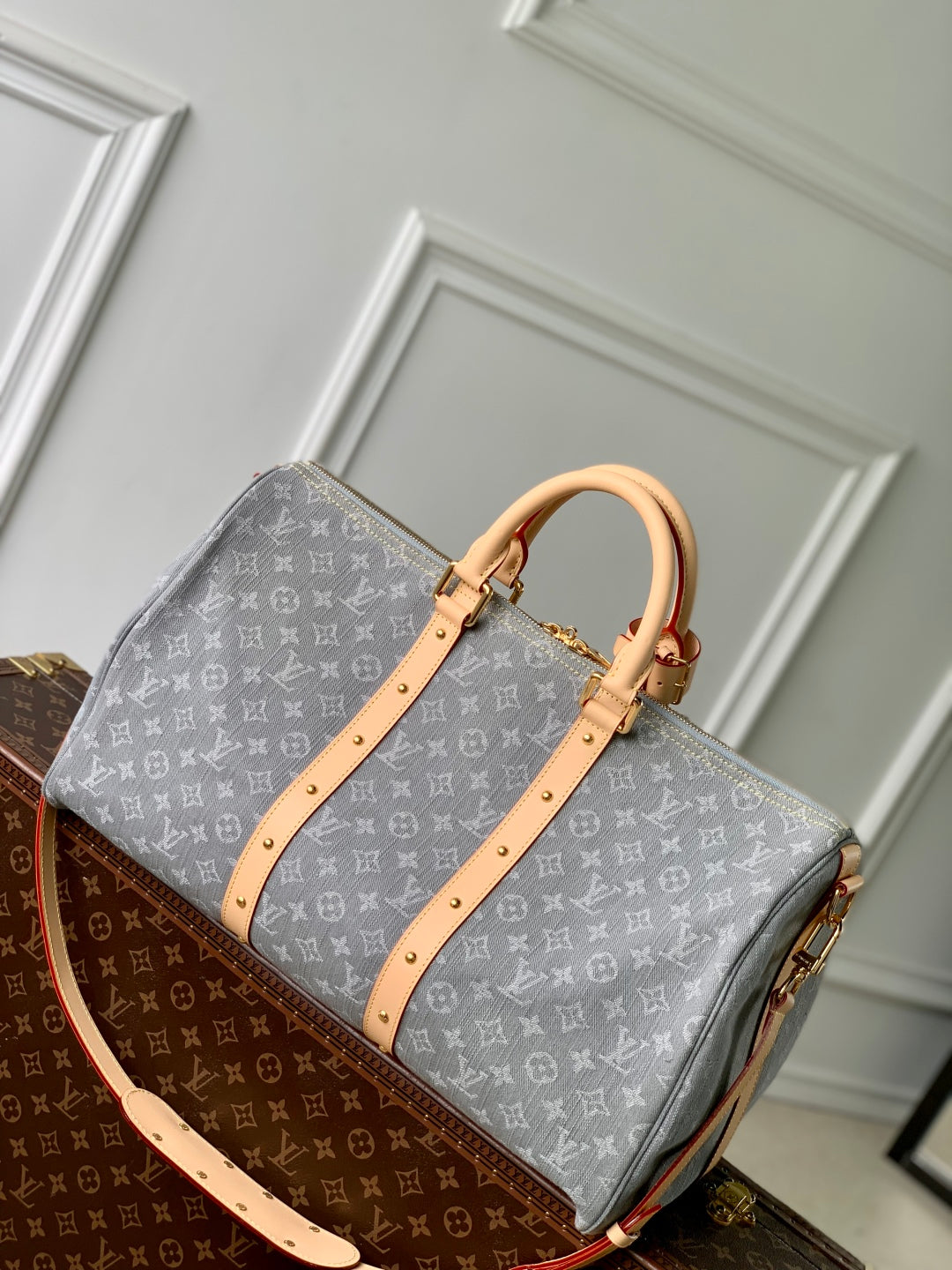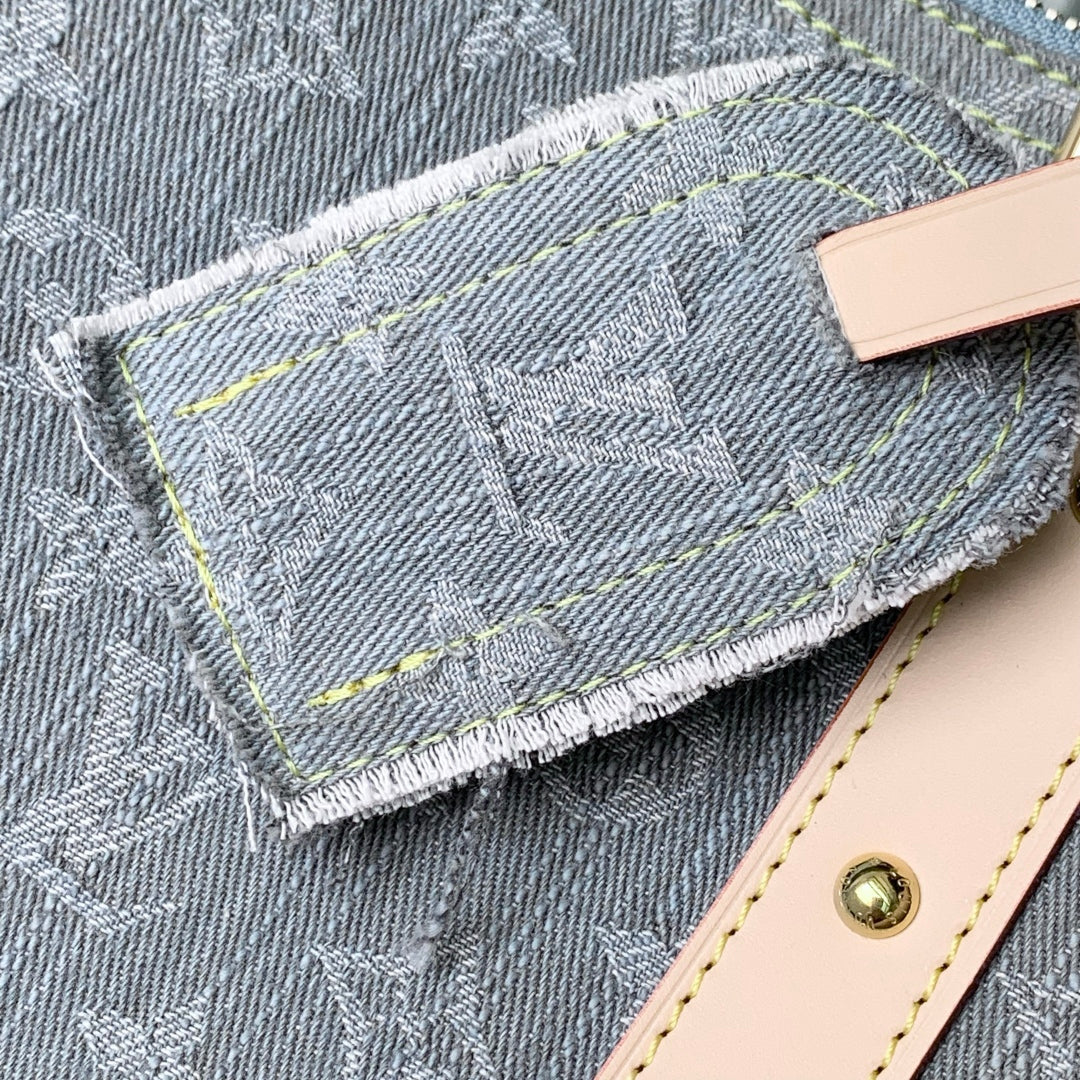KEEPALL BANDOULIÈRE 45 IN GREY MONOGRAM DENIM LIGHT BROWN CALFSKIN