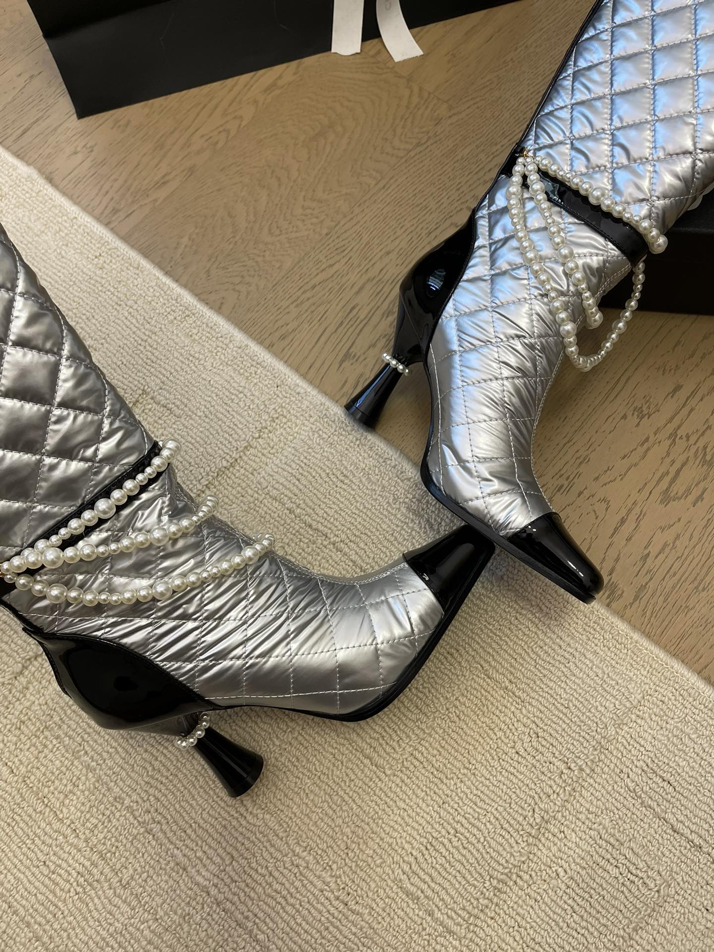 KNEE HIGH BOOTS 8 CM IN SILVER MIX BLACK CALFSKIN WITH PEARL CHAIN