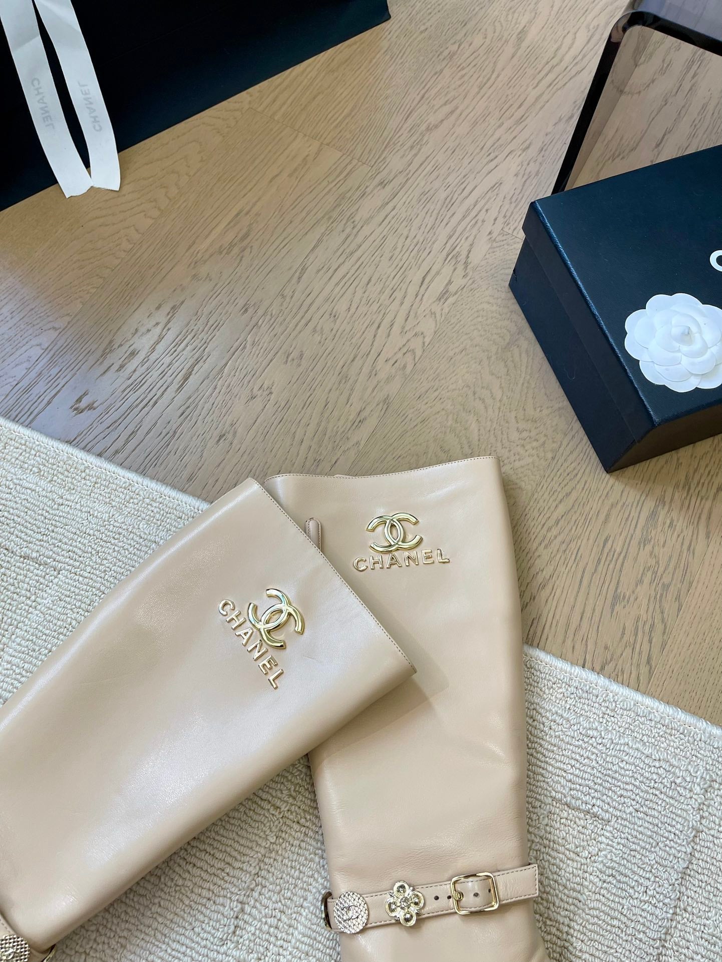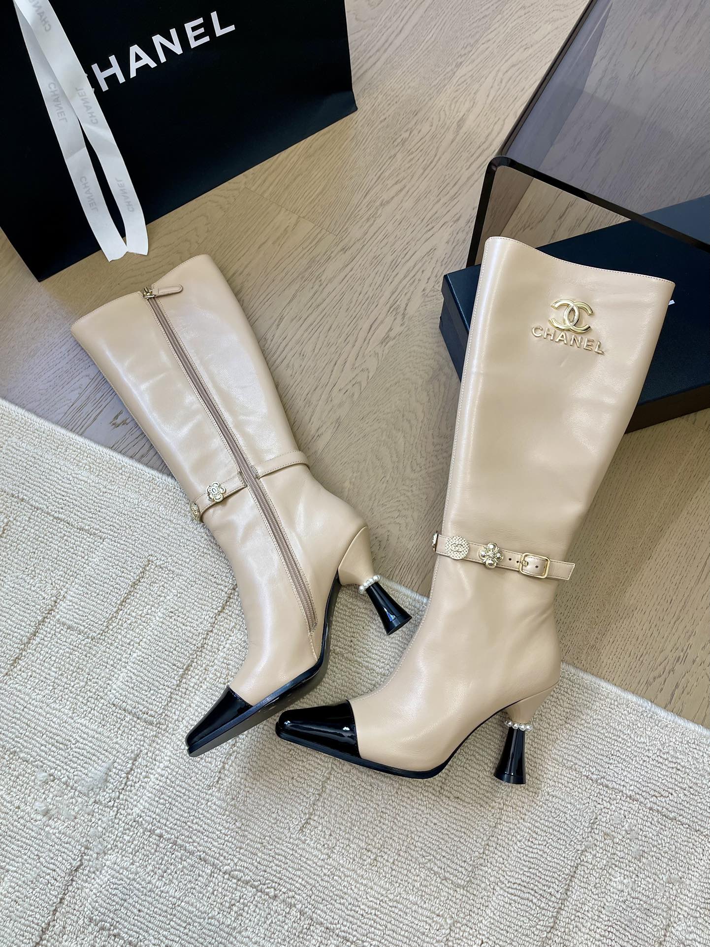 KNEE HIGH BOOTS IN BEIGE MIX BLACK CALFSKIN