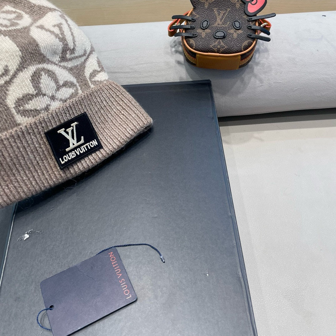 KNITTED BEANIE HAT IN BROWN MIX BEIGE WOOL AND RABBIT FUR 426244