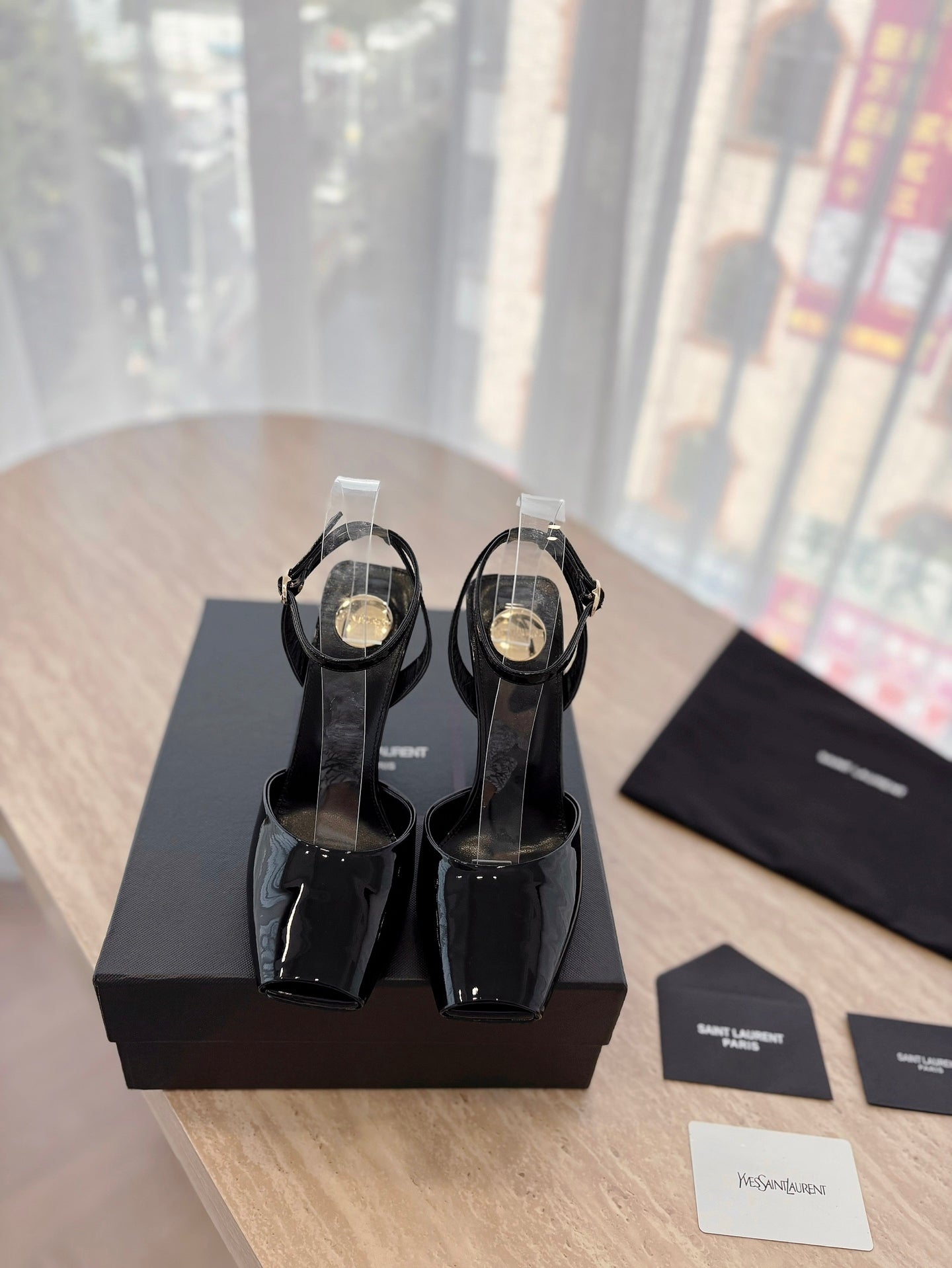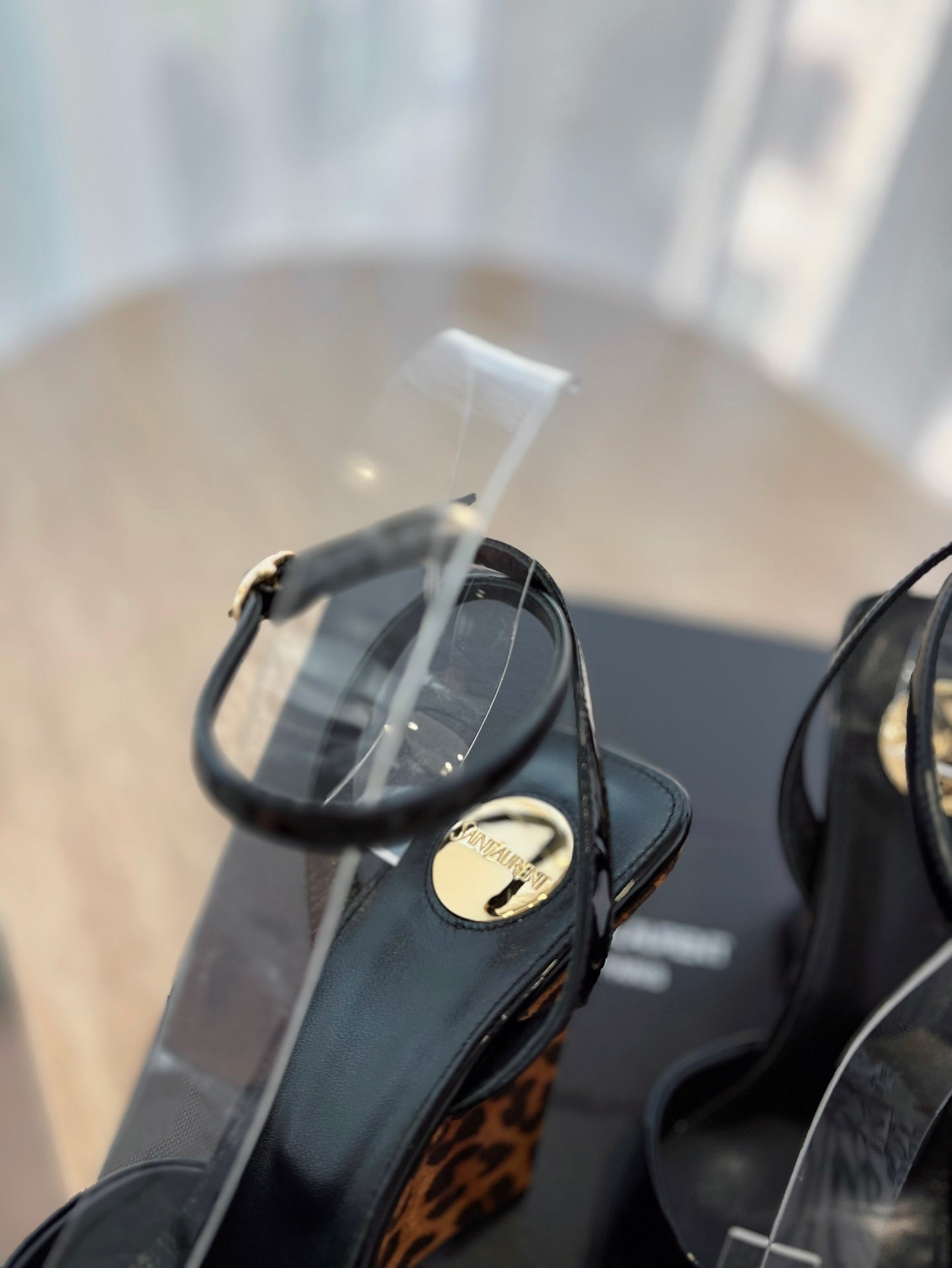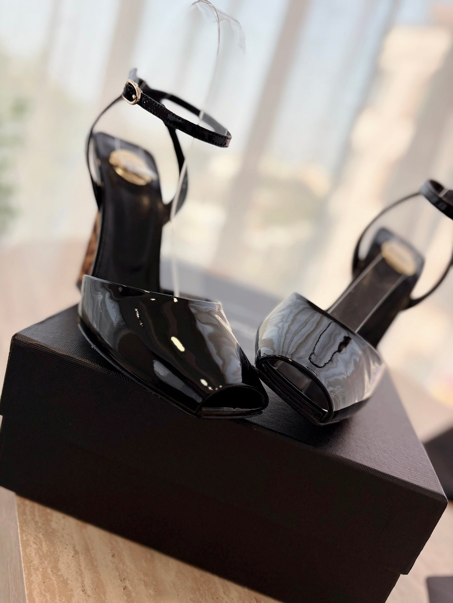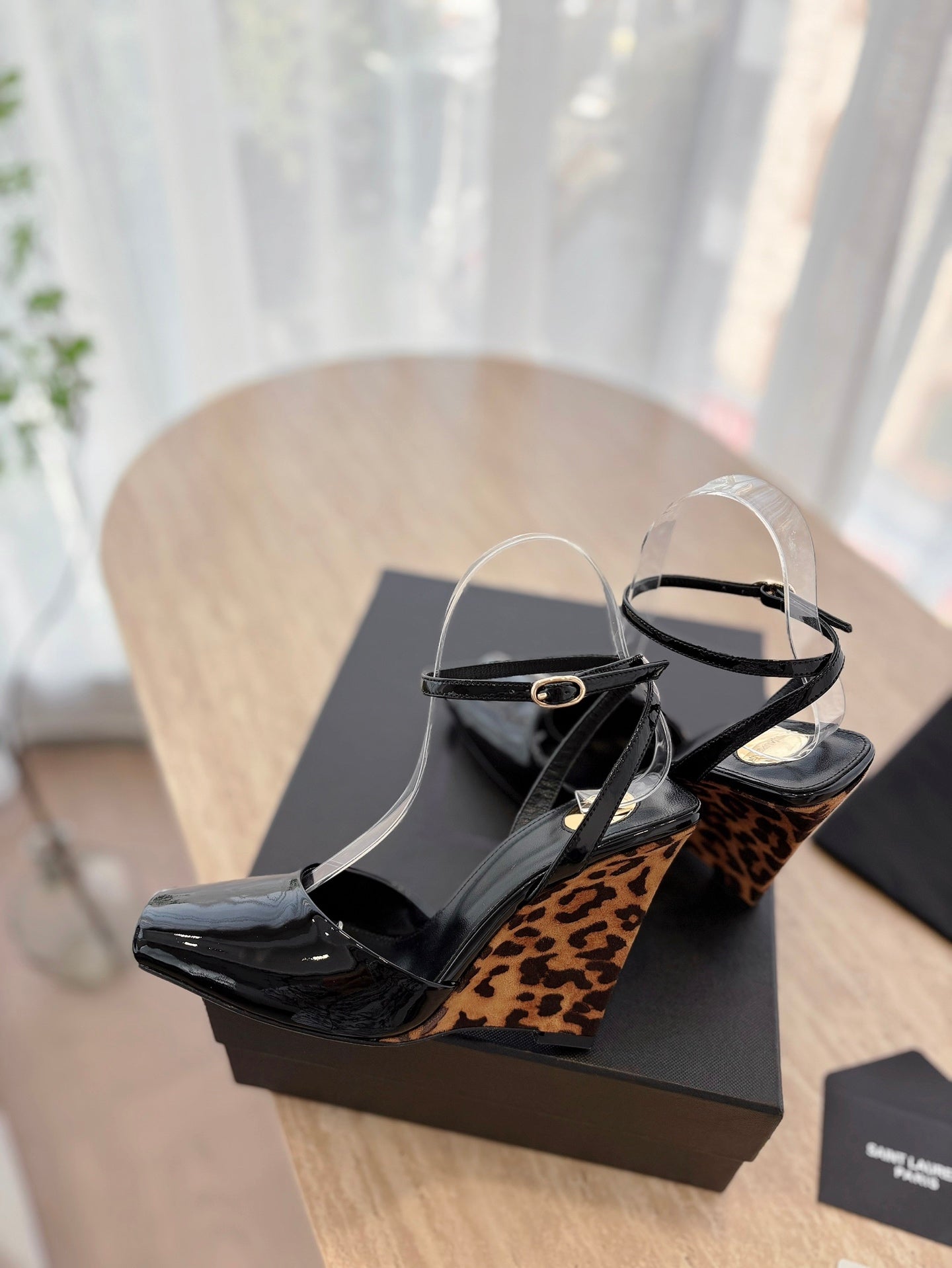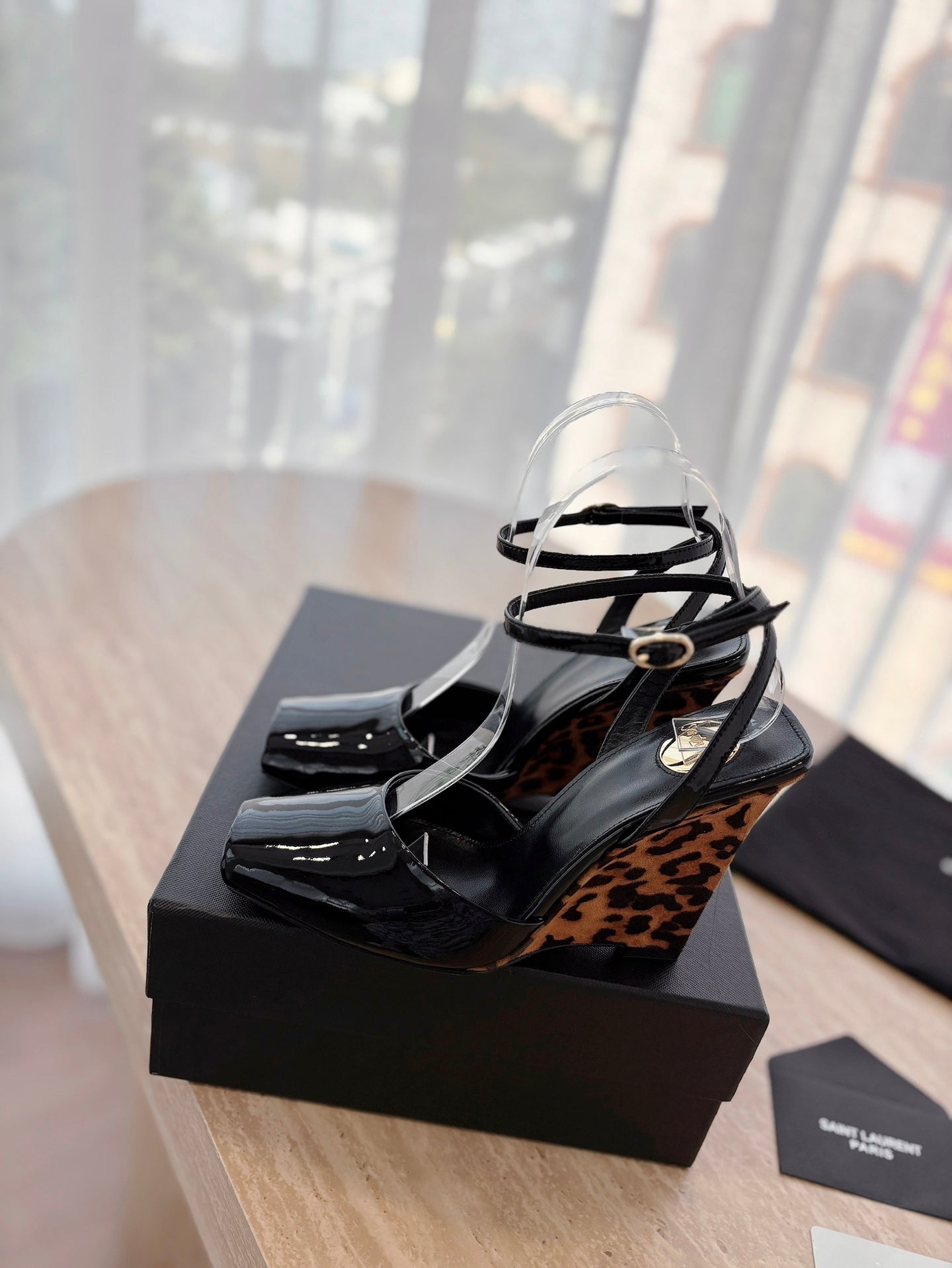 LA SCANDALE HIGH 10 CM WEDGE SANDALS IN BLACK PATENT LEATHER