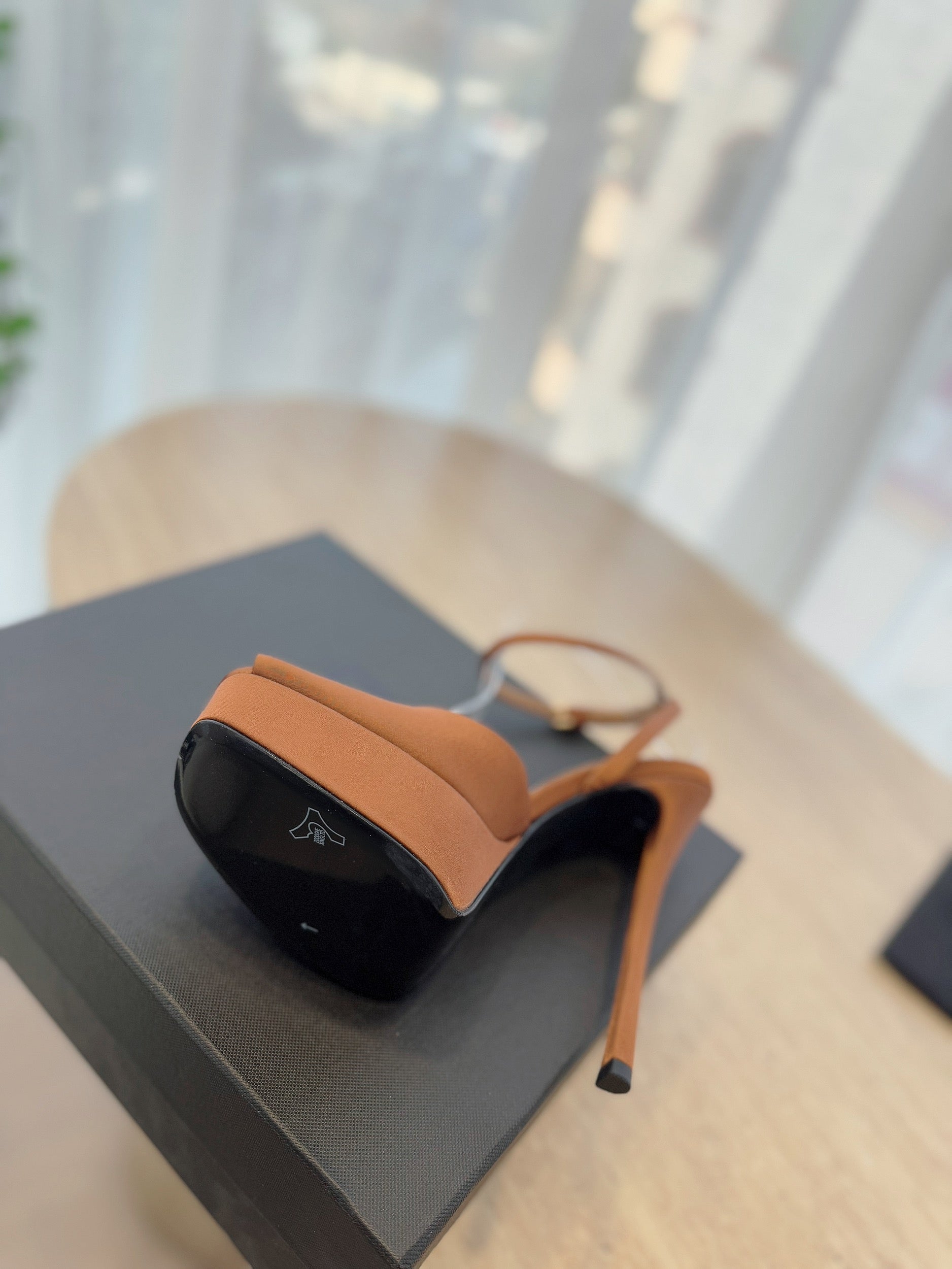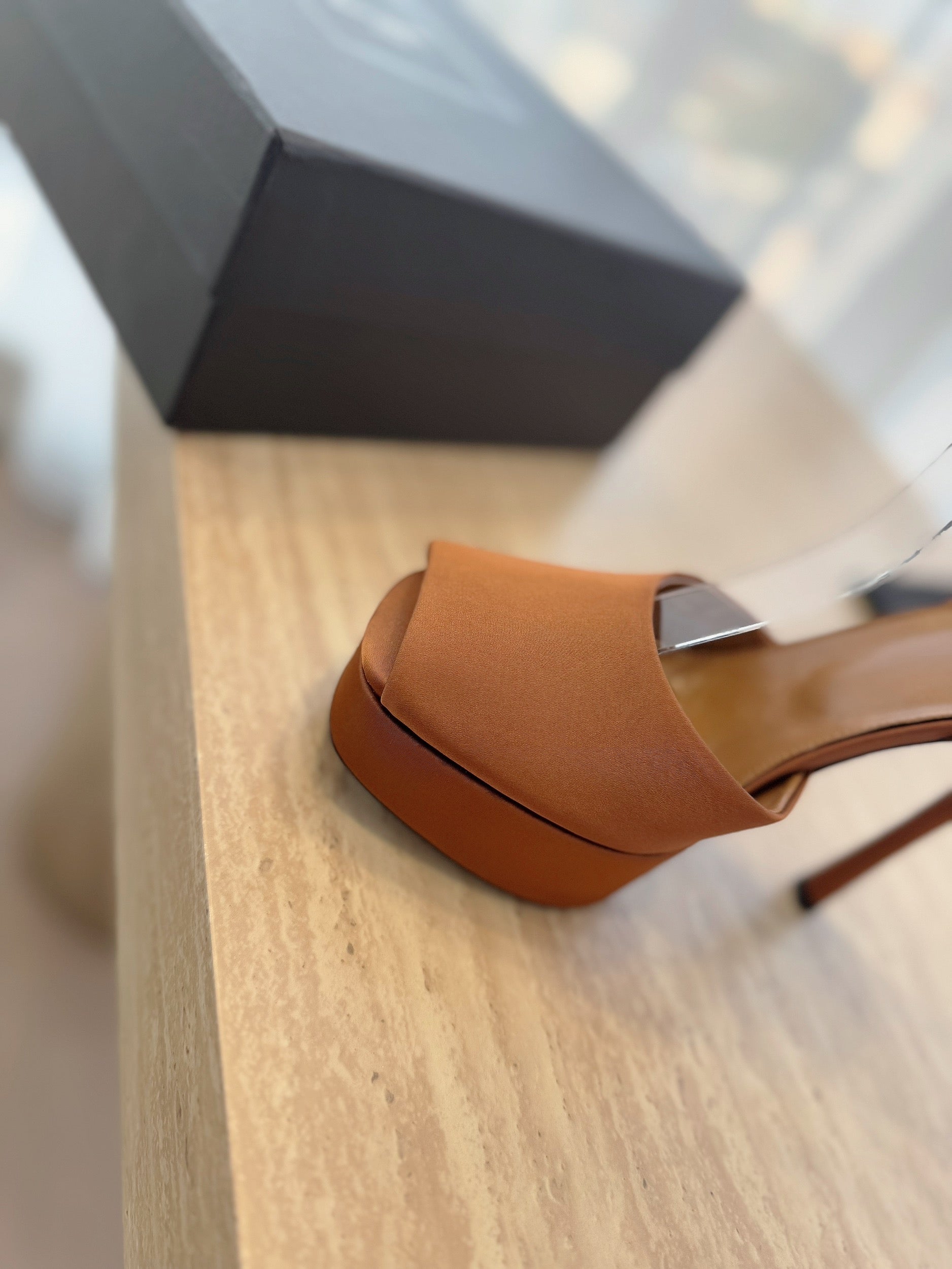 LA SCANDALE HIGH 14 CM PLATFORM SANDALS IN BRONZE BROWN SATIN CREPE