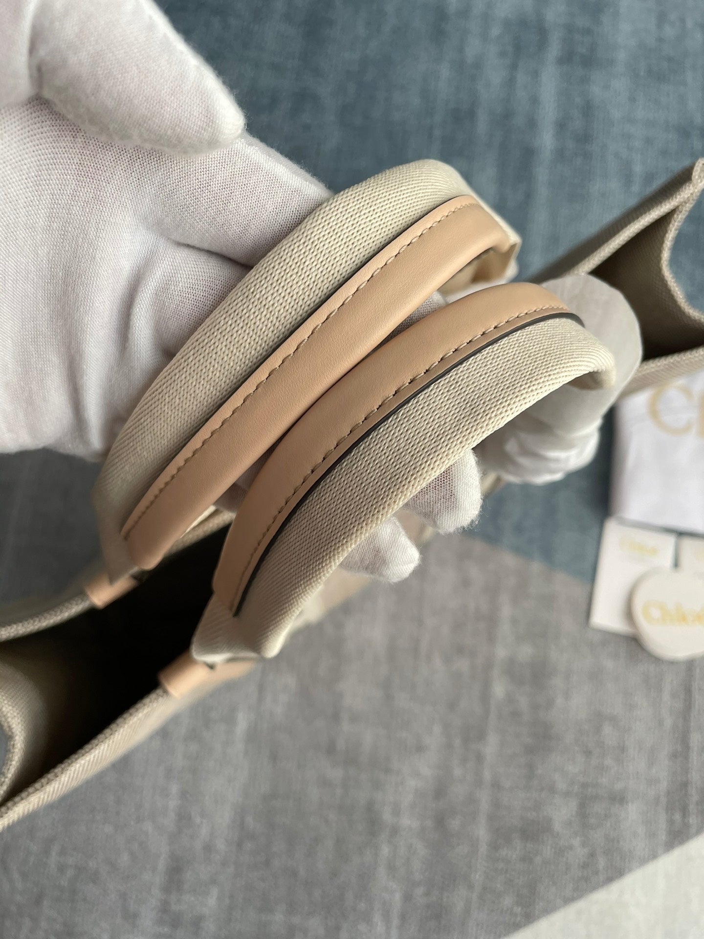 LAGRE WOODY TOTE BAG 45 IN BEIGE LINEN CANVAS BLACK WEBBING LOGO EMBROIDER NUDE CALFSKIN