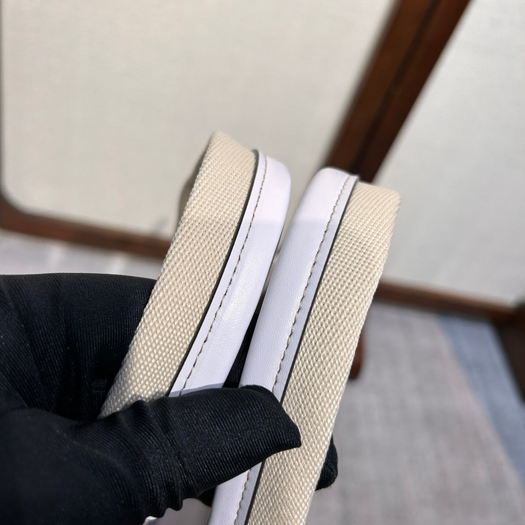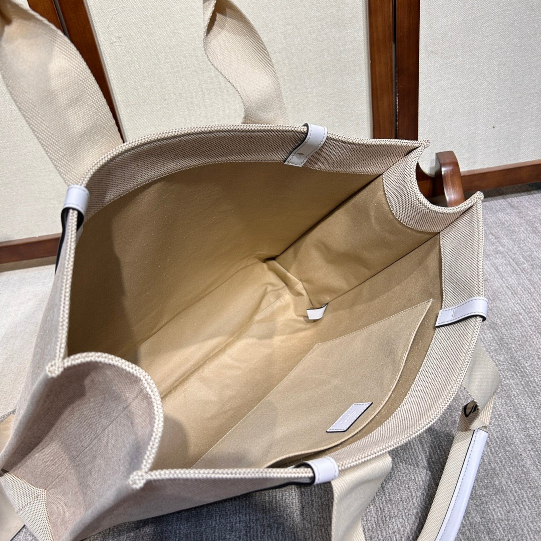 LAGRE WOODY TOTE BAG 45 IN BEIGE LINEN CANVAS BLACK WEBBING LOGO EMBROIDER WHITE CALFSKIN