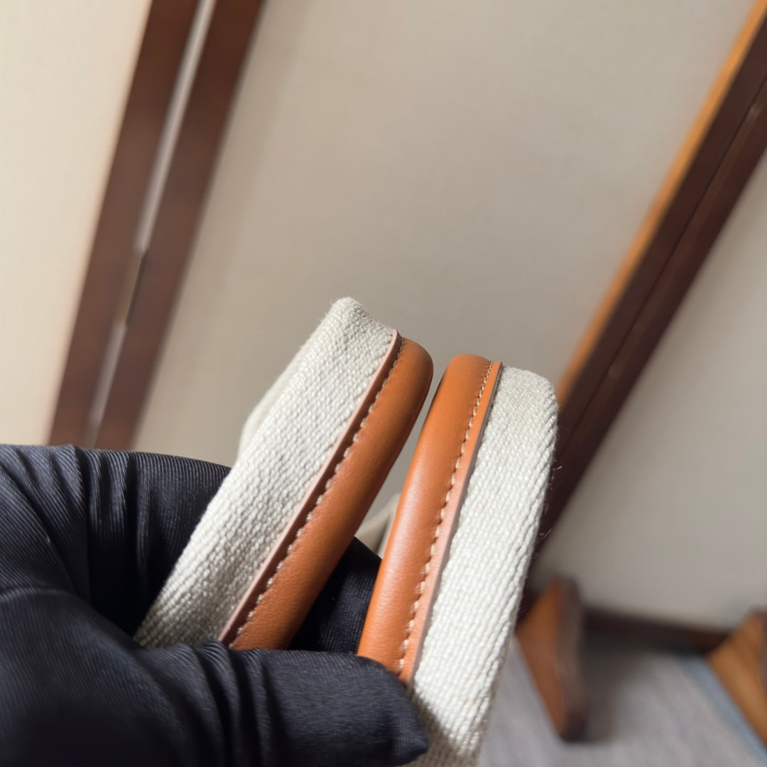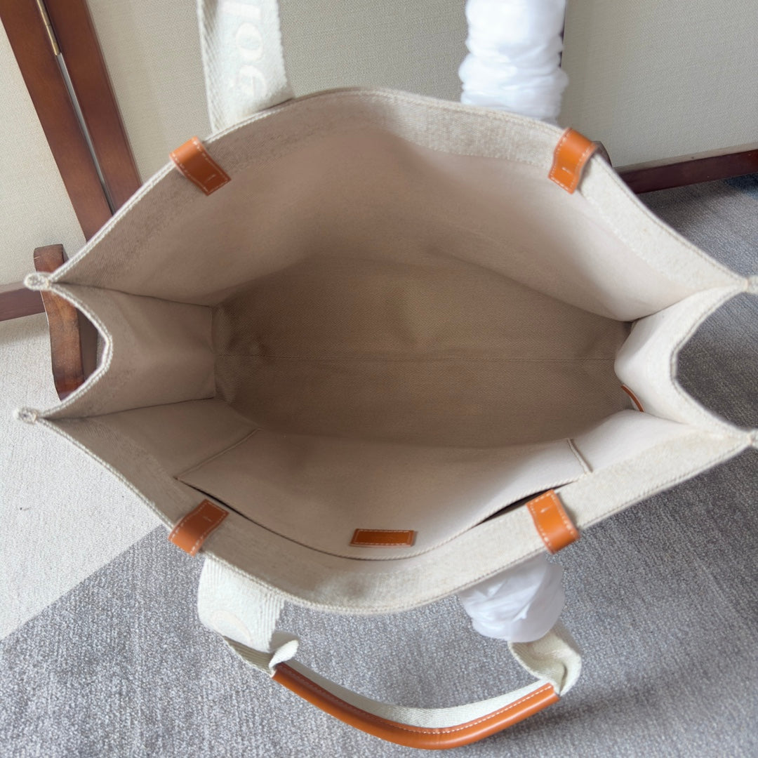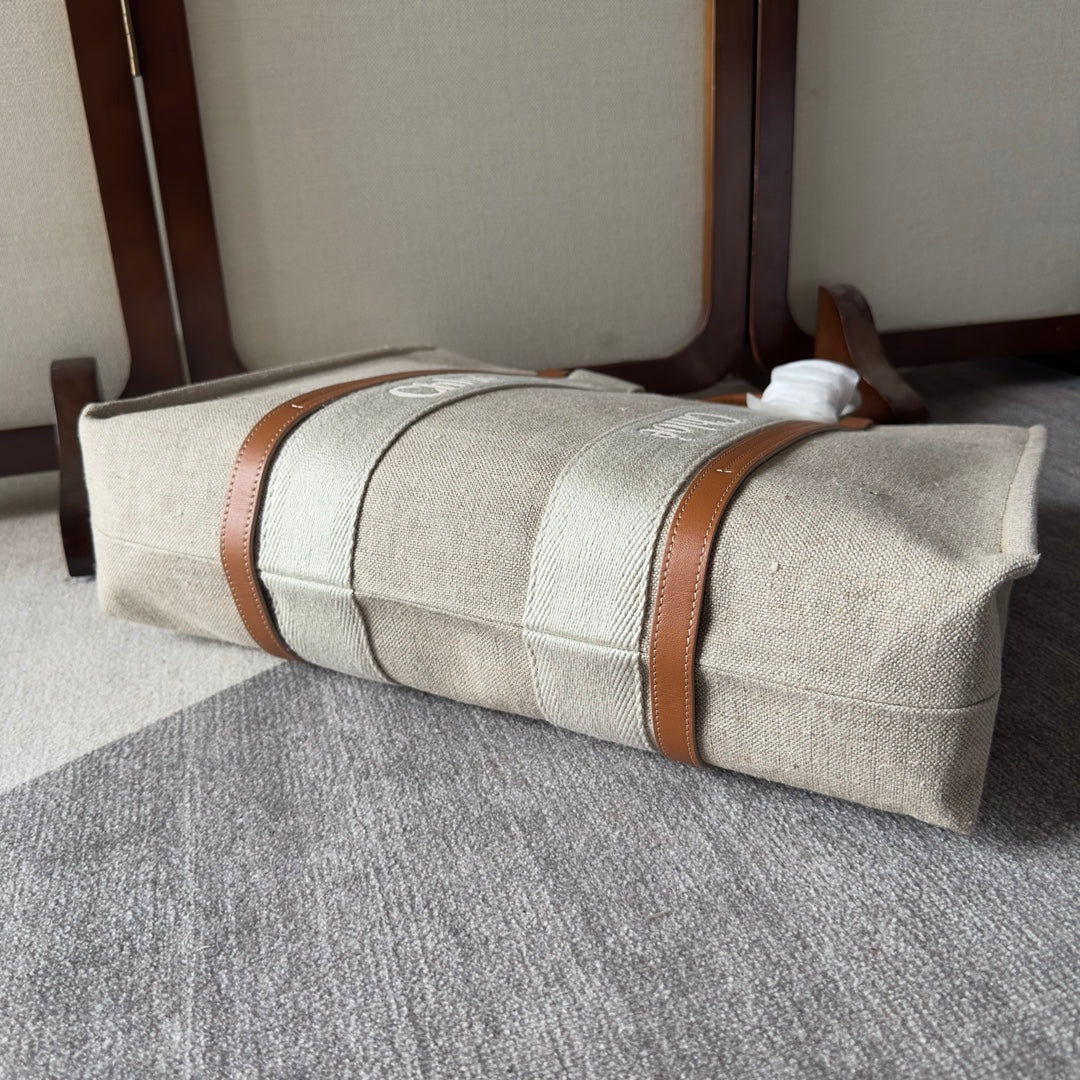 LAGRE WOODY TOTE BAG 45 IN BEIGE LINEN CANVAS WEBBING LOGO EMBROIDERY BROWN CALFSKIN