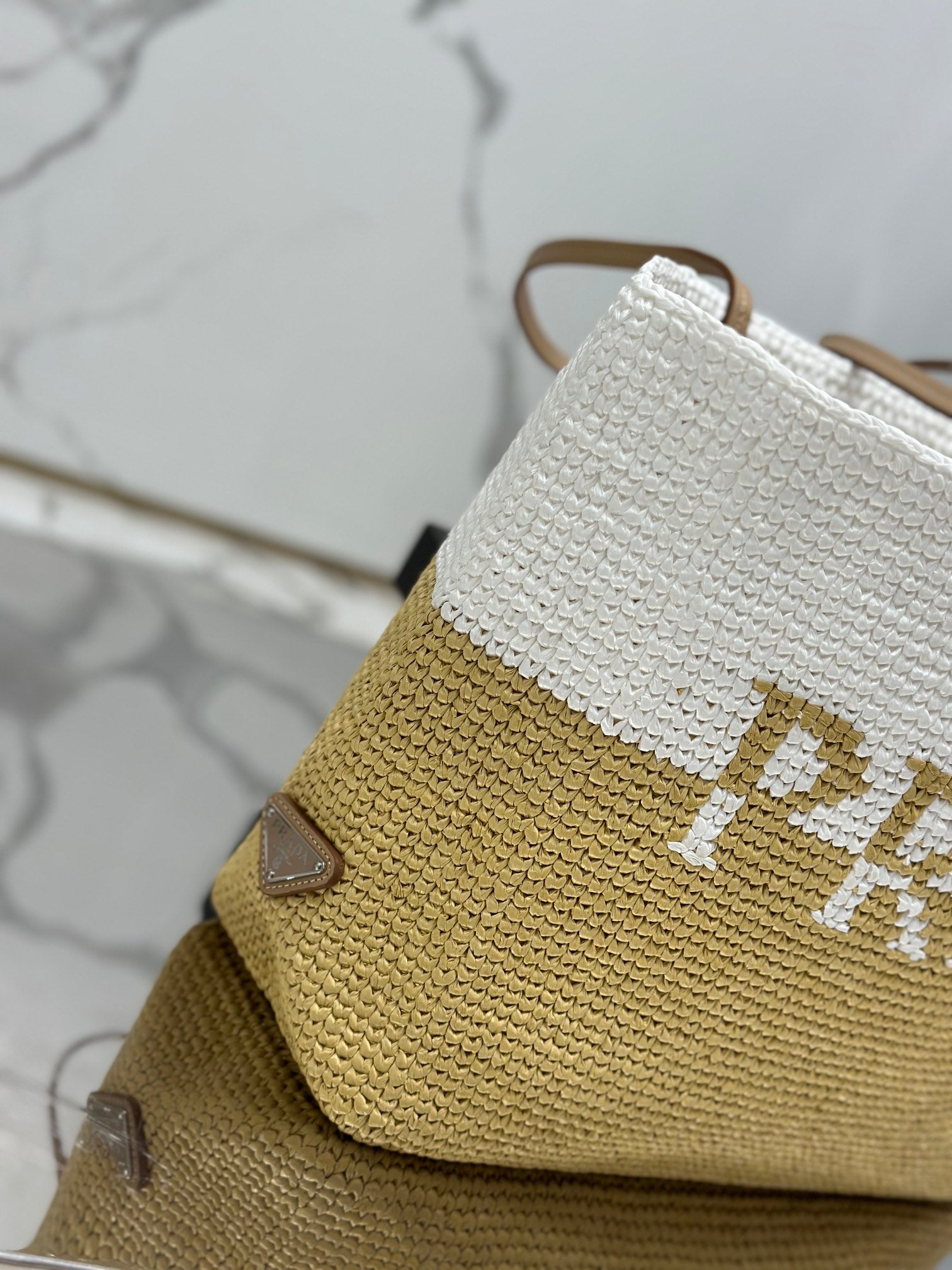LARGE TOTE BAG 37 IN WHITE MIX BEIGE RAFFIA AND BROWN CALFSKIN HANDLE