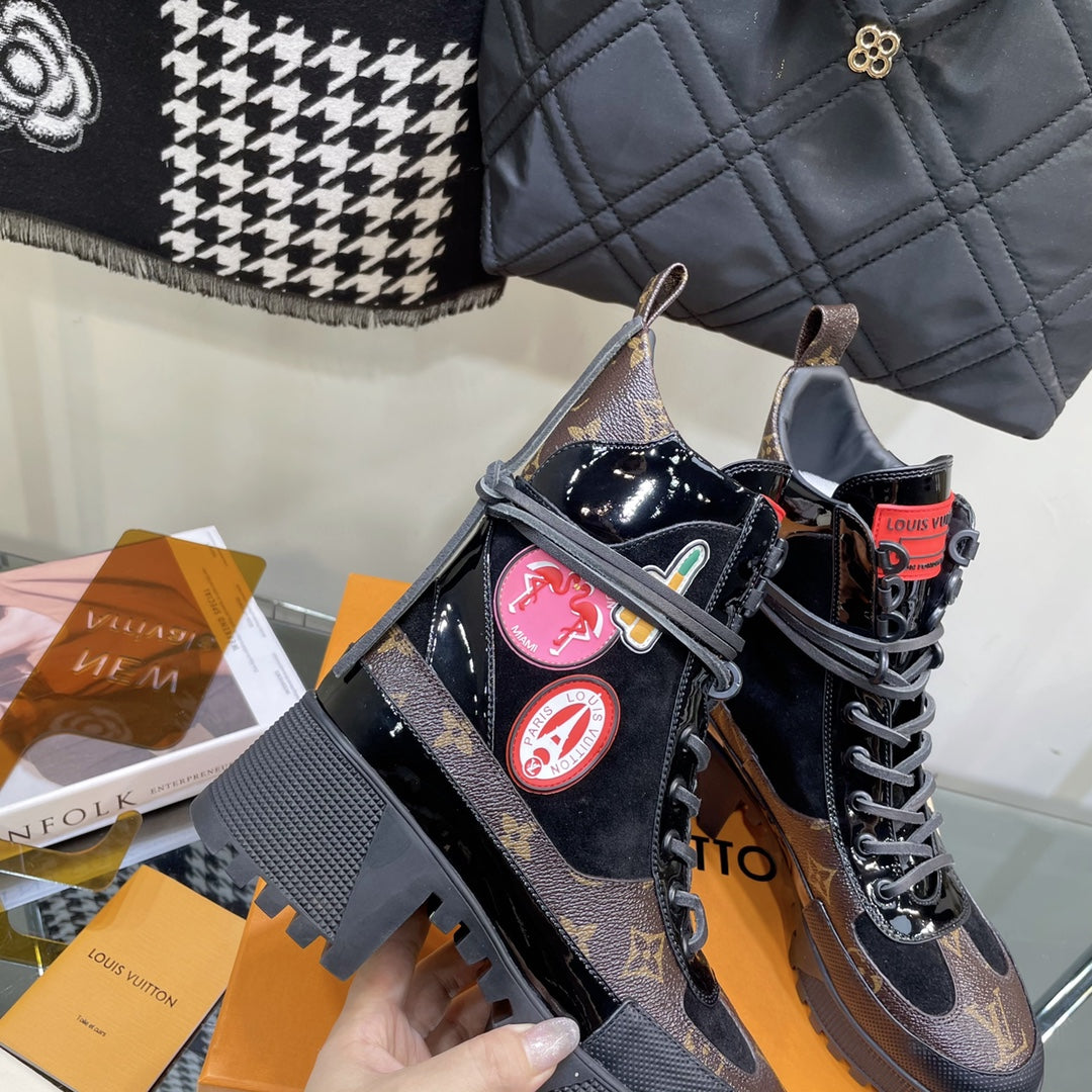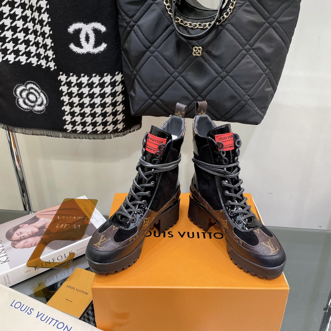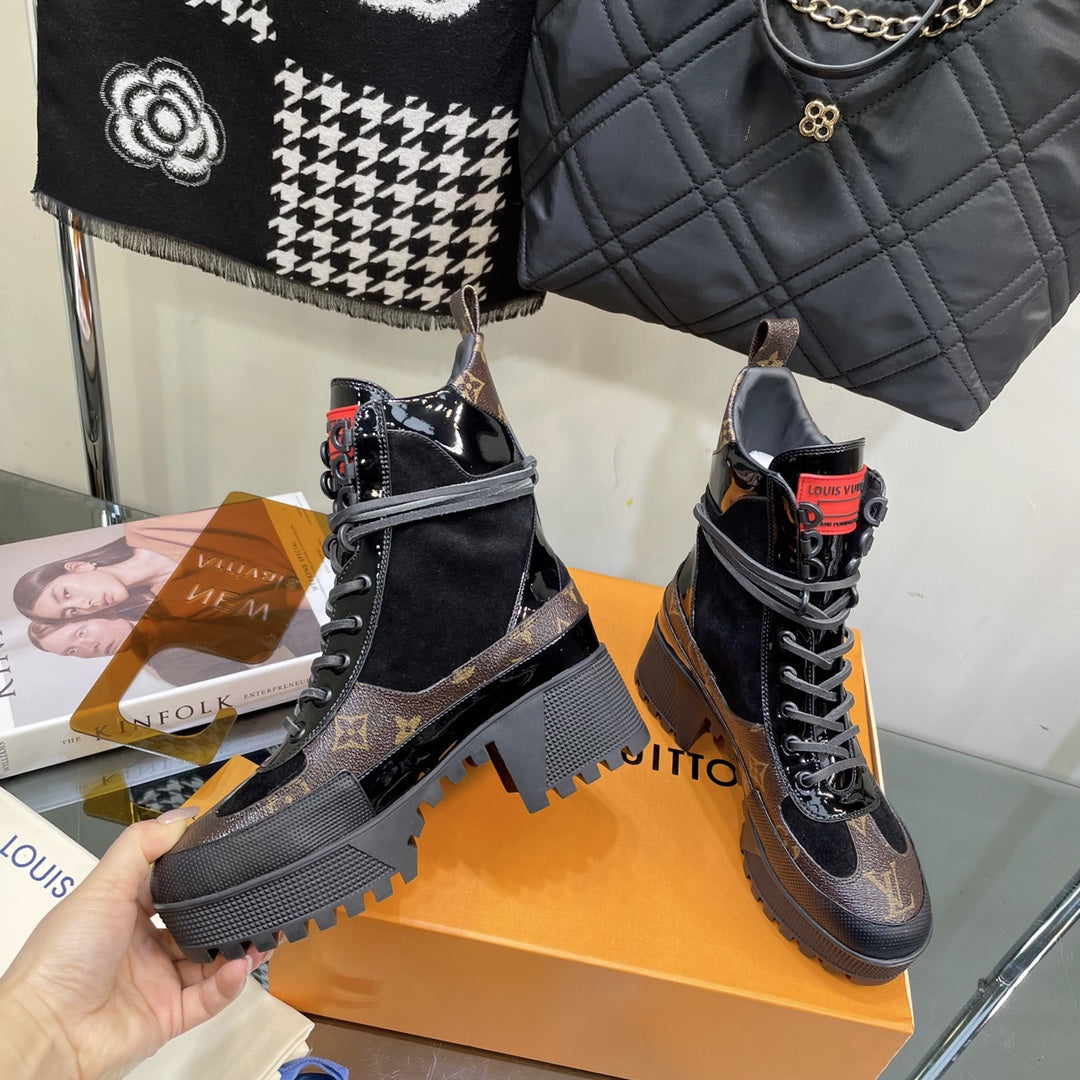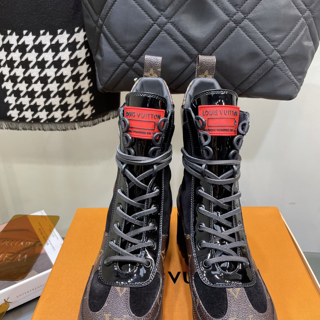 LAUREATE PLATFORM BOOTS IN BLACK SUEDE AND CHOCOLATE BROWN MONOGRAM CALFSKIN
