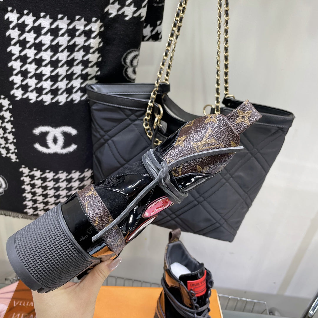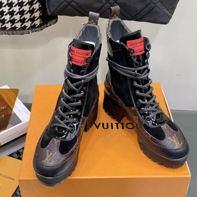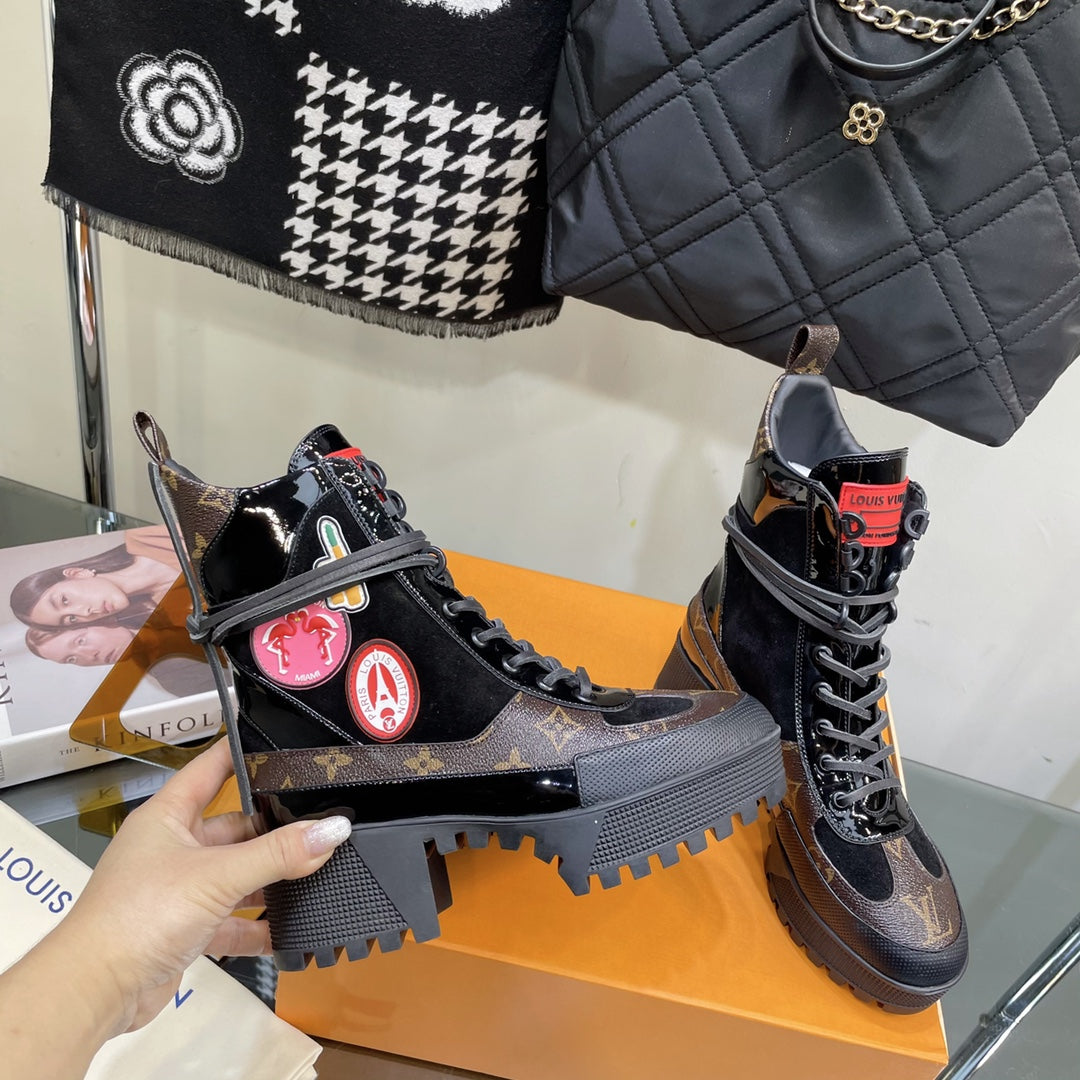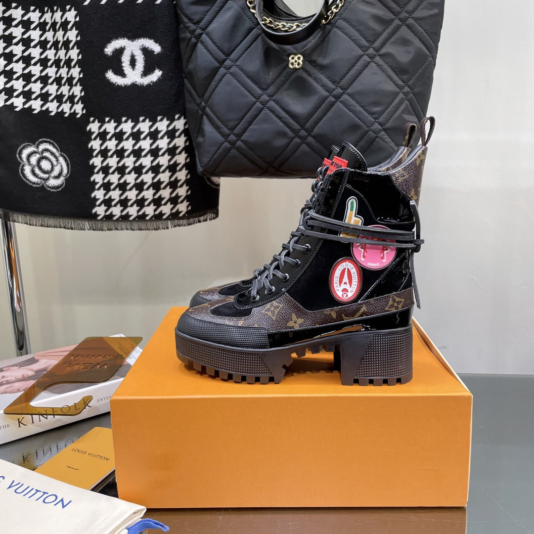 LAUREATE PLATFORM BOOTS IN BLACK SUEDE AND CHOCOLATE BROWN MONOGRAM CALFSKIN