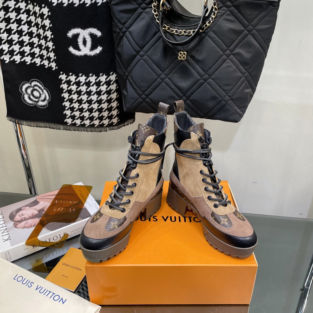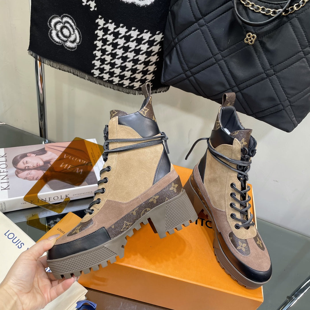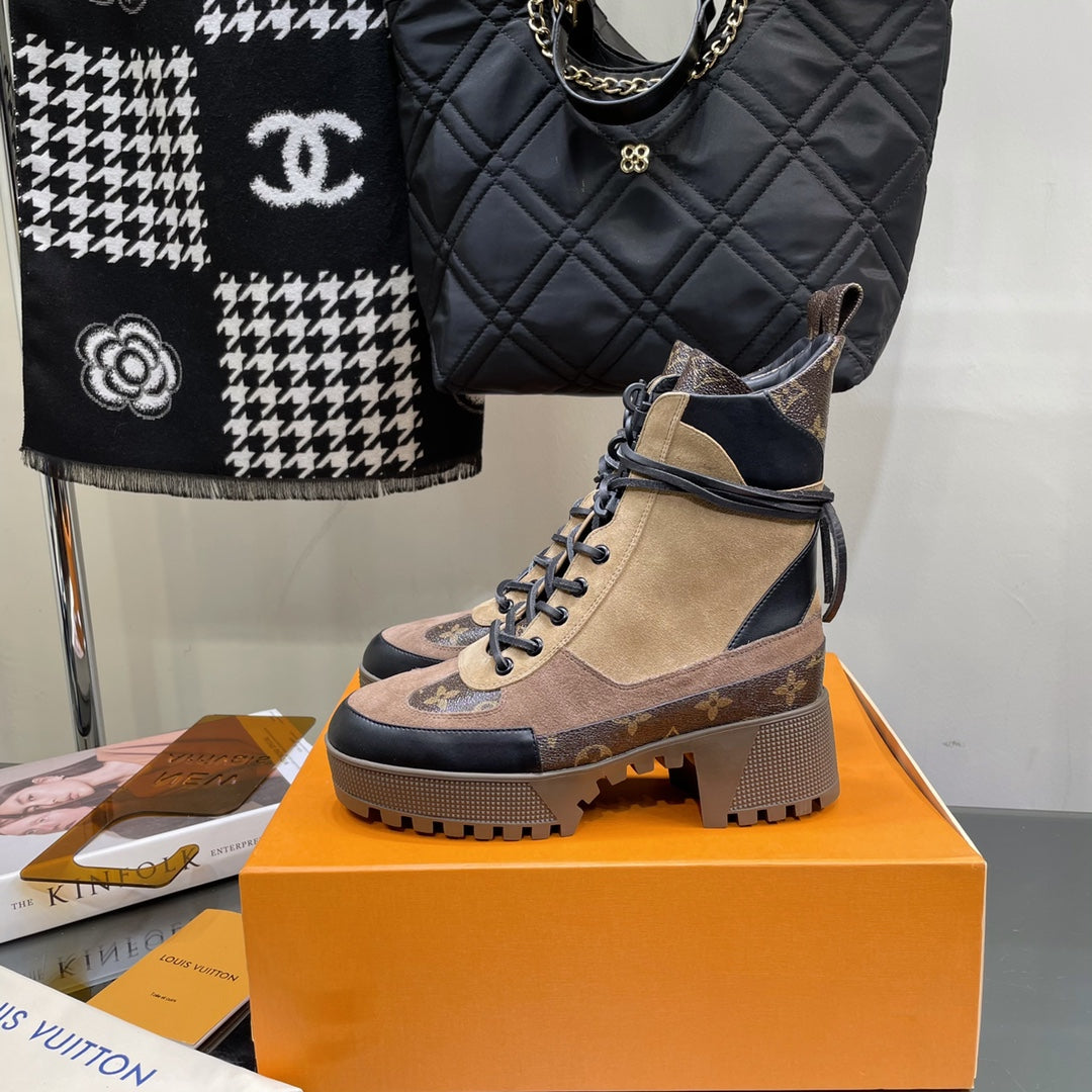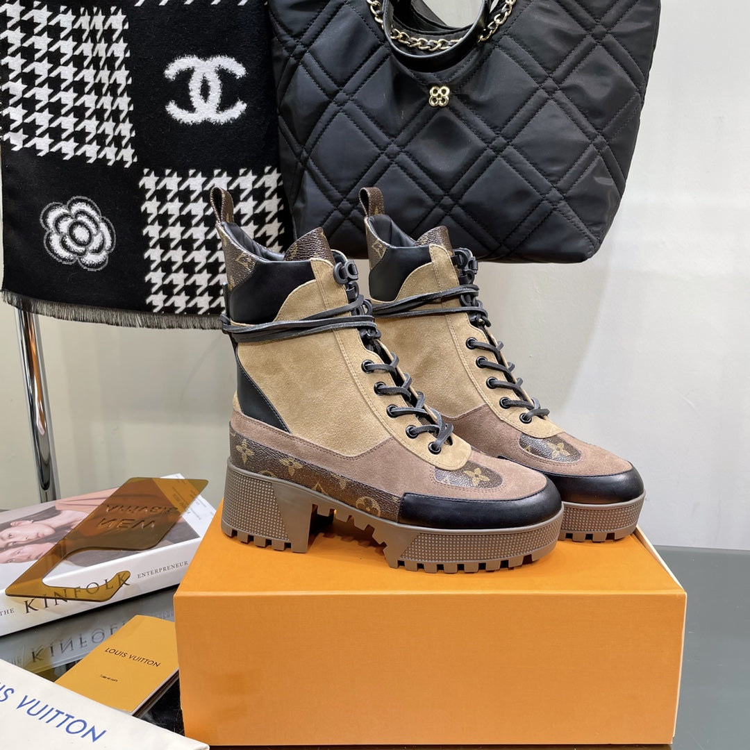 LAUREATE PLATFORM BOOTS IN CAMEL BROWN SUEDE AND CALFSKIN