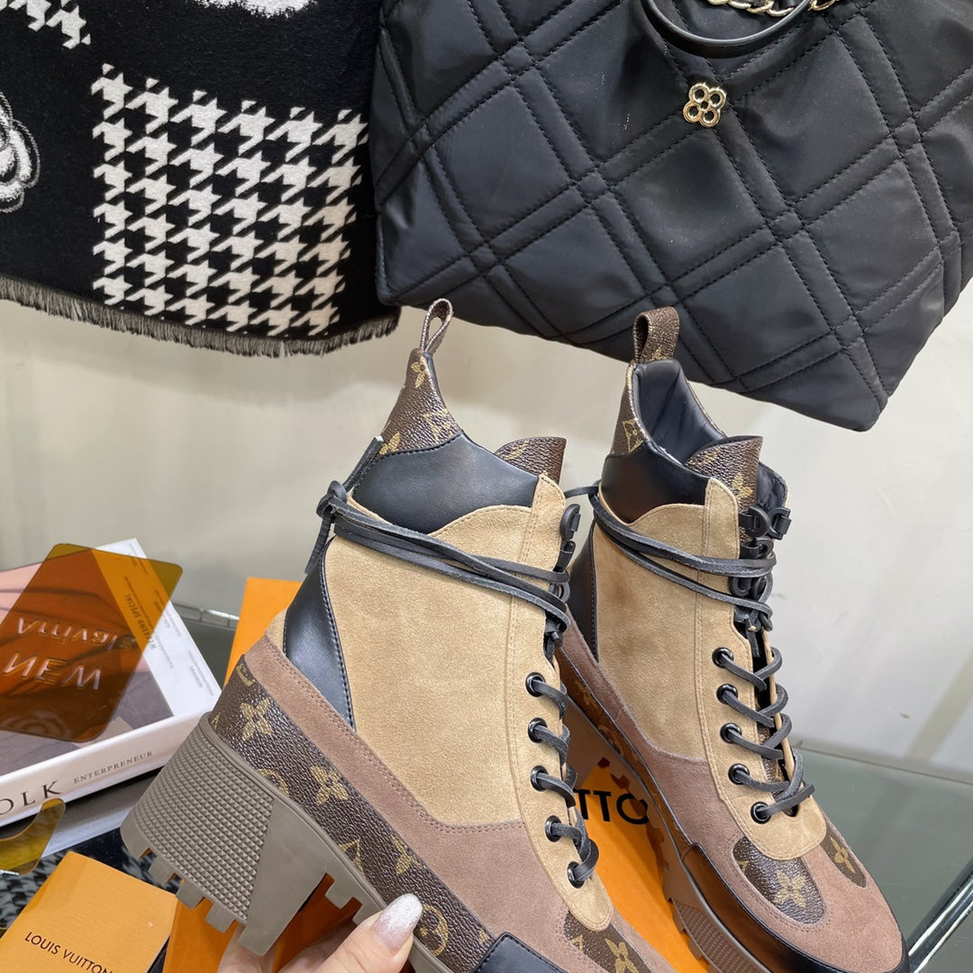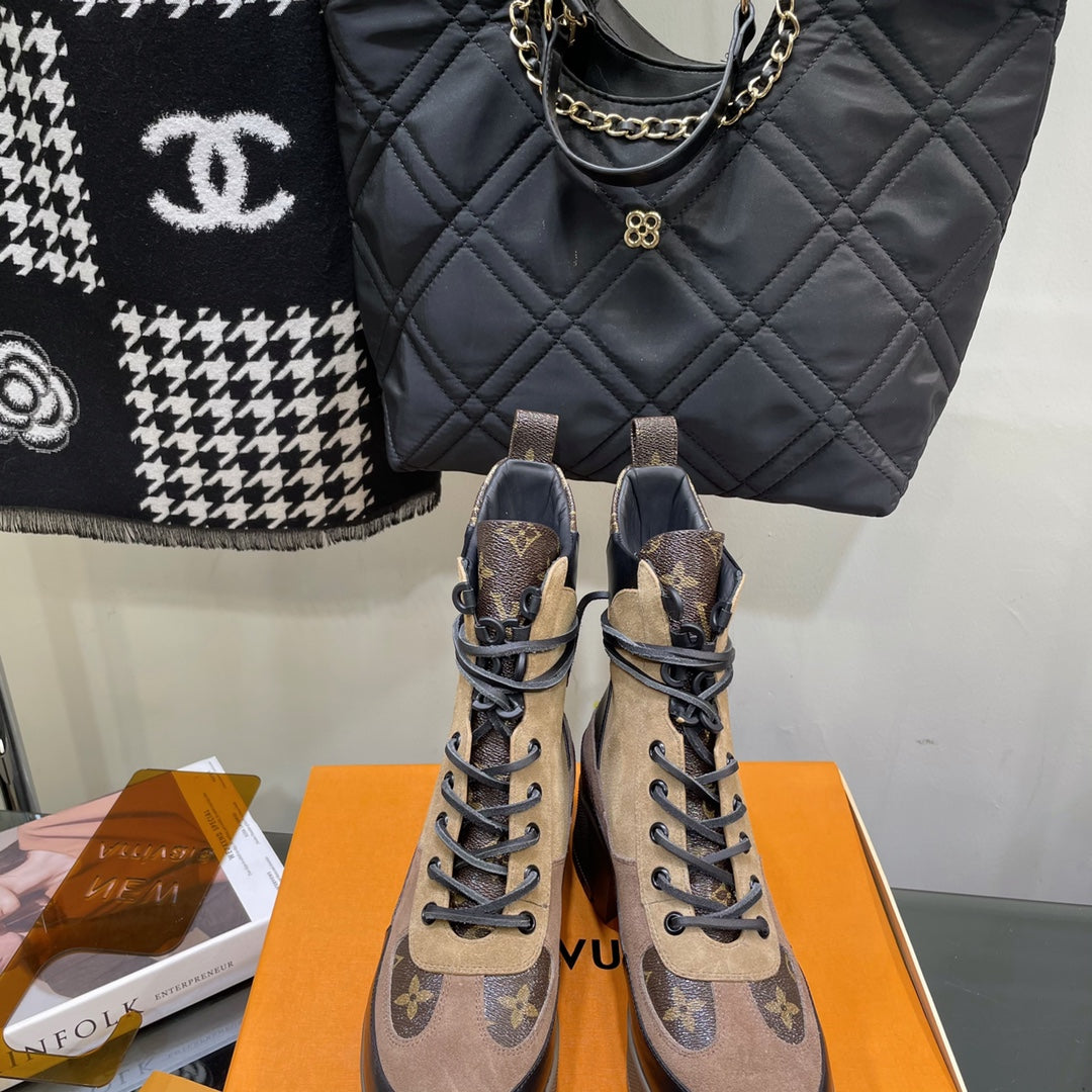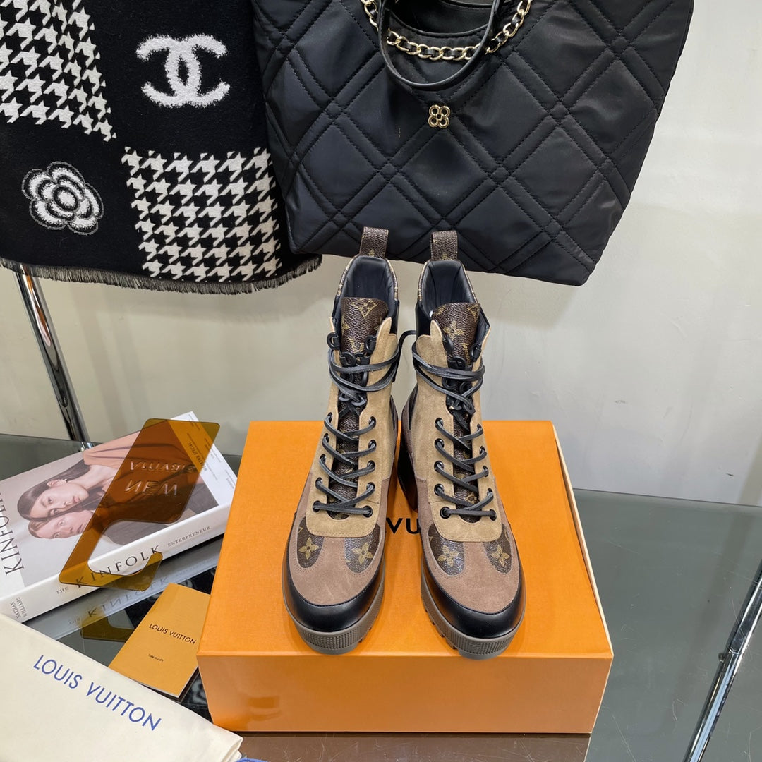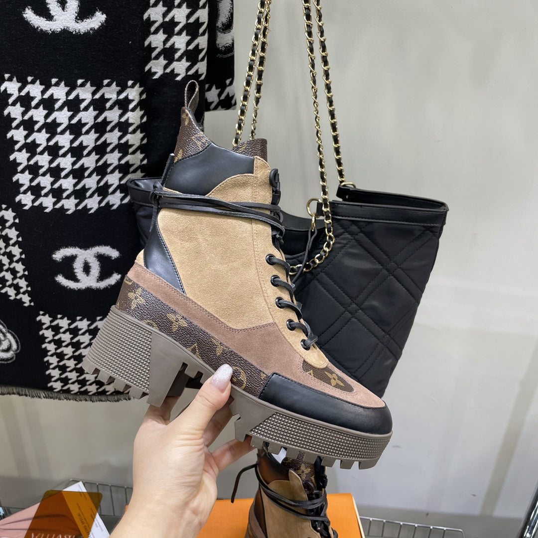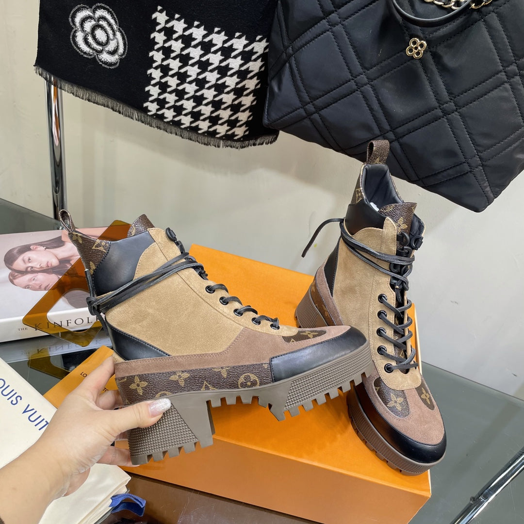 LAUREATE PLATFORM BOOTS IN CAMEL BROWN SUEDE AND CALFSKIN