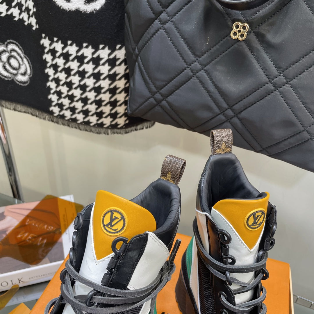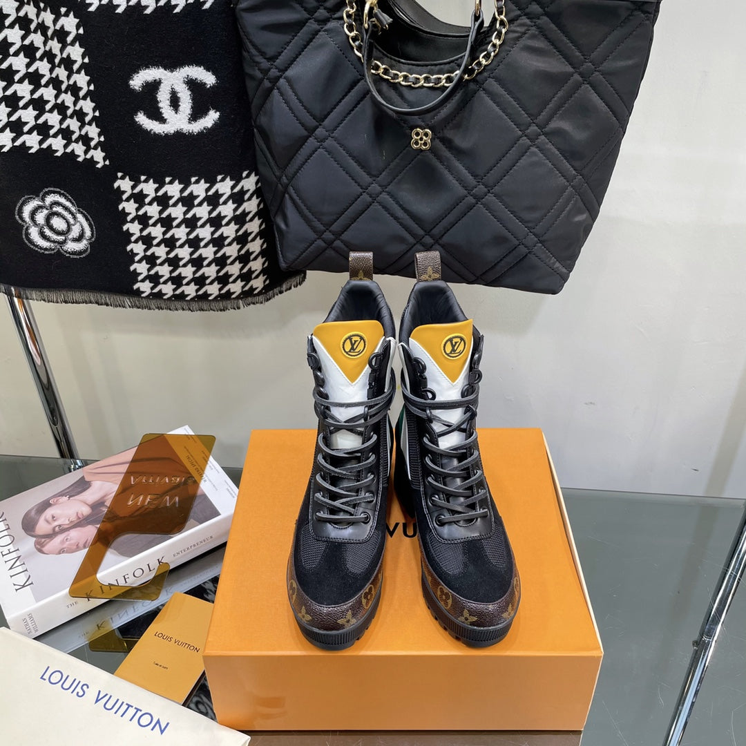 LAUREATE PLATFORM BOOTS IN COLORFUL SUEDE AND MONOGRAM CALFSKIN