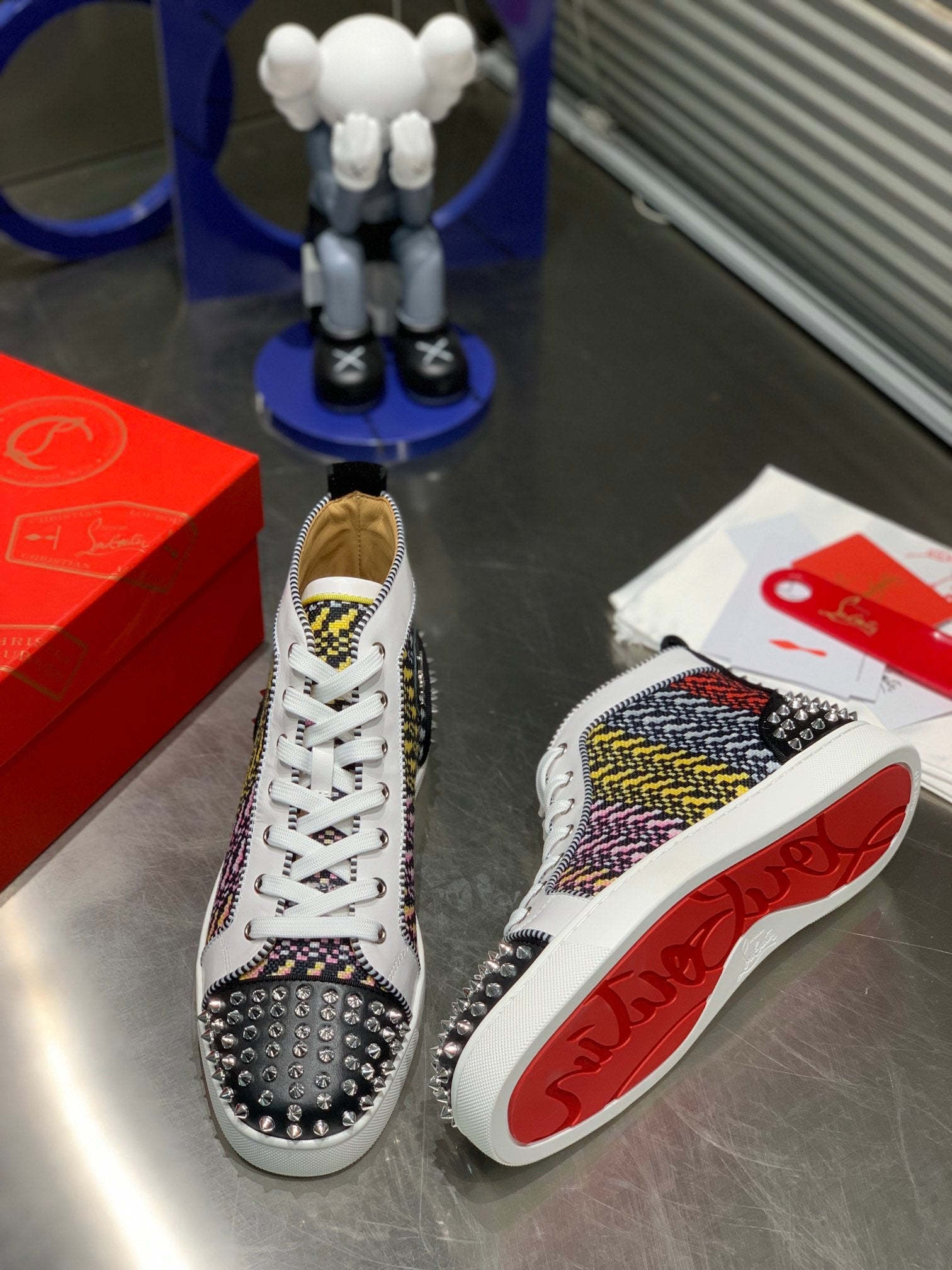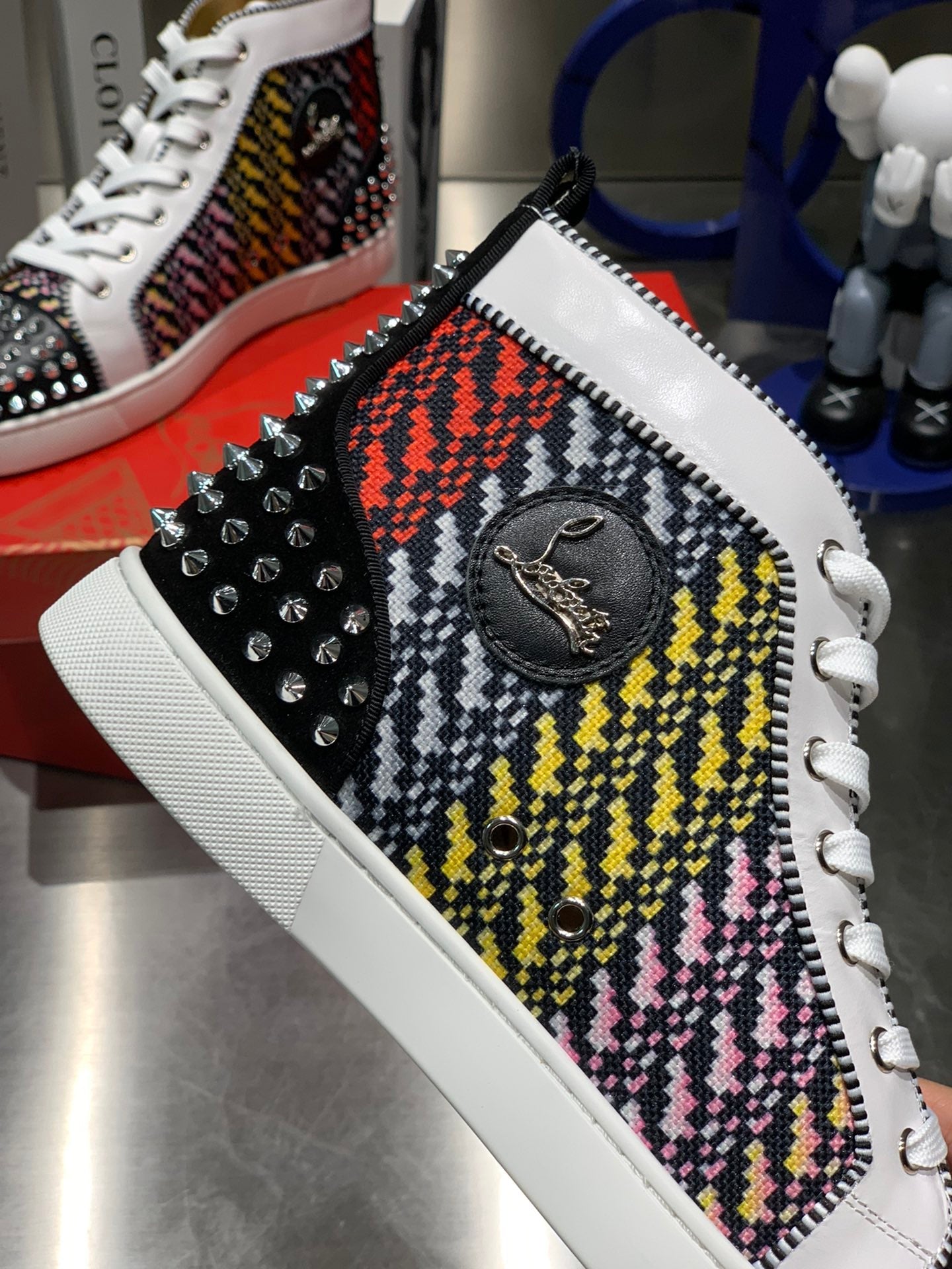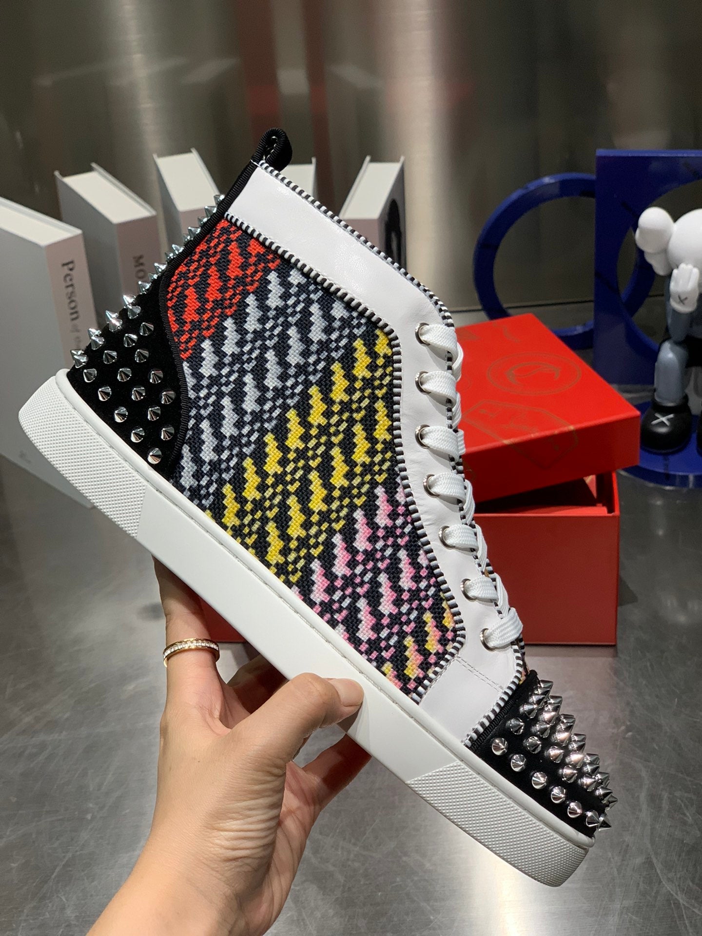 LOU SPIKES HIGH-TOP SNEAKERS IN MULTICOLOR WOVEN FABRIC MIX CALFSKIN