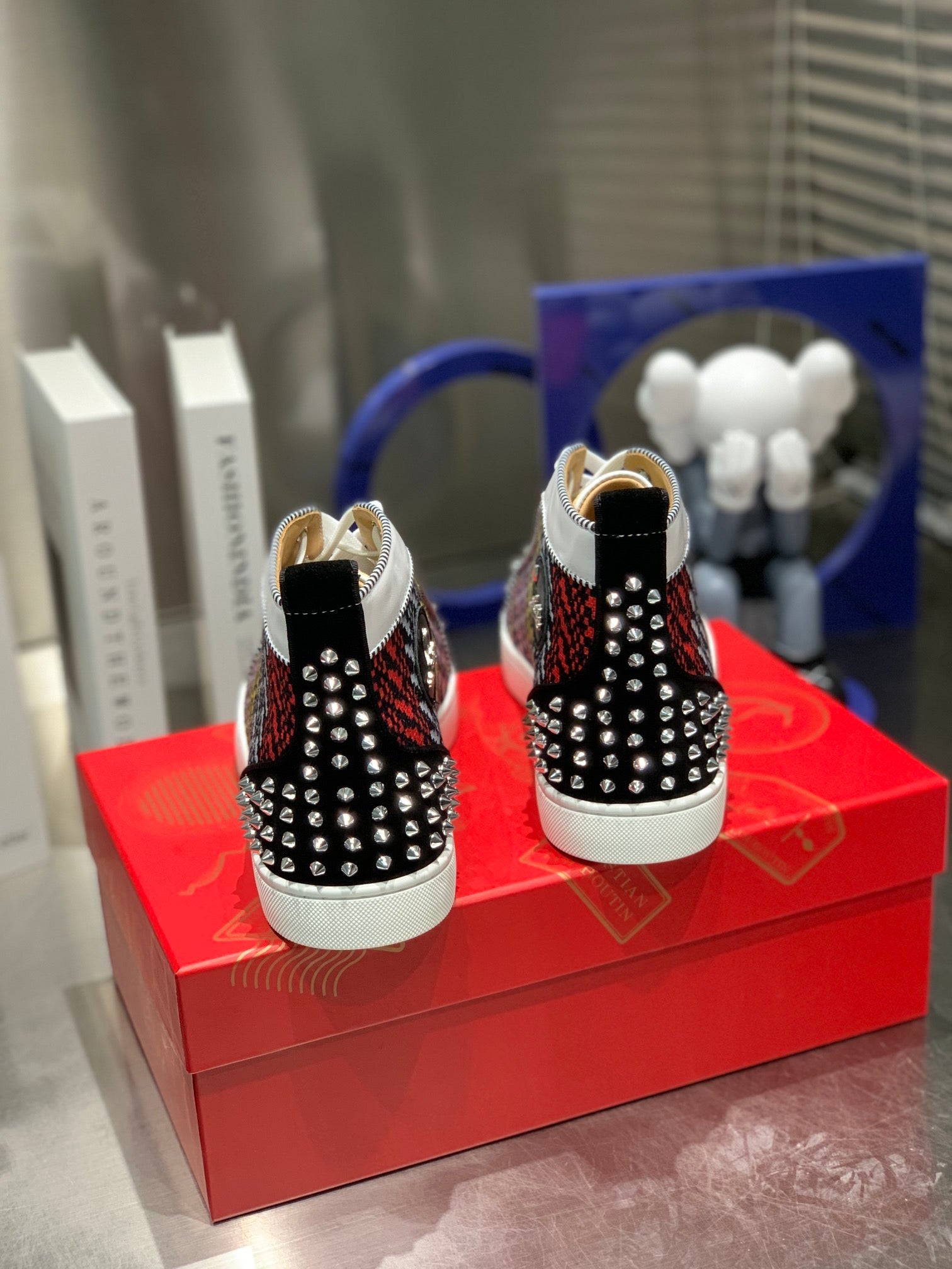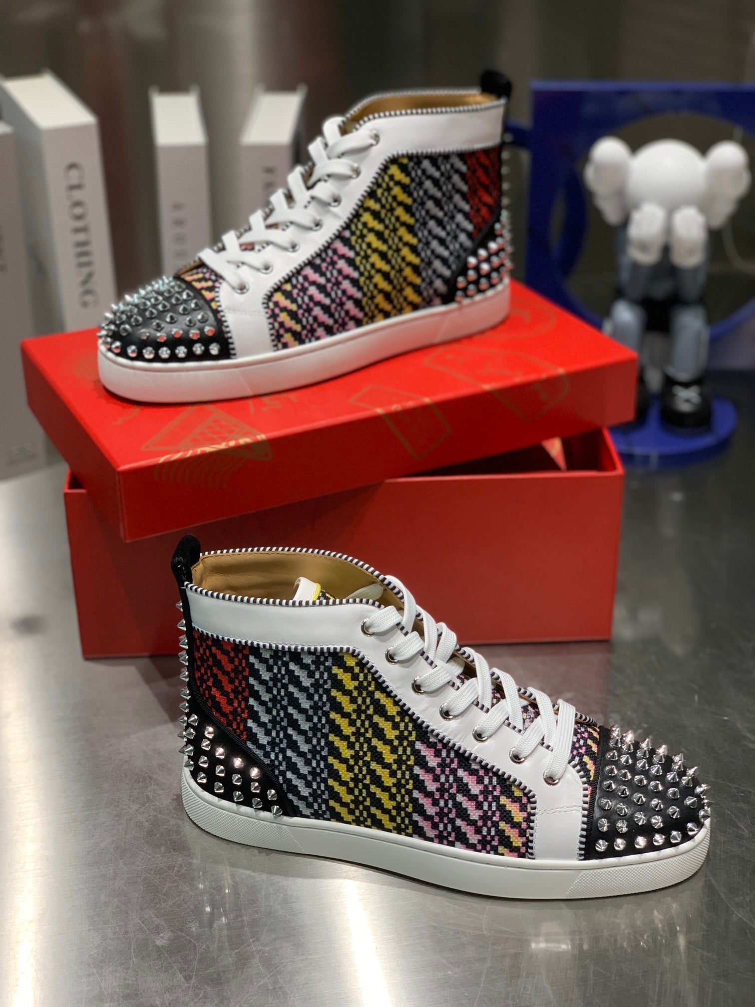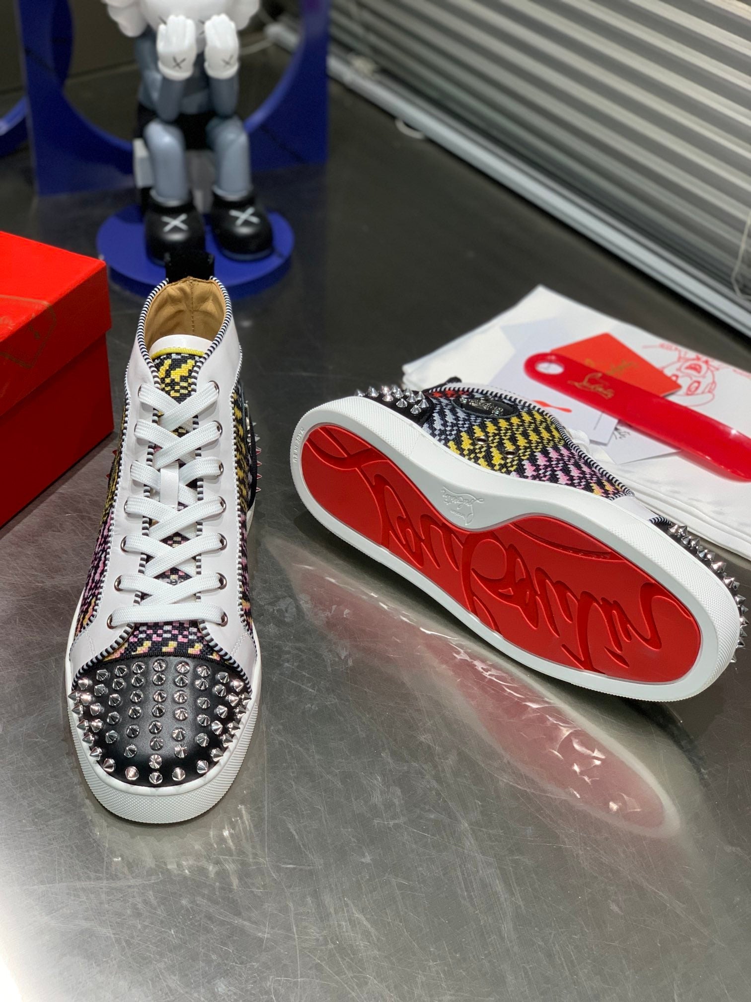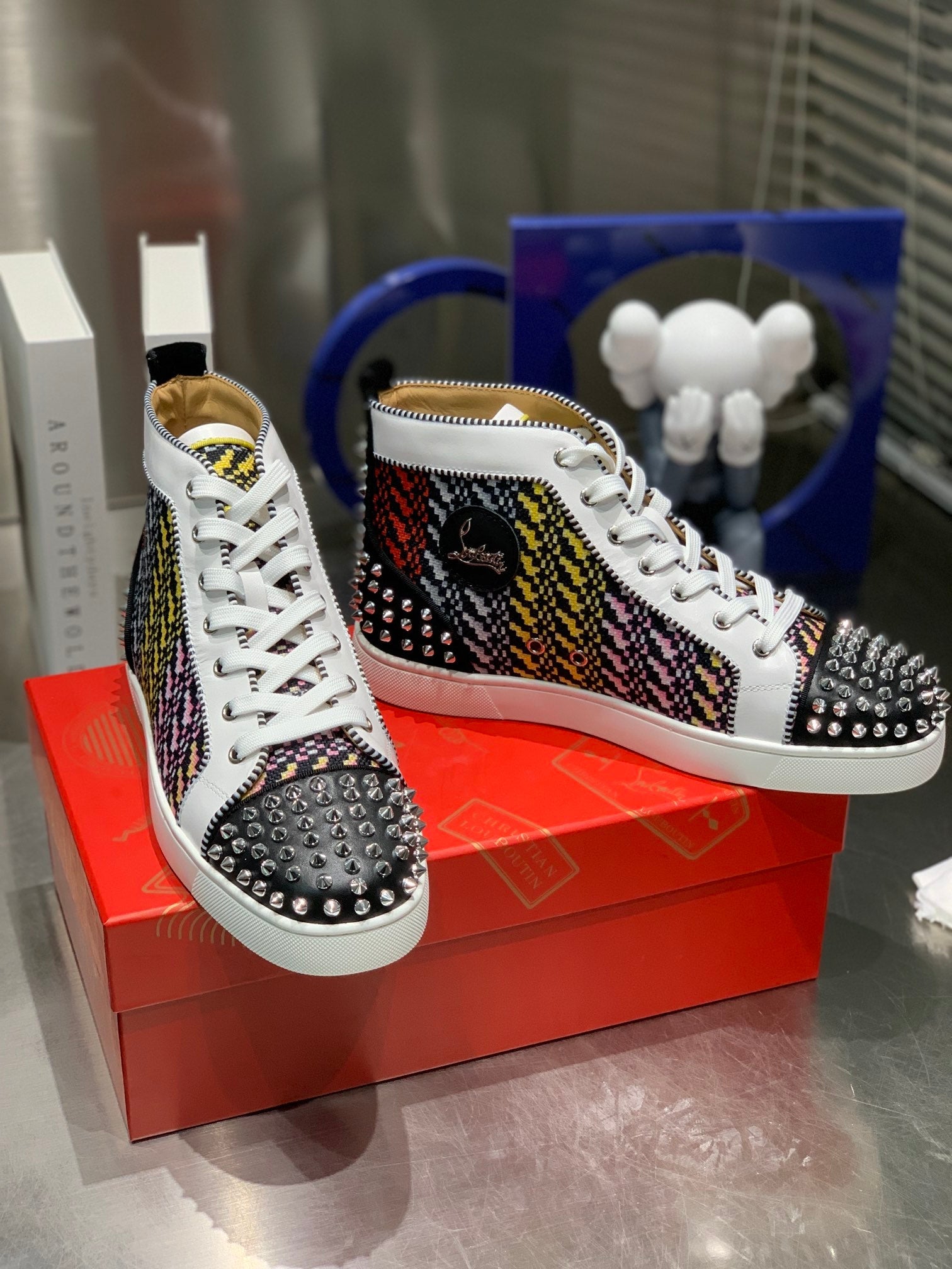 LOU SPIKES HIGH-TOP SNEAKERS IN MULTICOLOR WOVEN FABRIC MIX CALFSKIN
