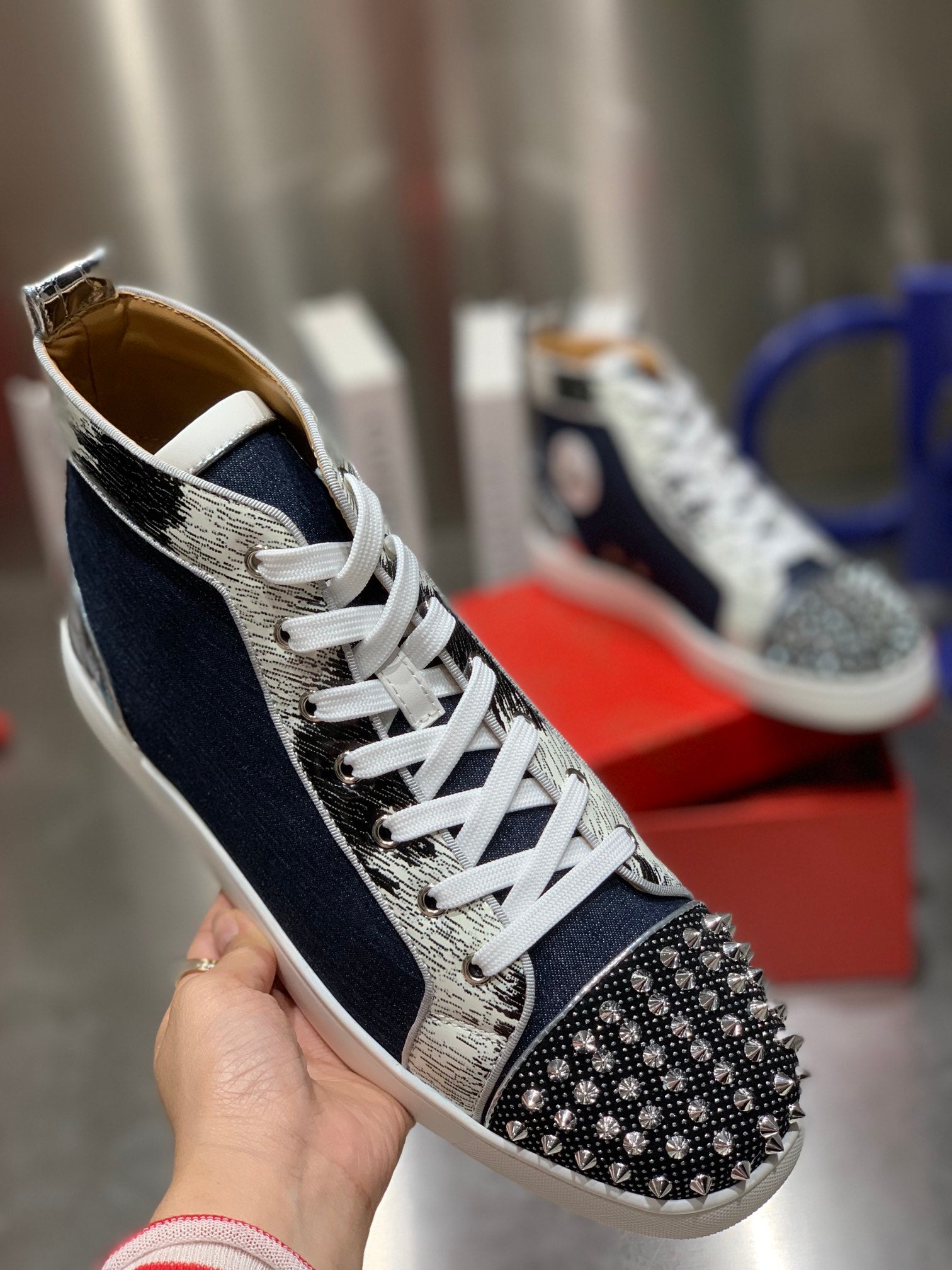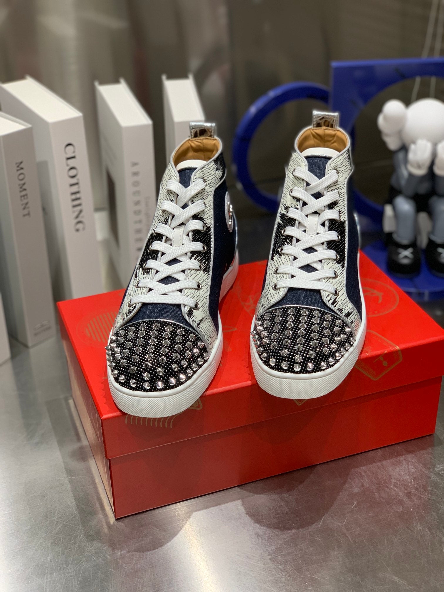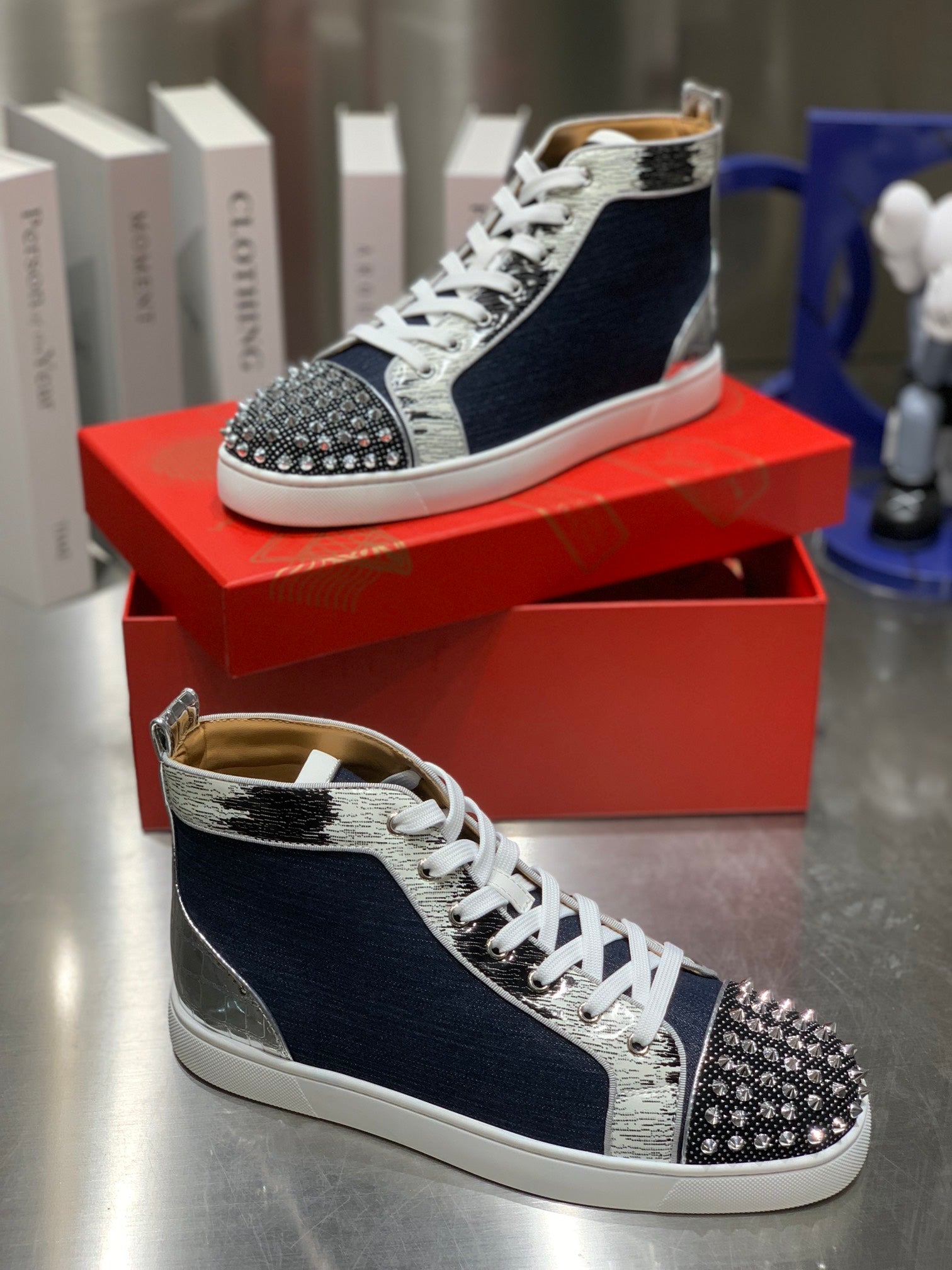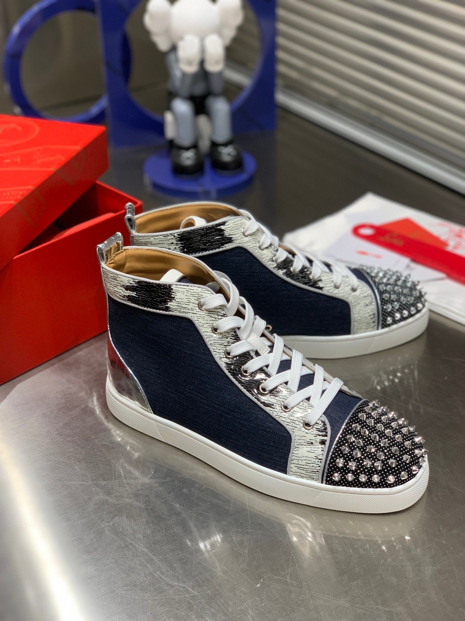 LOU SPIKES STUDDED HIGH-TOP SNEAKERS IN NAVY BLUE FABRIC AND CALFSKIN