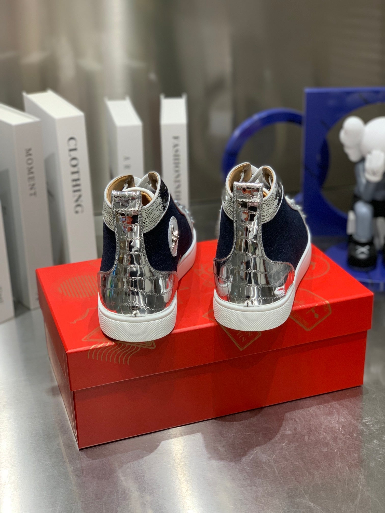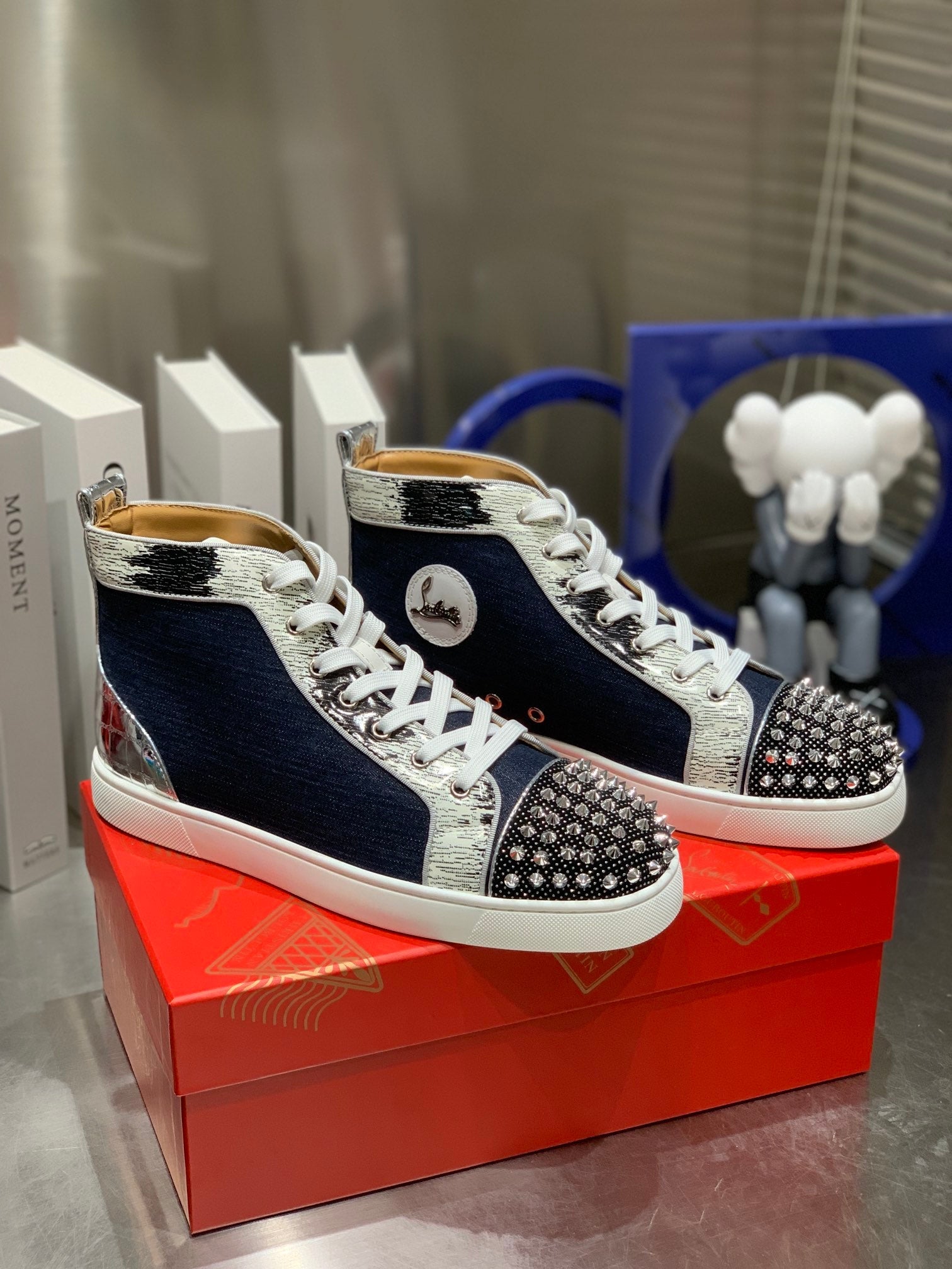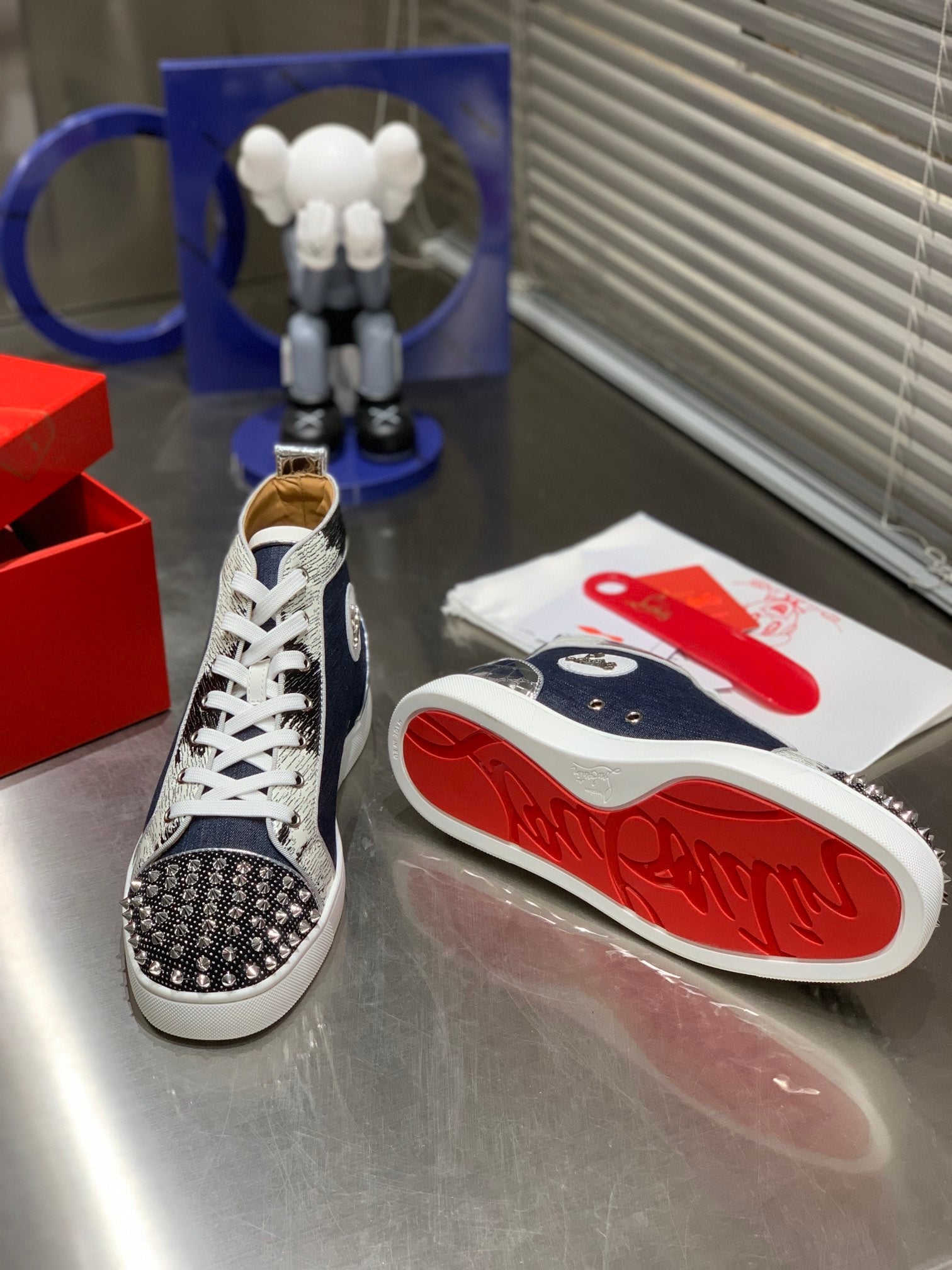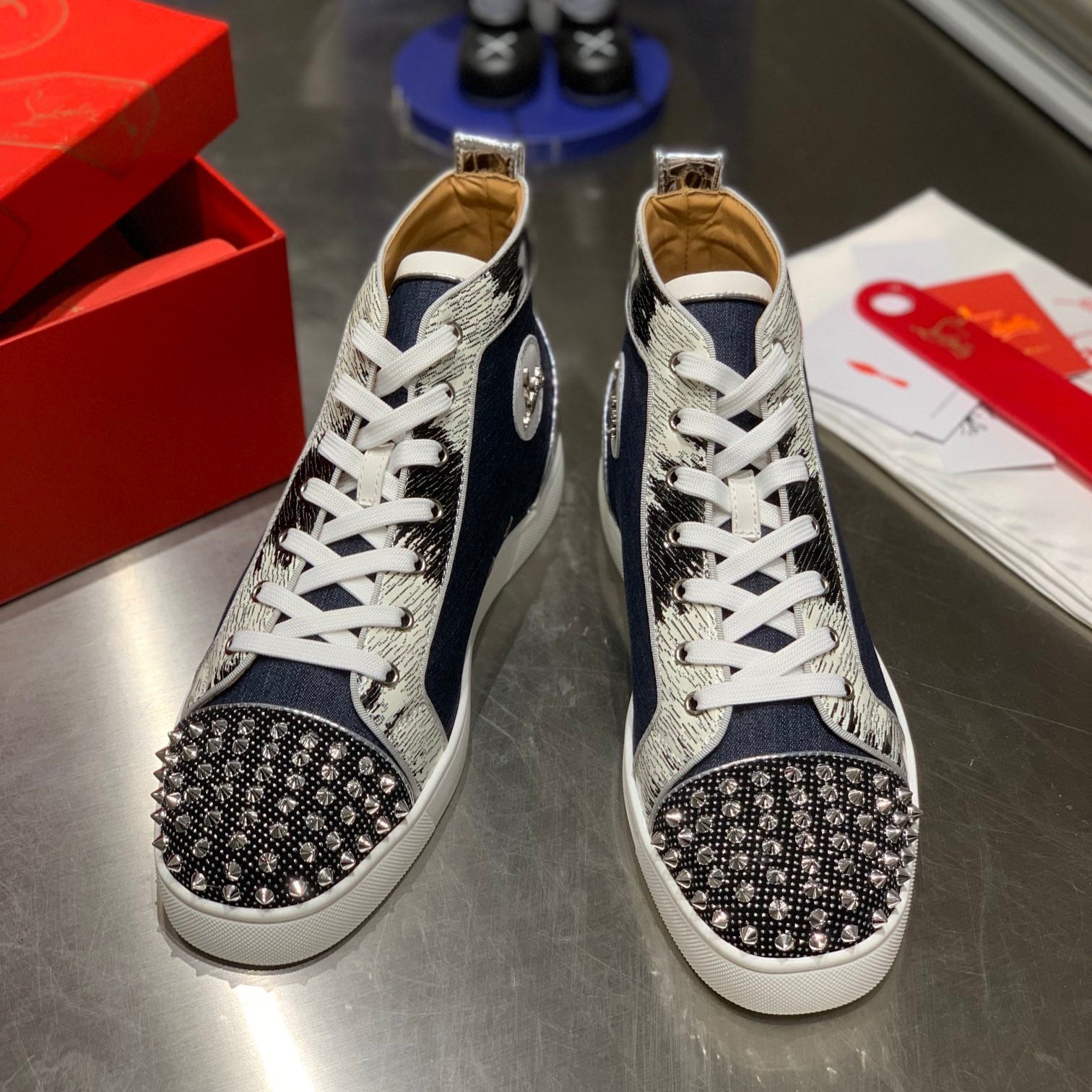 LOU SPIKES STUDDED HIGH-TOP SNEAKERS IN NAVY BLUE FABRIC AND CALFSKIN