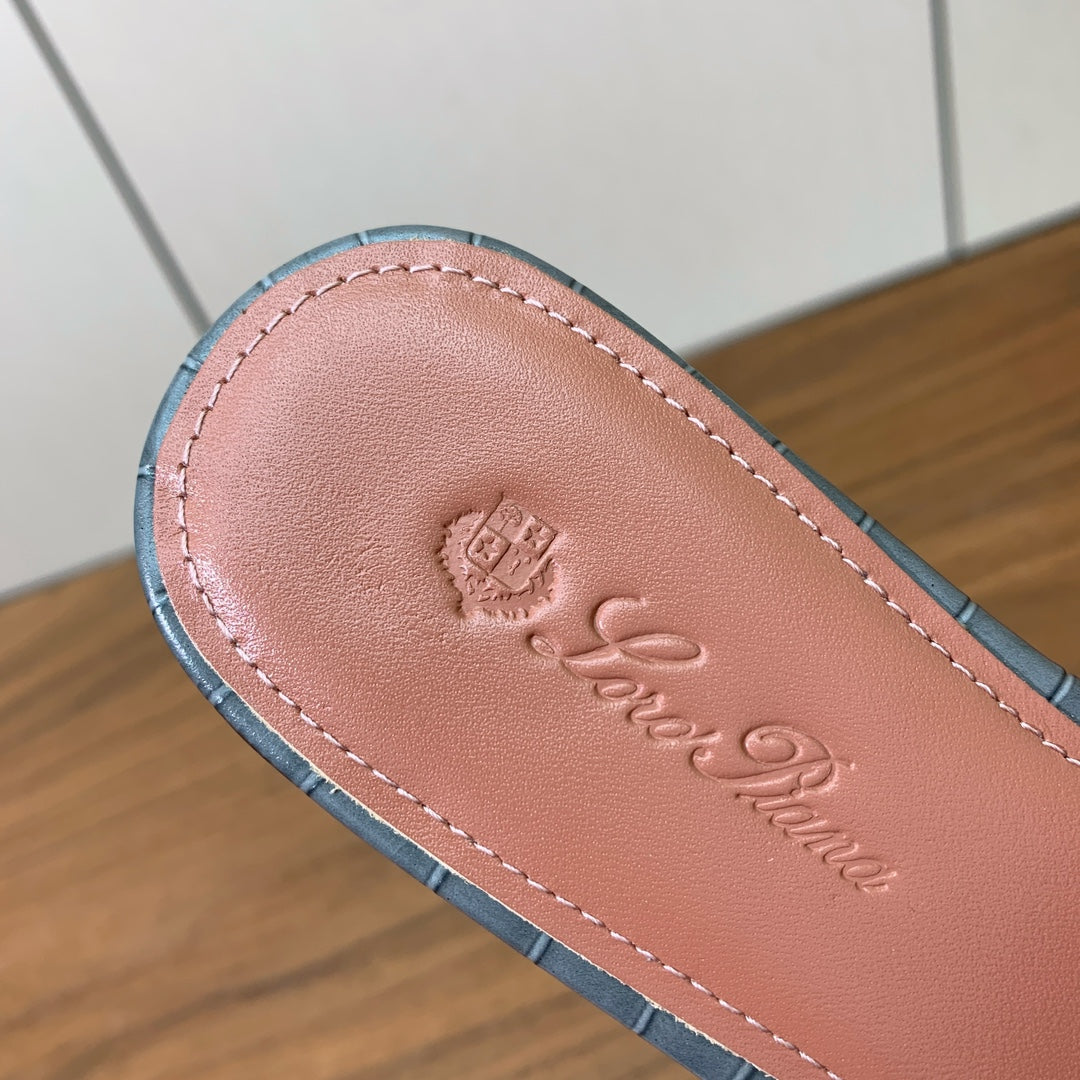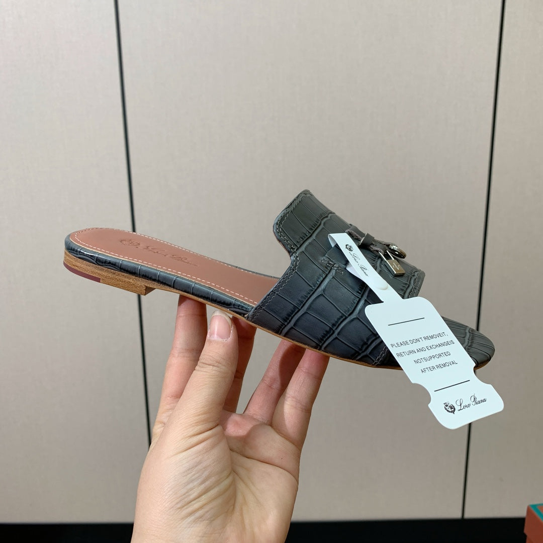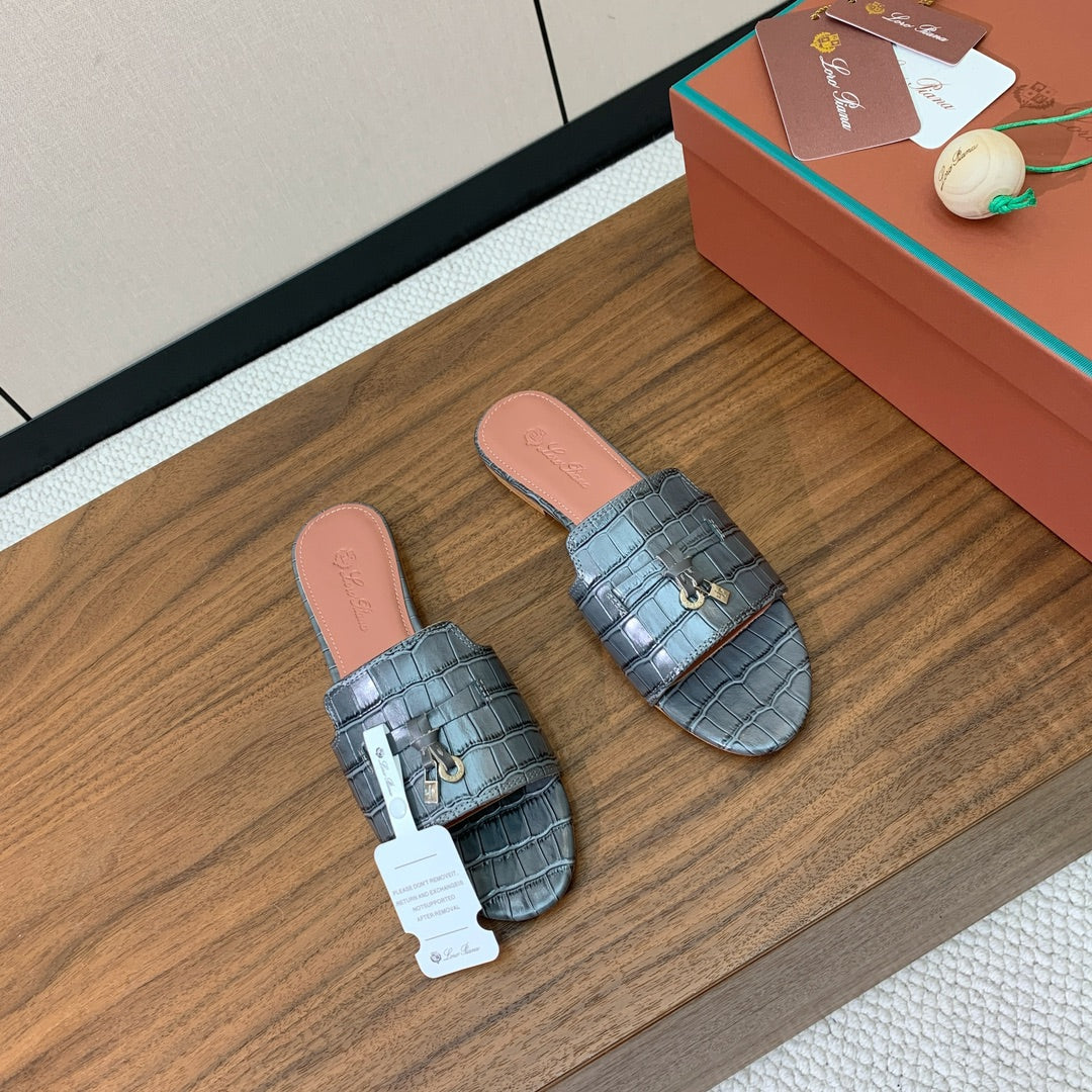 LP OSTRICH-EMBOSSED FLAT SANDALS 25S IN DARK GRAY LAMBSKIN